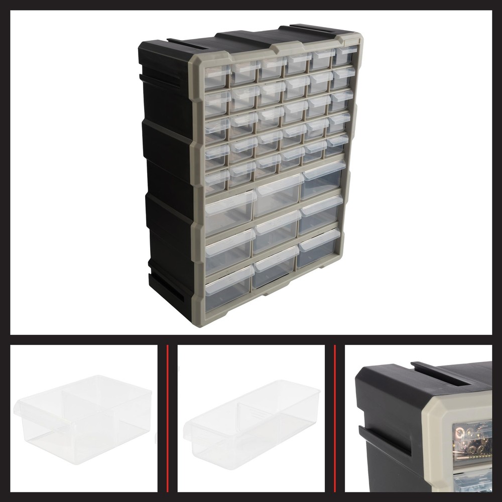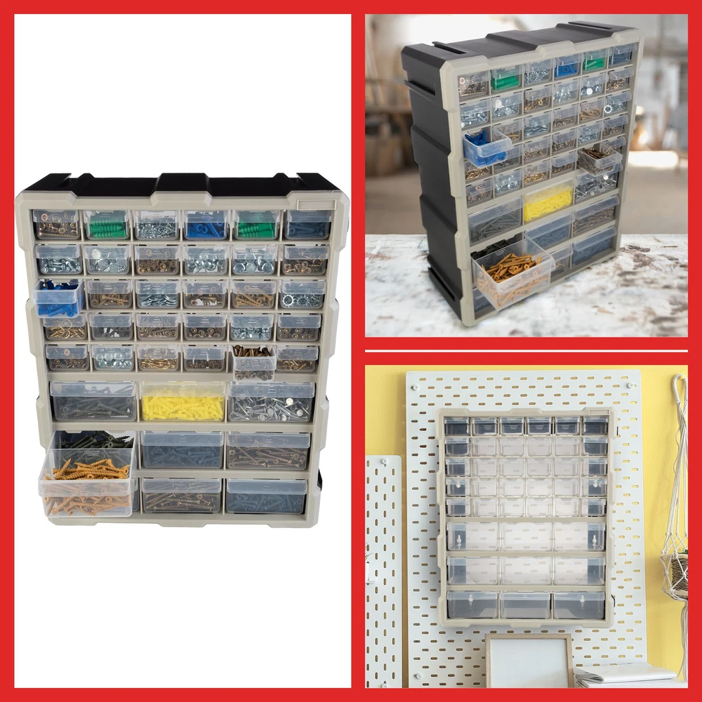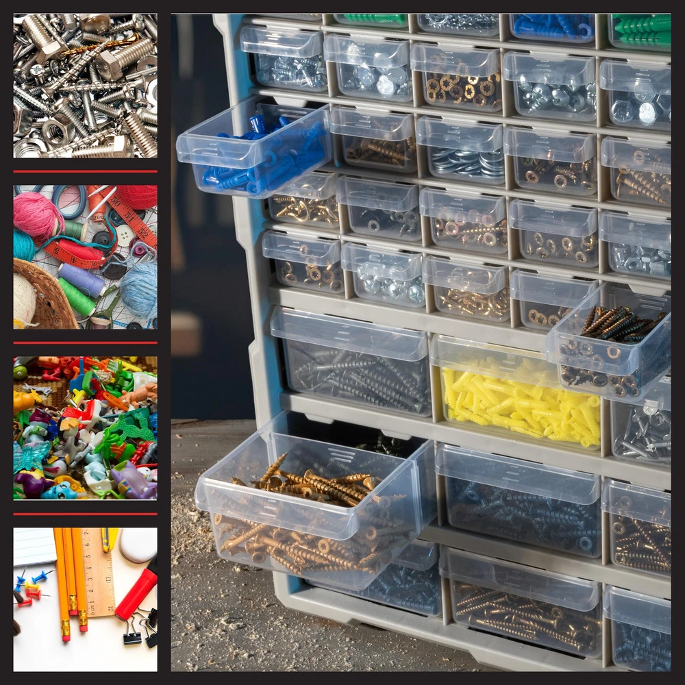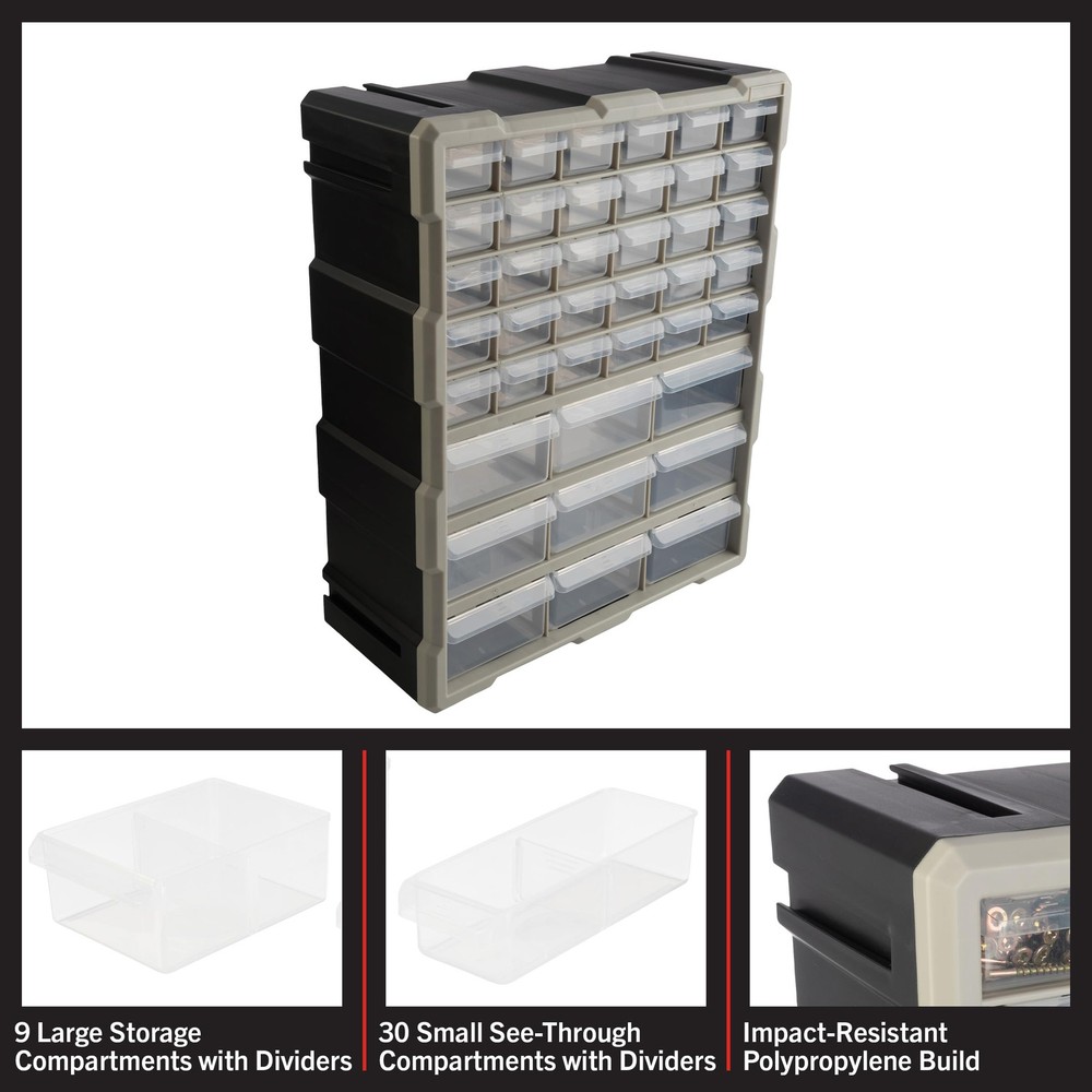 The 39-Drawer Storage Cabinet by is an excellent organization solution for your garage, home, or office. Constructed from strong and durable polypropylene, these garage storage bins are made to last. This screw organizer can be used table-top on a desk or workbench, or wall-mounted thanks to the built-in keyholes on the back of the frame. With 9 large and 30 small storage drawers with dividers, this craft organizer can easily a variety of small parts, including hardware, office supplies, fishing tackle, beads, jewelry making supplies, and more — you can even use it as toy storage for building blocks. , for craft organizers and storage solutions that are SMART, STRONG, and SECURE. IMPORTANT: is committed to providing the consumer with the absolute best price and value on all of our products. NOTE: This is an exclusive product of and ONLY Storage Bins with Drawers by are GUARANTEED to be genuine. Avoid buying counterfeit products and transacting with unauthorized sellers. is a registered trademark protected by U.S. Trademark law and will be vigorously defended. 39-DRAWER GARAGE ORGANIZER - Keep any area neat and tidy with the plastic storage drawers organizer. Use these bins as a hardware organizer for nuts and bolts, for bead storage, as a craft storage cabinet, or even for classroom organization. QUALITY CONSTRUCTION - This small parts storage organizer is made to last, constructed from durable polypropylene that is difficult to damage or break. The clear storage drawers allow you to see their contents, and feature finger pulls for easy opening. TABLETOP OR WALL MOUNTABLE - The craft storage cabinet is portable and can be placed on any desk, table, or work surface, or use the keyholes on the back of the sturdy frame for convenient wall mounting in a closet, classroom, workshop, or shed. VERSATILE USE - With 9 large bins and 30 small drawers, all with removable dividers, the craft storage organizer is ideal for organizing a variety of items from fishing tackle, office supplies, or hardware, to art supplies, beads, or jewelry. PRODUCT DETAILS - Material: Polypropylene. Dimensions: (L) 15" x (W) 6.2" x (H) 18.5"; Small Drawers: (L) 2" x (W) 6" x (H) 1.4"; Large Drawers: (L) 4.2" x (W) 6" x (H) 2.25". 39 Total Drawers; 9 Large and 30 Small. Includes 9 Bin Dividers. Color: Black.