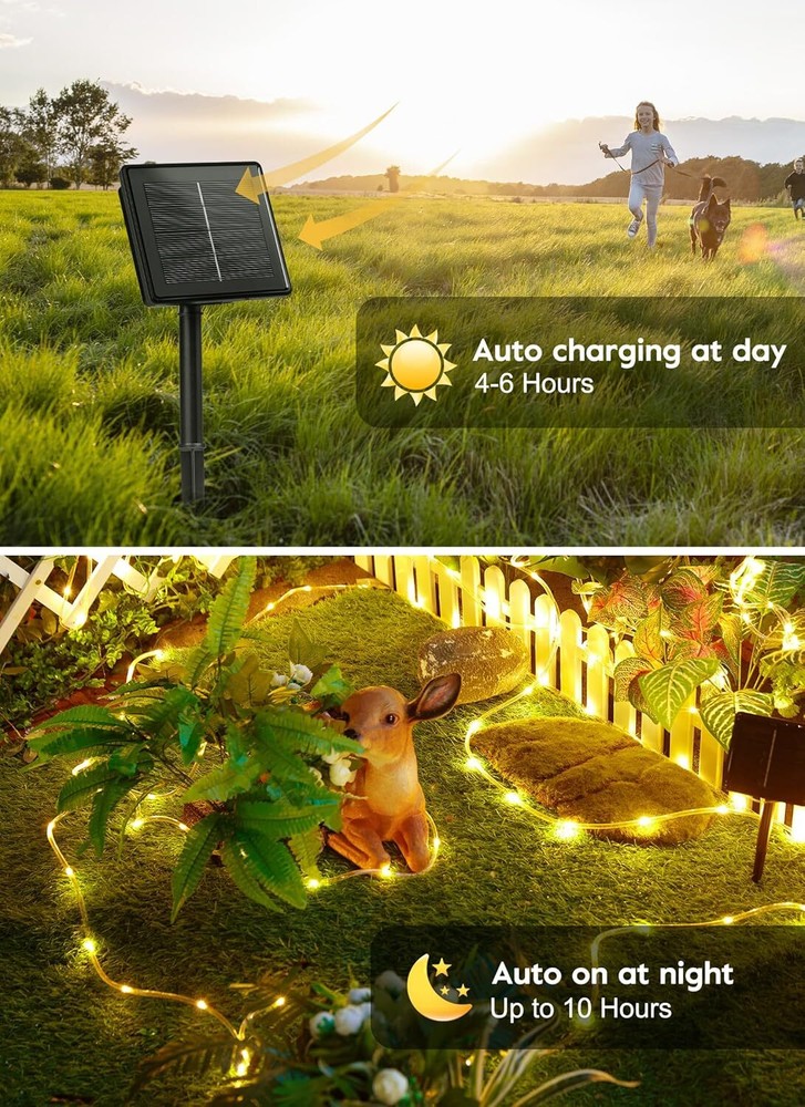 HOME DESIGN WELCOME TO YOUR PERFECT HOME DETAILS PRODUCT DESCRIPTION Paquage Include: 1x(39FT 100LED Fairy String Light Solar Powered with 8 Lighting Modes Warm White) 【Energy Efficient & Eco-Friendly】Our solar lights are equipped with a high quality solar power source that is energy efficient and can save you a significant amount of money on your energy bills. They come with a 1200mAh rechargeable battery that absorbs solar energy during the day and automatically turns on at dusk. With a full charge, these lights can stay illuminated for 8-12 hours, ensuring maximum use of renewable energy and minimal impact on the environment; 【Indoor and Outdoor Applications】These solar rope lights are waterproof, flexible, and long, allowing you to create stunning decor in your garden, home, commercial building, show, hotel, or restaurant. Use them to decorate windows, patios, and more with their sparkling and magical light, perfect for weddings and parties. Enjoy the flexibility of solar power and beautiful design in any setting; 【8 Lighting Modes】Enjoy 8 breathtaking lighting modes that include fireflies flashing, waves, fading, chasing, flashing, fading slowly, twinkle, flashing, and steady-on. Our flexible wires allow you the freedom to build the shapes you desire, wrap them around tree trunks, or gazebos. In the dark, the wire fades to invisibility leaving only dazzling lights that make your home and garden glow with romance and charm. These decorative solar rope string lights are perfect for creating the perfect ambiance; 【Long-lasting & IP65 Waterproof】Our solar outdoor lights are equipped with a high-capacity battery and adjustable solar panel, enabling them to continuously work for 8-12 hours when sufficient sunlight is absorbed during the day. They are also designed with an IP65 waterproof rating, making them ideal for outdoor decoration even in light rain or water spills; 【Efficient Customer Service】We prioritize our customers' satisfaction, providing worry-free 12-month support, lifetime technology assistance, and friendly customer service. Rest assured, please feel free to . More Product Description Widely Used Solar Outdoor Rope Lights These outdoor solar lights are the perfect decoration for terrace, pergola, bistro, backyard, deck, barbecue, umbrella, dinner, birthday, Christmas, New Year party and more. IP65 Waterproof All the components are IP65 waterproof enabled. Hanging it on the trees and flowers of the garden can bring you a variety of visual enjoyment. Item model number SR Light Source Type LED Style Solar rope lights Number of Items 1 Power Source Solar Powered Number of Light Sources 100 Control Method Touch Theme Outdoor, Tree Decoration, Batteries Required? No Seasons All Seasons Package Dimensions 5.12 x 4.49 x 3.43 inches Included Components 1 x Solar Panel, 1200mAh rechargeable battery, 20 x LED Lights Indoor/Outdoor Usage Outdoor, Indoor Light Color Warm White Water Resistance Level Waterproof Item Weight 9.9 ounces Occasion Wedding, Holiday, Birthday, Party, Garden, Yard Special Features Energy Efficient, Twinkling, Timer, Waterproof, Corded Special Feature Energy Efficient, Twinkling, Timer, Waterproof, Corded Bulb Base GX6.35 Color Temperature 3E+3 Kelvin Color Warm White Wattage 1.2 watts Size 100 LED 4.49 inches x 5.12 inches x 3.43 inches. Weight: 9.9 oz Payment We accept all payments via Ebay using Credit Cards , PAYPAL , Apple Pay and many others Shipping We are always working hard to ensure your package arrives as soon as possible. Please understand that some factors like weather, high postal traffic, and the performance of shipping companies are outside of our control. DELIVERY & RETURN POLICY We offer a 30-Day Return Policy on items in which you are not completely satisfied with. You have the option of a full-refund or an exchange of the item. No returns are available on items shipped outside of the USA.