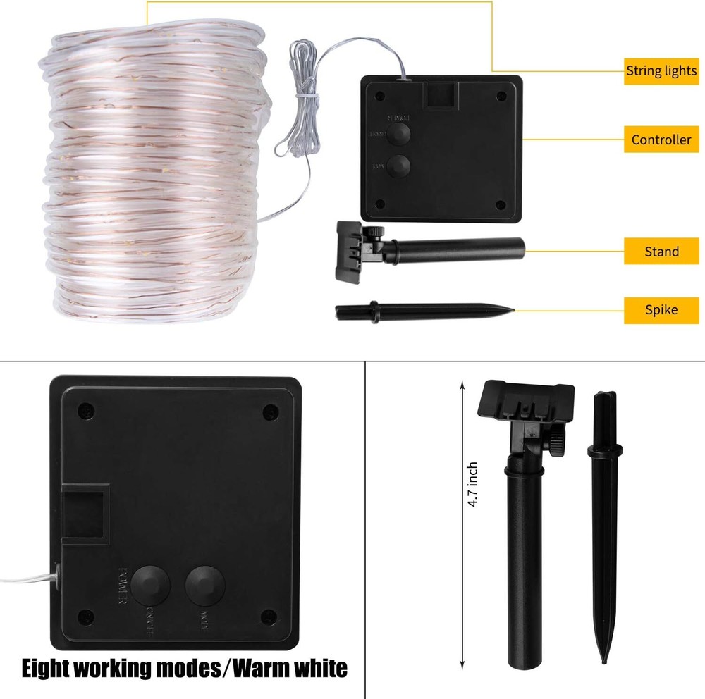 Brand: Does not apply Water Resistance Level: Waterproof Light Color: Warm White Occasion: Wedding, Holiday, Birthday, Party, Garden, Yard Control Method: Touch Size: 100 LED Color Temperature: 3E+3 Kelvin Power Source: Solar Powered Batteries Required?: No Item model number: SR Style: Solar rope lights Included Components: 1 x Solar Panel, 1200mAh rechargeable battery, 20 x LED Lights Package Dimensions: 5.12 x 4.49 x 3.43 inches Type: Does not apply Number of Items: 1 Item Weight: 9.9 ounces Theme: Outdoor, Tree Decoration, Special Feature: Energy Efficient, Twinkling, Timer, Waterproof, Corded UPC: 313047048066 Indoor/Outdoor Usage: Outdoor, Indoor Bulb Base: GX6.35 Seasons: All Seasons Special Features: Energy Efficient, Twinkling, Timer, Waterproof, Corded Wattage: 1.2 watts Color: Warm White Light Source Type: LED Number of Light Sources: 100 gtin13: 313047048066
