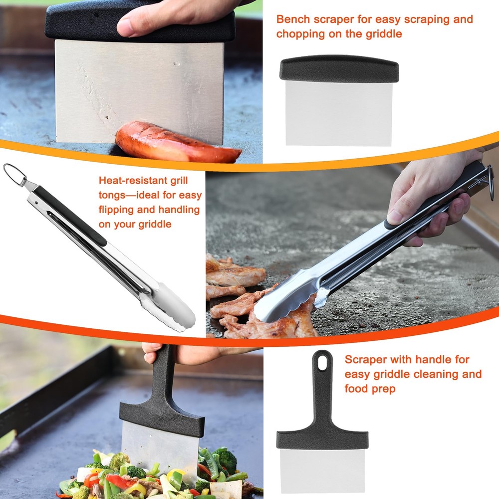 blackstone griddle accessories Complete Blackstone Griddle Accessories Set: 39-piece kit featuring essential griddle tools including oversized spatulas, burger turner, melting dome, burger press, grill tongs, fork, sauce brush, scrapers, squeeze bottles, egg rings, spice shakers, silicone glove, scouring pad with handle, corn holders, and hanging hooks Durable & Easy to Clean: Crafted from high-quality stainless steel with heat-resistant, non-slip ABS handles; these Blackstone accessories are built for durability and are dishwasher safe for effortless cleaning Versatile Griddle Tools: Perfect for Blackstone griddles and other brands; ideal for flipping burgers, pancakes, veggies, and more; a comprehensive addition to your griddle accessories kit Perfect Gift Choice: Packaged in an elegant box, making this griddle accessories kit an excellent gift for birthdays, weddings, Father's Day, or Christmas; ideal for any griddle enthusiast Professional-Grade Flat Top Grill Accessories: Designed for top performance in griddle and flat top grill cooking; provides all necessary tools for a superior cooking experience