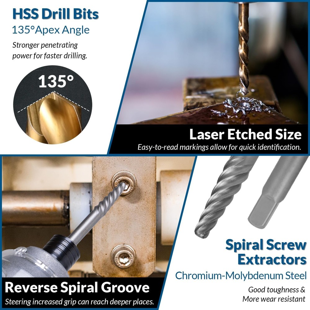 Introducing our ultimate solution for effortless extraction: the 39pc bolt extractor kit. With this versatile toolkit at your disposal, you'll conquer any extraction challenge with ease. Our comprehensive screw extractor kit includes extractor bits for removing peeling bolts, broken nuts, round screws, and frozen lug nuts, ensuring you're always prepared for any maintenance task. Crafted from high-hardness chrome-molybdenum steel and high-speed steel, our broken bolt extractor kit deliver unbeatable durability, double the hardness of traditional bolt extractor set. The reverse spiral groove design provides maximum grip force, while the surface titanium nitride coating prevents corrosion and rust, extending the extractor drill bits' service life. Plus, our bolt screw extractor features a 2-in-1 function with a 3/8 inch drive for direct connection with a wrench, eliminating the need for a socket. Whether you're working on cars, bikes, boats, trucks, or SUVs, our stripped bolt remover is your reliable partner for quick and efficient extraction. With additional left-handed design and versatile accessories, including drill bits and nut removers, our left hand drill bits offers unmatched versatility and convenience. Keep all your extractors organized on-the-go with the compact, heavy-duty blow mold case, ensuring you're always ready to tackle any project. Upgrade your toolkit today and experience the difference with stripped screw remover. π End Your Frustration with Stubborn Fasteners: Don't let stripped or damaged fasteners hold you back. Upgrade to the Damaged Screw Extractor Set & Bolt Extractor Set and conquer every extraction challenge with ease π Extensive Size Range: Unlike traditional sets that offer limited sizes, our comprehensive range covers from 2mm to 21mm, providing you with the perfect extractor for various applications. No more struggling with damaged, frozen, rusted, or rounded-off bolts, nuts, and screws! π Superior Durability: Crafted from high hardness chrome-molybdenum steel and high-speed steel 6542 with a maximum Rockwell hardness of 68 HRC, our extractors deliver unbeatable durability. With double the hardness of HSS 4341, they are built to handle the toughest jobs!s deliver unbeatable durability. π Versatile Accessories: Your toolkit includes 13 pcs mumlti-spline bolt extractor,10 pcs hex head mumlti-spline extractor set,10 pcs left-hand cobalt drill bits,5 pcs easy out screw extractor set and 1left-hand cobalt drill bits. π Organized On-the-Go: Keep all the extractors neat and tidy with the compact, heavy-duty blow mold case. It's designed for convenient storage and portability, so you can take your set anywhere you need it.