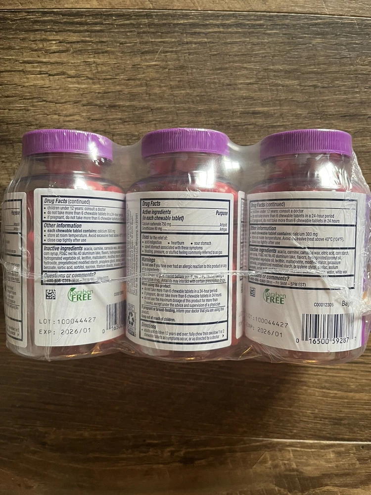 Brand: Alka-Seltzer Ingredients: See Pictures Main Purpose: Heartburn-Relief, Acid Indigestion Intestinal Pain Gas Relief Expiration Date: 03/2026 Active Ingredients: Calcium Carbonate, Simethicone Department: Adult Country/Region of Manufacture: United States Size: Family Size Administration: Oral Product Line: Bayer gtin13: 016500592877 LOT Number: 100032769 MPN: 59287 Type: Heartburn Treatment Labels & Certifications: Drug Facts Label UPC: 016500592877 Formulation: Chews Body Area: Stomach Features: Paraben Free, Heartburn and Gas Relief, Chewable Dosage: See Pictures Number of Pills: 60
