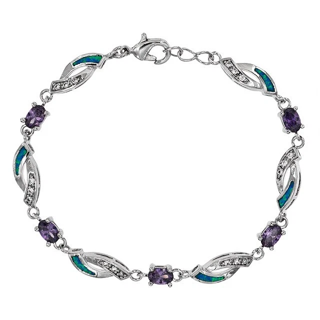 Material: Gemstone Occasion: Anniversary/Engagement/Birthday/Confirmation/Communion Features: Nickel-Free Diamond Color Grade: Not Applicable Base Metal: Sterling Silver, 925 parts per 1000 Item Length: 6 in Country of Origin: Thailand Type: Bracelet Total Carat Weight: 3 Diamond Clarity Grade: Not Applicable Color: Blue Gemstone Clarity Grade: Eye Clean Length: Not Applicable Main Stone: Amethyst Number of Gemstones: Not Applicable Setting Style: Prong Colored Diamond Intensity: Not Applicable Main Stone Color: Purple Metal: Sterling Silver Secondary Stone: Opal Main Stone Treatment: Not Enhanced Metal Purity: 925 parts per 1000 Number of Diamonds: Not Applicable Theme: Mixed Theme Cut Grade: Excellent Brand: Handmade Style: Tennis Country/Region of Manufacture: Thailand Chain Type: Not Applicable Main Stone Shape: Oval