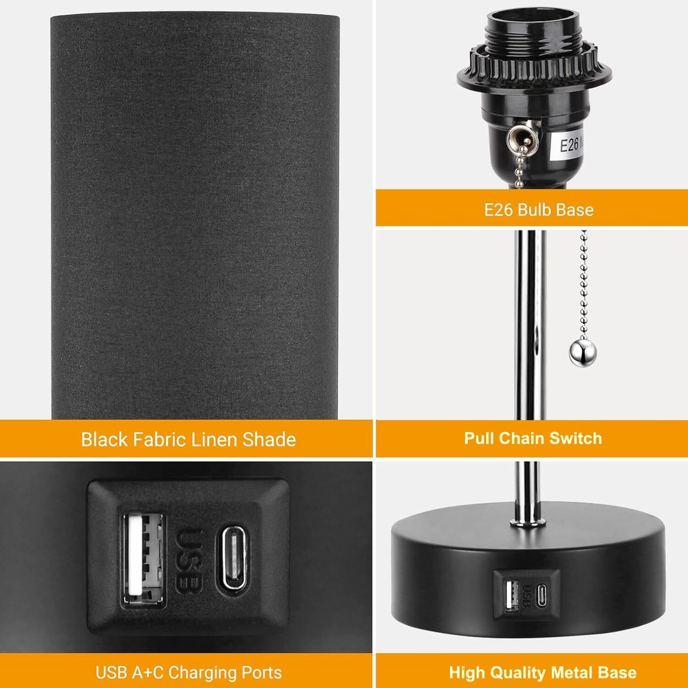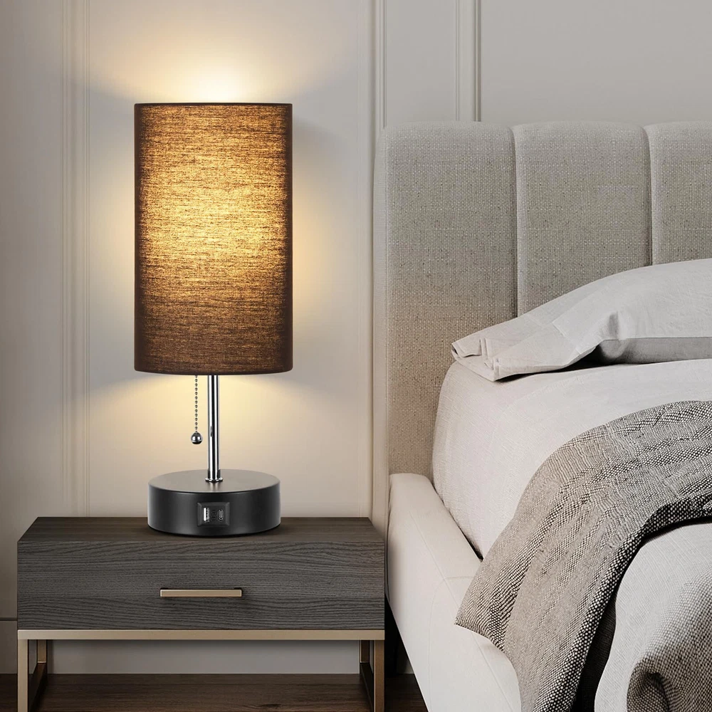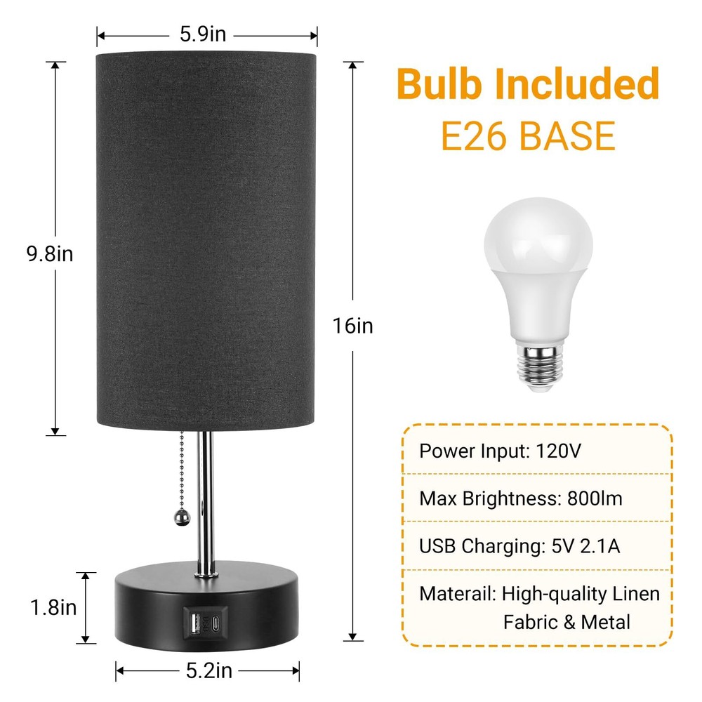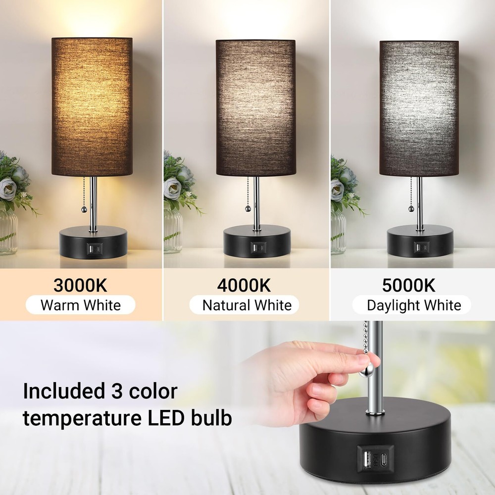 【3-Color Temperature Bedroom Lamp】The small desk lamp comes with a 9W LED light bulb, it has 3 color temperature modes (3000K/4000K/5000K) which can meet your different needs in different scenarios. You can change the light by pulling the chain. Different Modes creates a different atmosphere. 【USB A&C Fast Charging Ports 】The modern table lamp for bedroom euipped with USB A and C charging ports (5V/2.1A) for fast charging, getting your phones, humidifier, kindle, headsets, speaker and other electronics fully charged. And what the greatest advantage of our nursery lamp is that whether the lamp is on or off, these charging ports can still keep working. 【Free LED Bulb Included】 For your convenience, there is one free bulb in the package to save you from the trouble of purchasing bulb. The light bulb emits 3000K/4000K/5000K 800LM light with only 9 watts consumption, which is super energy-saving and environmentally friendly, greatly saves you electricity bills. What's most important is that the bulb has no flicker, no dizziness, and can protect your eyes efficiently. 【Minimalist Design for Home】 The USB table lamp with the minimalist design, makes it be a perfect addition to your home.The fabric shade and black metal base is perfect to decorate anywhere at your house. It's a great choice to take this night stand lamp as a gift for your friends, family. A perfect bed side lamp for living room, bedroom, study room, kids room, den, nursery. 【Eye Protection Glow】The gray lampshade is stylish and durable, and also it can soft the light radiation to protect your eyes and give your bedroom a soft tone. Our small table Lamp cteates a nice and comforting feeling in the house when spending time with your family as the linen fabric shade softens the light making it better for protecting your eyes.