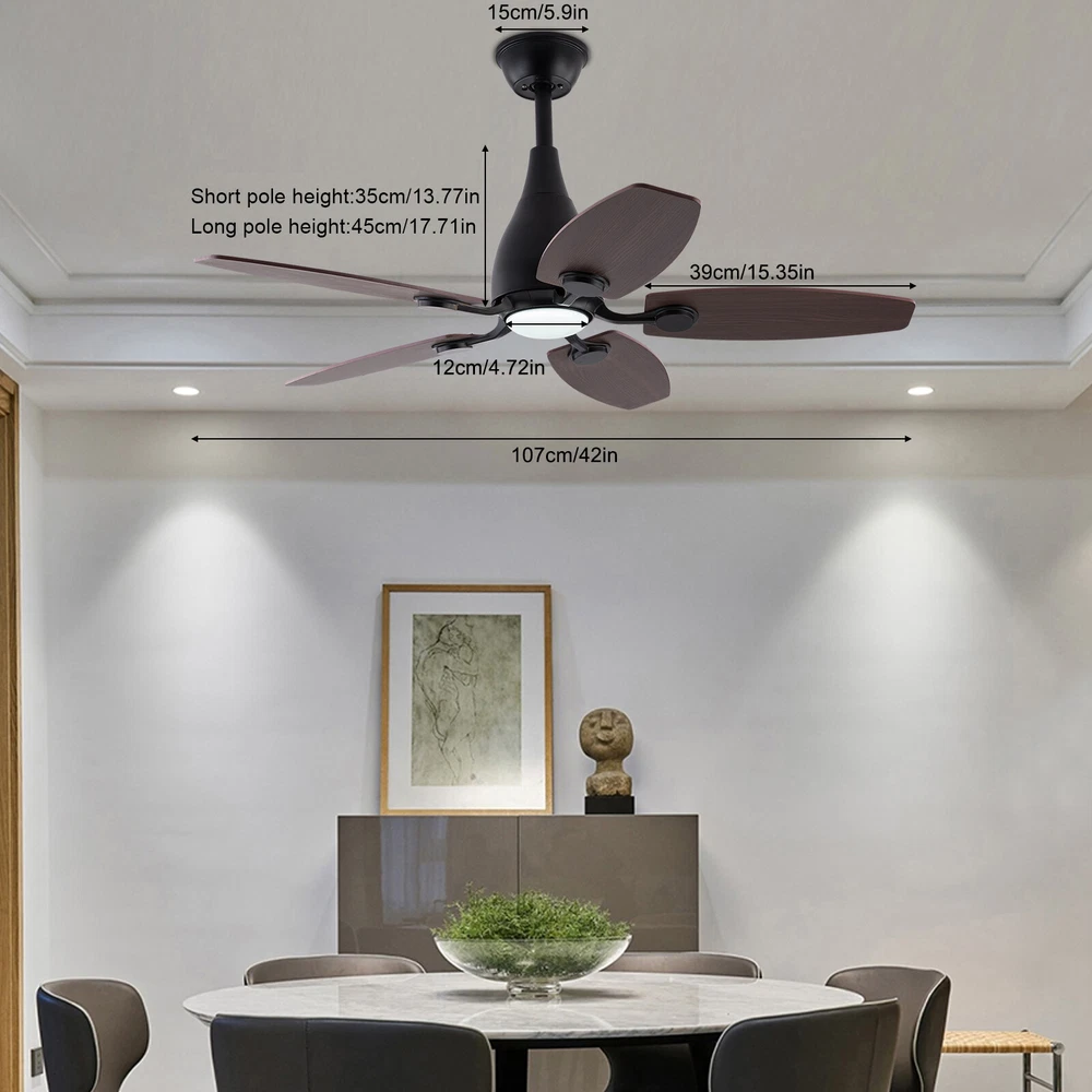 3-Color Ceiling Fan Light With LED Light Ceiling Fan With Remote Control Timing Description Fan or chandelier? This is too difficult to make a decision. Now, you don't have to choose because our ceiling fan light has combined the two. The combination of high-quality materials and exquisite craftsmanship makes it sturdy and durable. Fan speed and time-setting can be easily adjusted by remote control, providing you with a smarter and more convenient life. With its stylish appearance, it can better decorate your room! Key Features Sturdy and Durable: The iron with a painting process makes it sturdy and resistant to impact, deformation, corrosion, and rust, ensuring an extended service life. Excellent Light Source: The environment-friendly and energy-saving LED light with variable light colors ( warm, cold, neutral ) and color temperature ( 3000-4500-6000K ) can effectively avoid glare and stroboscopic, protect your eyes, restore the most authentic color of objects, and meet your different needs. Two-way Rotation: The normal mode of the fan can bring coolness in summer. You can also reverse the direction of the fan in winter, blowing hot air from the top into the room and increasing the indoor temperature. Healthy and Energy-saving: The ceiling fan light provides more comprehensive air circulation and cooling, thereby reducing the frequency and time of air conditioning use, saving energy, and reducing expenses. It can avoid direct blowing and reduce the risk of air conditioning diseases. Low Noise: The pure copper motor makes the product operate at a noise level of approximately 35dB, which is as quiet as a soft-speaking voice. This allows you to enjoy a peaceful and quiet environment. Smart Control: You can set the timing function(1/2/4/8H) to have a comfortable sleeping environment and the 6-speed wind speed to experience the refreshing breeze or strong coolness through the convenient remote control, simplifying your daily routine and enhancing your overall living experience. Multiple Functions: This item integrates lighting and a fan, illuminating the space while balancing room temperature, and meeting your usage needs. Ideal Gift: With its beautiful appearance and powerful functions, you can give it as a housewarming or holiday gift to your friends, family, or colleagues. Easy to Clean: Thanks to the simple structure and smooth surface, you can easily wipe it clean with a rag. High Applicability: The wide voltage range of 85-265V can adapt to the voltage needs of most households, so you can use it with confidence . Details Stable Base: The 5.9" thickened and enlarged base ensures stronger load-bearing capacity and stability. Closed Shade: The closed shade effectively prevents impurities, etc. from entering and its high light transmission provides good lighting for your house. Upgraded Blades: 5 fan blades adopt an aerodynamic design, providing a stable and powerful air supply with low noise. Selectable Suspension Rods: The 3.93" and 7.87" suspension rods provide you with the flexibility to install this ceiling fan light according to your needs. Application With a lighting area of 107.64-161.46ft². It is ideal for the living room, dining room, hotel, club, restaurant, kitchen, study, bedroom, meeting room, etc. Specification Material: Iron Process: Painting Color: Black , Dark Brown Style: Modern Shape: Round Motor Type: Pure Copper Motor Indoor/Outdoor Usage: Indoor Mount Type: Ceiling Mount Control Mode: Remote Control Number of Fan Blades: 5 Light Color: Neutral, Cold, Warm Light Efficiency: E Light Source: LED(Included) Voltage: 85-265V Power: 45W Noise: 35dB Timing: 1/2/4/8H Number of Gears: 6 Battery Type: 2 * AAA Batteries(Included) Remote Control Distance: 3-5m/9.84-16.4ft Color Temperature: 3000K, 4500K, 6000K Lighting Area: 10-15m²/ 107.64-161.46ft² Pole Length: 10cm/3.93in or 20cm/7.87in Lampshade Diameter: 12cm/4.72in Fan Blade Length: 39cm/15.35in Base Diameter: 15cm/5.9in Product Overall Diameter: 107cm/42in Product Overall Height: 35cm/13.77in or 45cm/17.71in Package Included 1* Ceiling Fan Light 1* Remote Control 1* English Manual Other Accessories for Assembly Notes Please make sure that the size of the ceiling fan matches your room and carefully make a choice. Please make sure the power is cut off before installation and when you clean the light. The surface of the product and the electric wire should avoid scratching when mounting, and electric insulation gloves(not included) must be worn when installing. To ensure your safety, professional ones with an electric license are recommended to carry out the installation if possible. Please read the English manual carefully before use, and pay special attention to the safety tips inside. Please do not bend the blades when calibrating and cleaning the fan. Please allow the slight color difference caused by the shooting light and 1-3cm error due to manual measurement, and make sure you do not mind before ordering. Payment Delivery details Terms of sales About us Contact us Payment We accept ebay payment 。 Fees such as import duties, taxes are not included in the item price or shipping costs. These charges are the buyer's responsibility. Delivery details Shipping: 2-9 working days to: USA Terms of sales We maintain high standards of excellence and strive for hundred percent customer satisfaction. Feedback is very important to us. We hope that you contact us immediately before you give neutral or negative feedback, so that we can address your concerns. It is impossible to address issues if we do not know about them! About us Your satis faction is our ultimate goal. We work hard to earn your trust and future business. Our certified technicians have tested each item before shipping. The unit comes with 1 year limited warranty on all manufacturing defects. a) If you receive a defective item, you may return it or ask for a discount. Please contact us within 14 days after you receive the package. b) What you returned must be inta