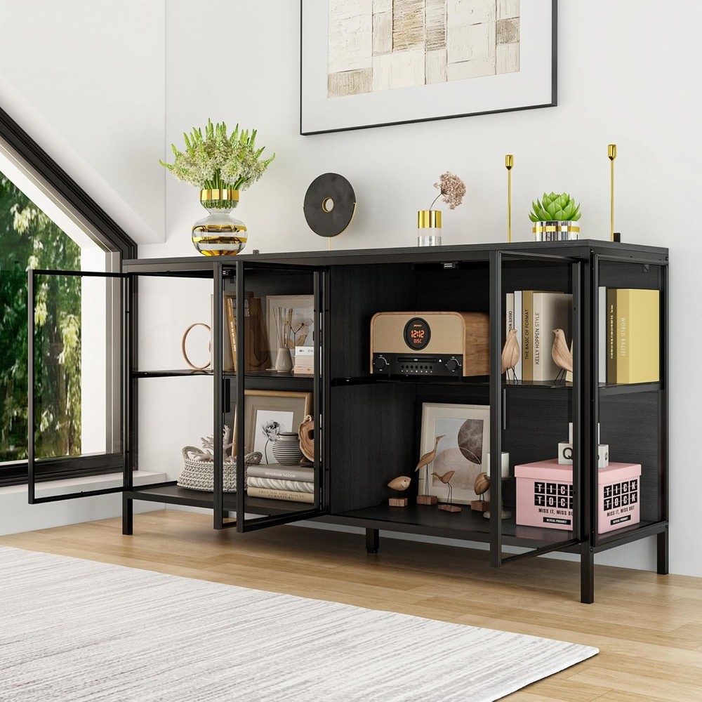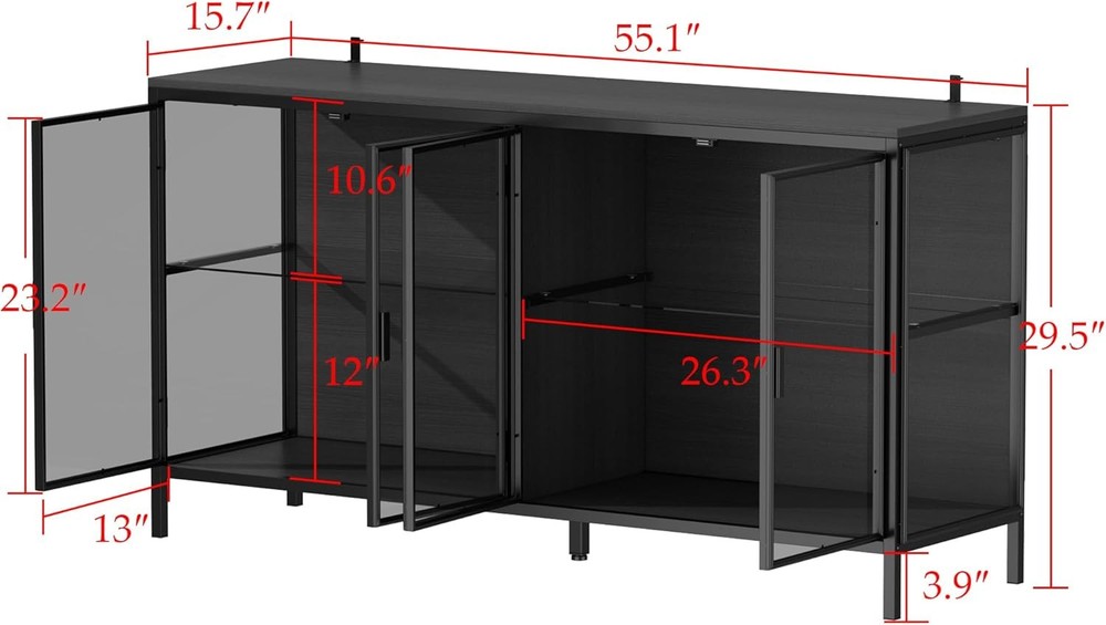 Product Description About this item • [Storage Cabinet with LED Light] - Homsee black storage cabinte with glass doors features switch control LED lights, 3 colors adjustable: warm yellow, natural and cool white. The storage shelves are glass, the high-definition glass shelves presenting your collection perfectly, making it visible even from a distance. • [Sturdy & Durable] - This storage display cabinet is crafted from engineered MDF board, iron and glass. The thick metal frames and top panel is sleek and easy cleaning, the sturdy legs offer reliable support. The glass shelves can hold weight up to 22 lbs, the top can hold up to 33 lbs. • [Large Capacity] - Overall sizes: 55.1”W x 15.7”D x 29.5”H. Total 4 storage compartments, each compartment: 26.6”W x 15”D. This sideboard cabinet with lights is luxury with sleek surface and durable materials. Black panels, transparent glass doors and metal framed doors are creating luxury charming. • [Versatile Storage Cabinet] - This black cabinet is suitable for many occasions, like entryway, hallway, living room, kitchen, dining room and office. Also you can treat it as sideboard cabinet, cupboard cabinet, accent cabinet, bar cabinet, curio & display cabinet, console table and so on. • [Assembly Required] - This buffet cabinet with storage is easy to assemble, you just need to follow the instruction manual to easily assemble a complete chest of drawers, feel free to tell us your problem. Storage Cabinet with 3-Color LED Lights, Glass Shelves & 4 Compartments, Sideboard Buffet Cabinet with Solid Metal Legs, Modern Display Cabinet for Living Room Dining Room, Black. Homsee black storage cabinte with glass doors features switch control LED lights, 3 colors adjustable: warm yellow, natural and cool white. The storage shelves are glass shelves, the high-definition glass shelf presents your collection perfectly, making it visible even from a distance. On Aug 11, 2025 at 02:49:27 PDT, seller added the following information: