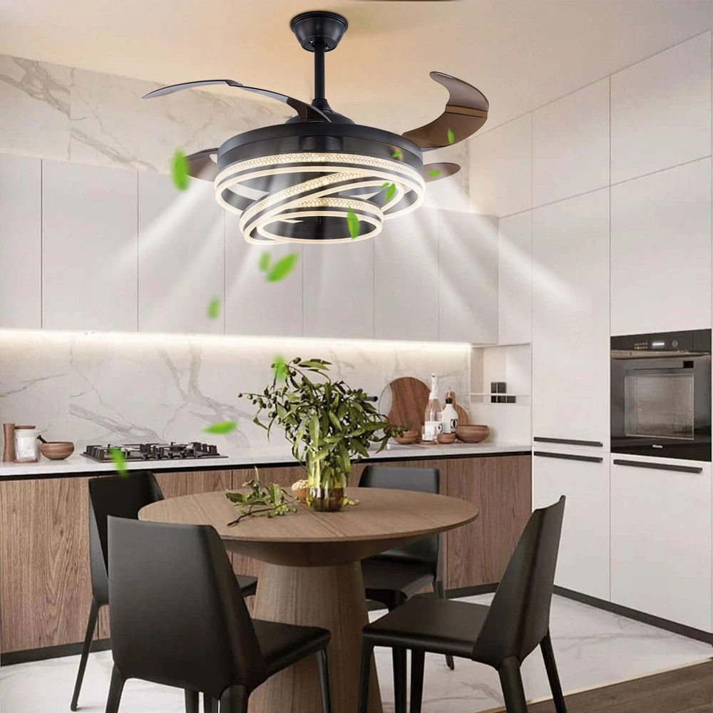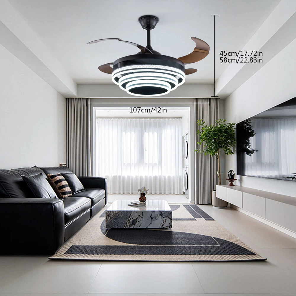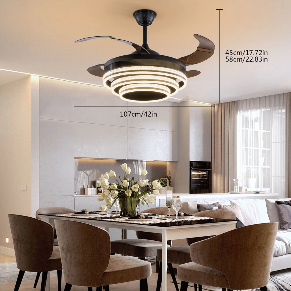 Specification Color: Black Material: Aluminum, Hardware, Iron, Acrylic Surface Treatment: Paint Baking and Electroplating Style: Modern Shape: Round Light Source Type: LED Color of Light: White Light(3000k), Warm Light(4500k), Neutral Light(6300k) Power: 18W Voltage: 110-240V Efficiency: E Luminous Flux: 1800 Lumen Number of Items: 1 Number of Speeds: 6 Timing Range: 1/2/4h Assembly Required: Yes Mount Type: Ceiling-mounted Product Diamter: 107cm/42inch Product Height: 45cm/17.72inch, 58cm/22.83inch Rod Length: 12cm/4.8inch, 25cm/9.8inch First-tier Lampshade Diameter: 30cm/11.82inch Second-tier Lampshade Diameter: 40cm/15.7inch Third-tier Lampshade Diameter: 50cm/19.68inch Base Diameter: 15cm/5.9inch Applicable Area: 20-25m²/215.28-269.1ft² 3-Color Modern LED Lamp Smart LED Ceiling Fan Light 6 Speeds Timing Range 1/2/4h Welcome~ Description Bright and soft lights can bring charm and warmth to your room, and let you experience a simple but elegant lifestyle. Our ceiling fan light with six speeds and three colors is made of premium aluminum, hardware, iron, and acrylic, and adopts exquisite paint baking, and electroplating technologies, making it beautiful and durable. No matter in day or night, it will be beautiful scenery in your home. Key Features Build to Last: High-quality aluminum, hardware, iron, acrylic, paint baking, and electroplating processes make the product durable, stereoscopic, and solid, so it can better keep practical and beautiful. Excellent Source: The LED light source with a luminous flux of 1800lumen and three colors (white light(3000K), warm light(4500K), and neutral light(6300K)) not only is non-stroboscopic and eye-friendly but also provides you more natural and bright light. Safety Guard: The ground wire connection mode that can quickly lead the current to the ground so that the equipment shell no longer carries electricity, cooling holes, and wide voltage(110-240V) can ensure the safety of you and the light. Comfortable and Convenient: 18W pure copper variable frequency motor with less energy consumption, noise less than 65 decibels, 2-in-1 function (lighting+fan), switchable lights, 6 wind speed, timing function (1/2/4h), and intelligent remote control can bring you more comfortable and convenient experience. Careful Design: The product can be turned forward in summer to meet the cooling demand, and reversed in winter to promote air circulation. In addition, the fan and lamp can be used together or separately, with high-cost performance. Attractive Appearance: The timeless black, smooth lines, and three different colors make the product modern and fashionable and your rooms with various decorative styles luxurious and beautiful. Ideal Gift: With a fashionable appearance, this item can be regarded as a holiday or housewarming gift for parents, friends, and lovers so that they can enjoy a more convenient and emotional life. Effortless Cleaning: The smooth surface and simple structure make it convenient for you to clean with a towel. Details Sturdy Base: The 5.9-inch base increases the stress area, making the product more stable and not easy to fall. Practical Lampshade: It can not only make the light bright but also prevent dust from entering the interior to reduce the cleaning difficulty. Retractable Fan Blades: These wear-resistant blades can not only save space but also have a wide air supply area. Two Rods: Two rods of different sizes (4.8inch, 9.8inch) provide more convenience and flexibility for your installation and use. Application This item is suitable for an area of 215.28-269.1ft² indoors, such as halls, entryways, hallways, foyers, restaurants, studios, double rooms, children’s rooms, bedrooms, exhibition halls, clothing stores, coffee shops, bars, nurseries, shops, play areas, attics, gyms, examination rooms, farmhouses, and other places that require air circulation. It is suitable for installation on the ceiling about 7.55ft from the ground. Specification Color: Black Material: Aluminum, Hardware, Iron, Acrylic Surface Treatment: Paint Baking and Electroplating Style: Modern Shape: Round Light Source Type: LED Color of Light: White Light(3000k), Warm Light(4500k), Neutral Light(6300k) Power: 18W Voltage: 110-240V Efficiency: E Luminous Flux: 1800 Lumen Number of Items: 1 Number of Speeds: 6 Timing Range: 1/2/4h Assembly Required: Yes Mount Type: Ceiling-mounted Product Diamter: 107cm/42inch Product Height: 45cm/17.72inch, 58cm/22.83inch Rod Length: 12cm/4.8inch, 25cm/9.8inch First-tier Lampshade Diameter: 30cm/11.82inch Second-tier Lampshade Diameter: 40cm/15.7inch Third-tier Lampshade Diameter: 50cm/19.68inch Base Diameter: 15cm/5.9inch Applicable Area: 20-25m²/215.28-269.1ft² Battery Type(Not Included): 2*AA Batteries Remote Control Use Range: Within 50m/164.04ft Suitable Height: 2.3m/7.55ft Volume: Less than 65dB Package Included 1* Ceiling Fan Light 1* Remote Control 1* English Manual All Accessories for Installation Notes Please use and install it in strict accordance with the instructions, and pay attention to the safety precautions inside. Please ensure that the power supply has been cut off and tested before installation. Please install it by someone with an electrical license if necessary, and we recommend two people install it together. Please note that the battery of remote control is not included in the package, and you need to prepare 2 AA batteries. Please note that this product does not support step-less color adjustment temperature, and does not have a memory function. Please note that the effective use range of the remote control is within 50m/164.04ft. Please allow the slight color difference caused by the shooting light and 1-3cm error due to manual measurement, and make sure you do not mind before ordering. Welcome to Rongorange Any problem Please Contact the Seller! Payment Delivery details Terms of sales About us Contact us Payment We accept ebay payment 。 Fees such as import duties, taxes are not included in the item p