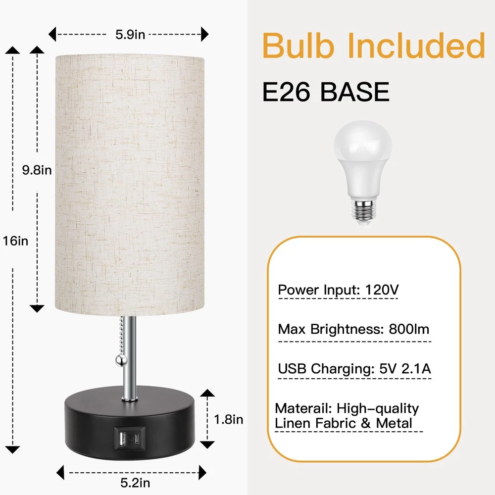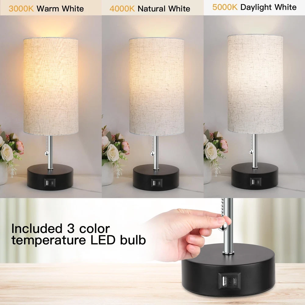 【3-Color Temperature Bedroom Lamp】The small desk lamp comes with a 9W LED light bulb, it has 3 color temperature modes (3000K/4000K/5000K) which can meet your different needs in different scenarios. You can change the light by pulling the chain. Different Modes creates a different atmosphere. 【USB A&C Fast Charging Ports 】The modern table lamp for bedroom euipped with USB A and C charging ports (5V/2.1A) for fast charging, getting your phones, humidifier, kindle, headsets, speaker and other electronics fully charged. And what the greatest advantage of our nursery lamp is that whether the lamp is on or off, these charging ports can still keep working. 【Free LED Bulb Included】 For your convenience, there is free bulb in the package to save you from the trouble of purchasing bulb. The light bulb emits 3000K/4000K/5000K 800LM light with only 9 watts consumption, which is super energy-saving and environmentally friendly, greatly saves you electricity bills. What's most important is that the bulb has no flicker, no dizziness, and can protect your eyes efficiently. 【Minimalist Design for Home】 The USB table lamp with the minimalist design, makes it be a perfect addition to your home.The fabric shade and black metal base is perfect to decorate anywhere at your house. It's a great choice to take this night stand lamp as a gift for your friends, family. A perfect bed side lamp for living room, bedroom, study room, room, den, nursery. 【Eye Protection Glow】The gray lampshade is stylish and sturdy, and also it can soft the light radiation to protect your eyes and give your bedroom a soft tone. Our small table Lamp cteates a nice and comforting feeling in the house when spending time with your family as the linen fabric shade softens the light making it better for protecting your eyes.