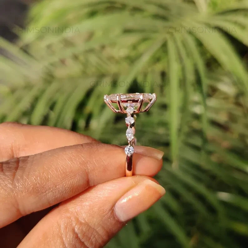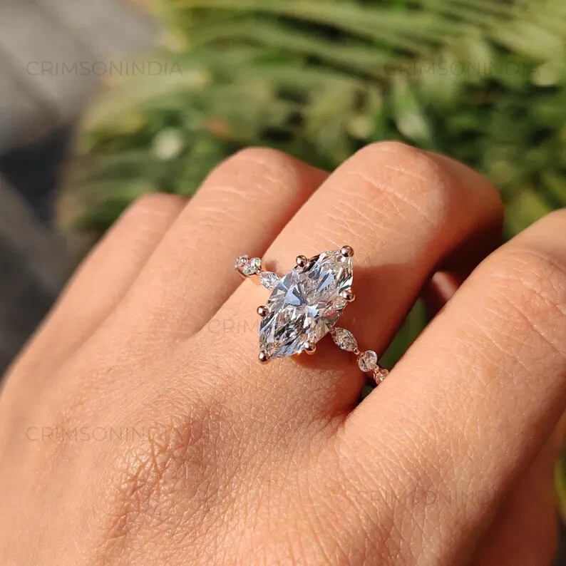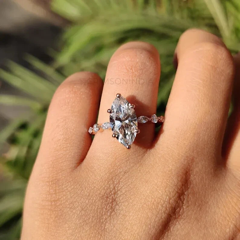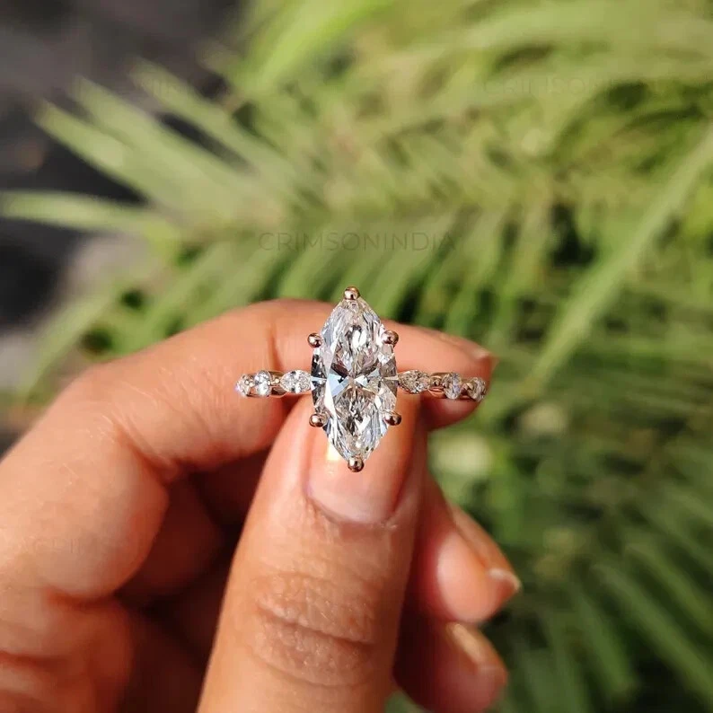 Crafted for elegance and endurance, this exquisite 3Ct Marquise Cut Natural Moissanite Women's Wedding Ring dazzles in 14k Yellow Gold Plating. The central focus is the brilliant white marquise-cut moissanite, boasting VVS1 clarity and an excellent cut grade that ensures maximum sparkle. With a total carat weight of 3 carats, this ring delivers a balance of luxury and refined taste. The ring's design features a prong setting that securely holds the moissanite in place, while the gold plating adds a touch of classic charm. Available in all ring sizes, this piece is a perfect choice for anniversaries, special occasions, or a timeless addition to any jewelry collection. Personalization options are available to ensure this ring is as unique as your love story.