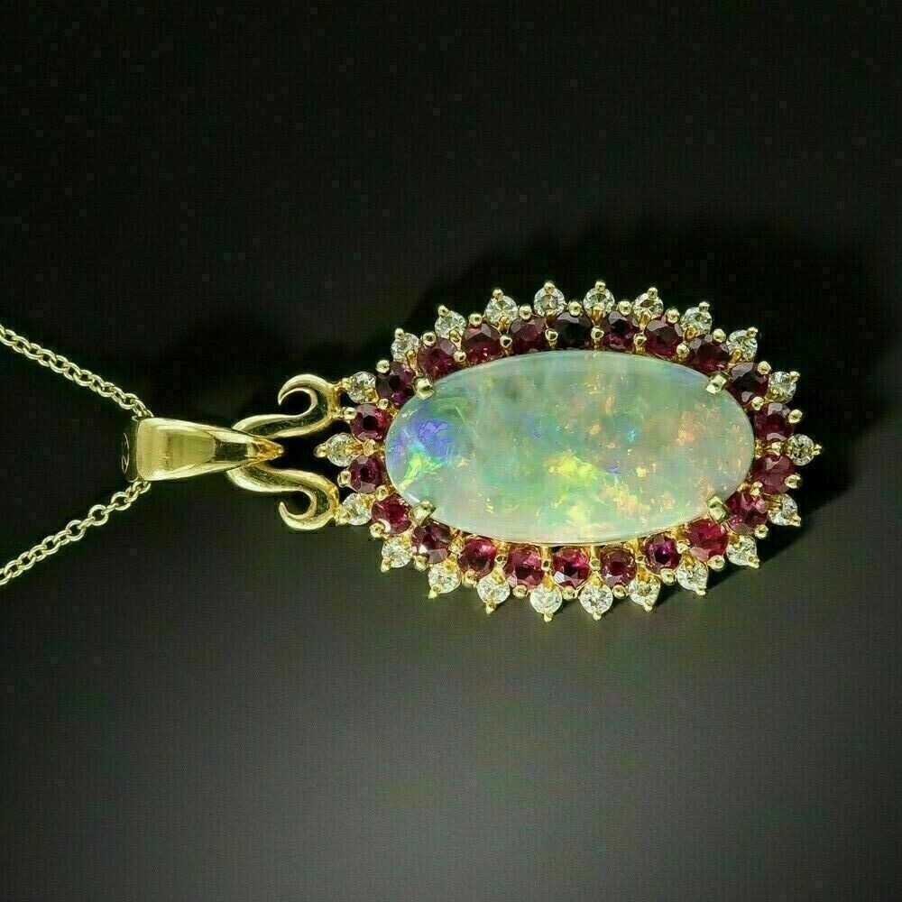 3Ct Oval Fire Opal & Red Ruby Halo Pendant with 14K Yellow Gold Chain