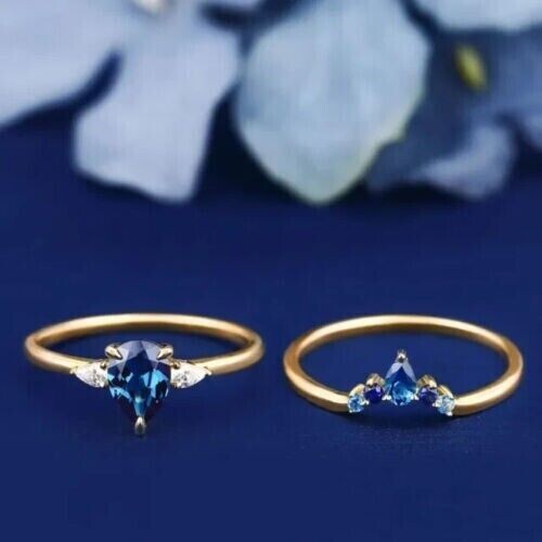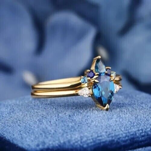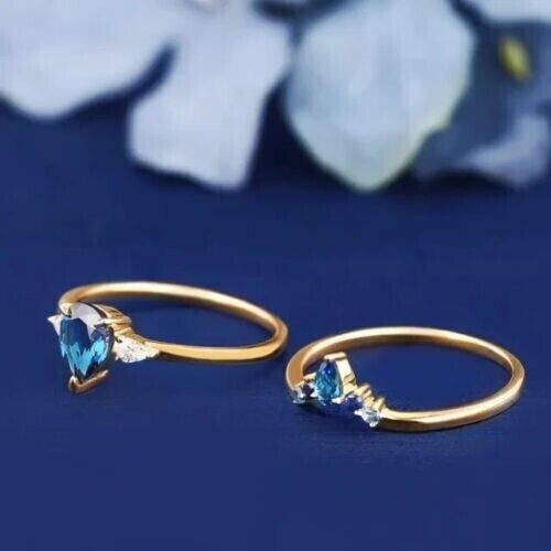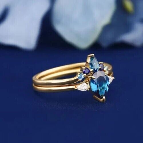 3Ct Pear Cut London Blue Topaz Bridal Ring Set 14K Gold Plated