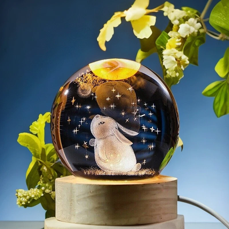 3D Carve Crystal Ball (Rabbit) Night Light with Wooden Base Kids Gift Healing