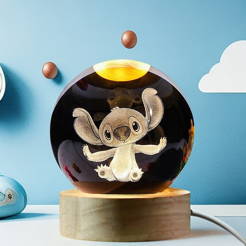 3D Carved Stitch B Crystal Ball Night Light with Wooden Base - Kids Gift Healing Decor