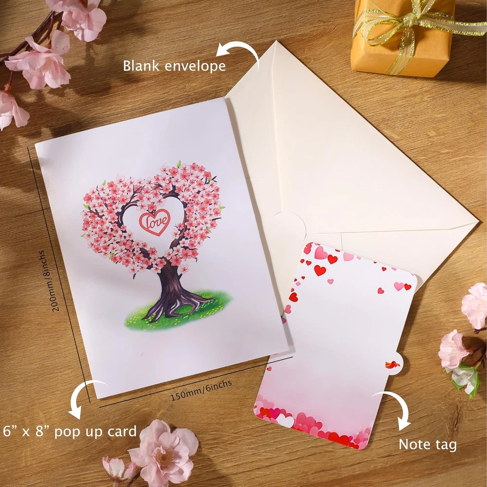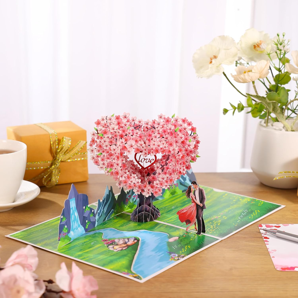 Heartfelt 3D Scene: A loving couple stands by a gentle river surrounded by nature, mountains, and cherry blossoms, creating a warm and dreamy setting that comes alive when opened. A Heartfelt Surprise: Beneath the tree, a loving couple is depicted embracing on a charming bridge, creating a picturesque and emotional scene that celebrates love. This card doubles as a keepsake display, reminding the recipient of your thoughtful gesture. Perfect Gift for Special Occasions: Ideal for Valentine’s Day, weddings, anniversaries, or couple’s birthdays. Express love to your spouse, partner, parents, or friends in a unique and touching way. Personalized Touch: Includes a slide-out note for you to pen heartfelt messages, allowing you to add a warm, personal touch to your gift. This feature ensures your love and care are expressed in a truly unique way. Love Card with Envelope and Note: Package Contents 1 Pop-up Card(6x8 inches) +1 Envelope +1 Note tag. This 3D pop-up greeting card is the perfect choice if you want a unique and memorable gift. Product description Show your love. Share your heart. Celebrate life’s most beautiful moments with this exquisite 3D pop-up card. Make Every Moment of Love Unforgettable This Romantic 3D Pop-Up Peach Blossom Card goes beyond paper and ink; it’s a celebration of love, designed to create smiles, memories, and lasting impressions. Perfect for Loved Ones An ideal choice for husbands, wives, couples, boyfriends, and girlfriends, this card is perfect for expressing your love on special occasions such as Valentine’s Day, weddings, anniversaries, or couple’s birthdays. Large Size With Slide-out Note This Romantic 3D Pop-Up Peach Blossom Card with a slide-out note for a personalized message, allowing you to convey your feelings in a heartfelt and intimate way. Versatile Use Cases This enchanting card is perfect for a variety of occasions, making it a versatile addition to your greeting card collection. Use it to celebrate a wedding anniversary, where the beautiful 3D design can symbolize the love and commitment shared between partners. It serves as an ideal Valentine’s Day gift, allowing you to express your deepest feelings in a memorable way. Additionally, it can be a wonderful birthday card for your significant other, adding a romantic touch to their special day. The card is also suitable for commemorating milestones in relationships, such as a couple's first date anniversary or engagement celebration. Furthermore, it can be gifted to friends or family members who are celebrating their love, making it a thoughtful gesture that conveys your best wishes for their happiness. With its unique design and heartfelt message, this card is sure to leave a lasting impression on anyone who receives it.
