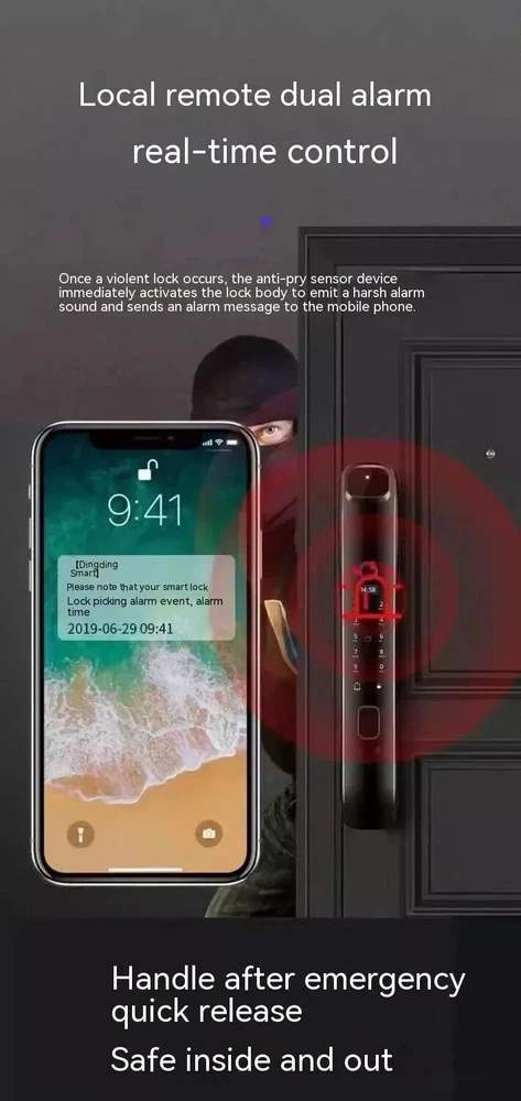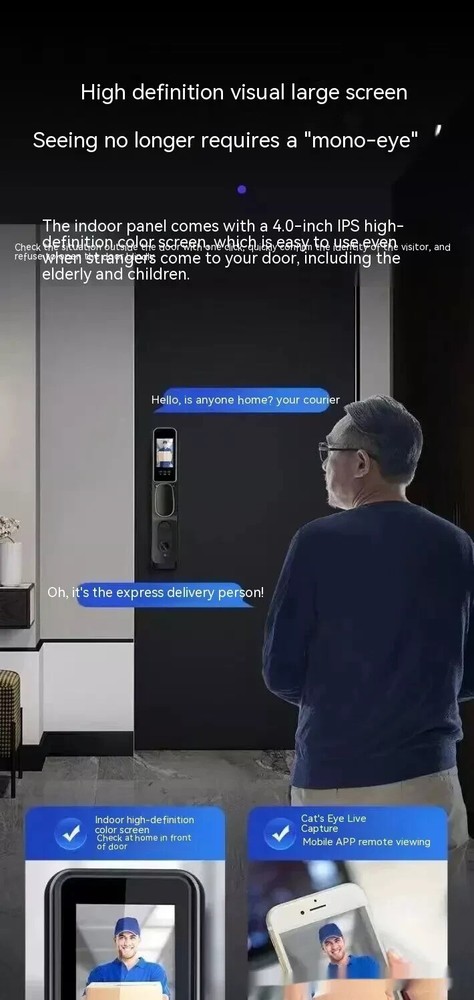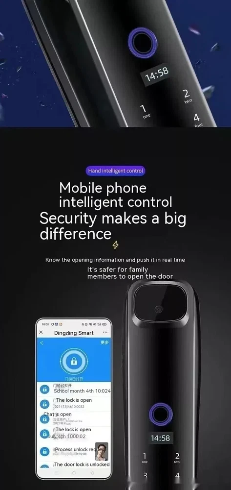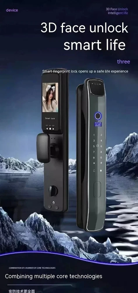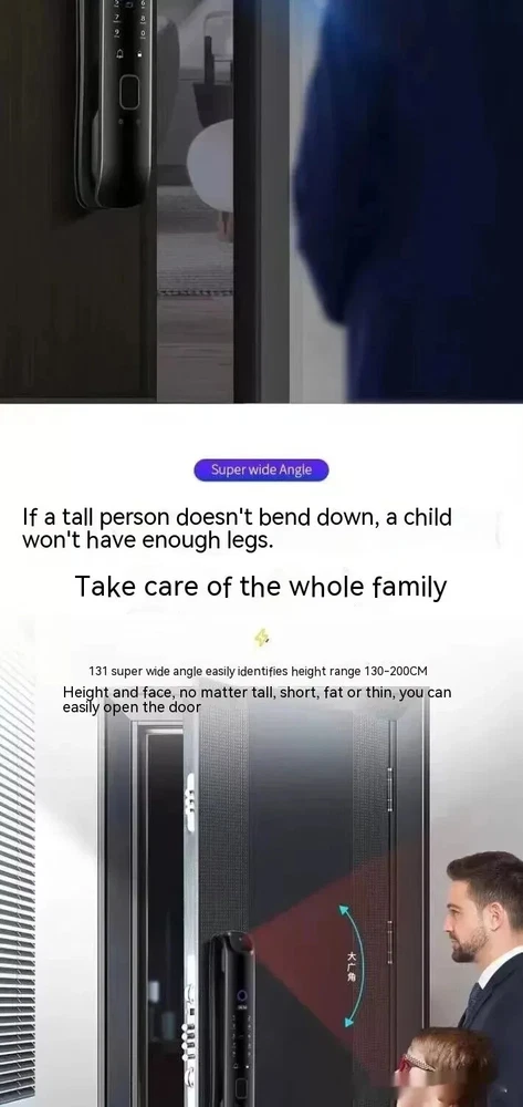 Power supply: 4200 milliampere lithium battery Face capacity: 100 Emergency power supply: USB power supply Password capacity: 100 Lock cylinder level: C-level lock cylinder Fingerprint capacity: 100 Panel material: zinc alloy Alarm support: door lock anti prying/multiple password input errors/low battery reminder Unlock method: face/password/remote/magnetic card/key/fingerprint Style: 3D facial recognition model Packing list: Fingerprint Door Lock 1 x pc Product Image: