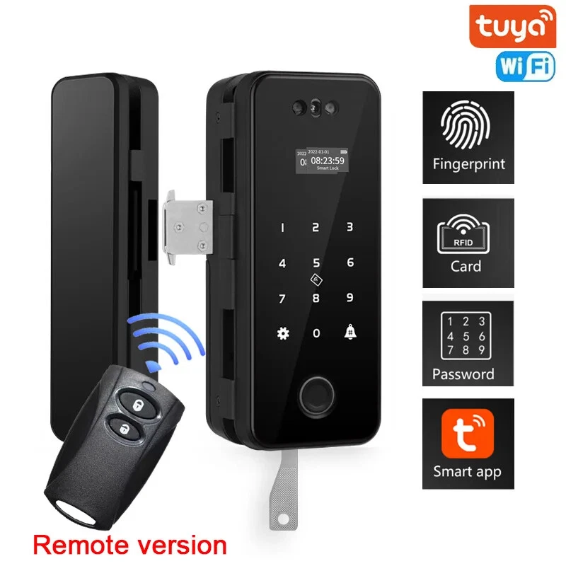 Note 1. Battery in Lock or remote controler are all removed due to shipping limitation 2. Lock is not waterproof Kits available to choose from: Kit1 (WIFI LOCK): Lock with tuya function , support card/code/fingerprint/Tuya smart app Kit2 (WIFI LOCK): Lock with tuya function and remote controler , support card/code/fingerprint/Tuya smart app/Remote controler Choose right type for your own door. Different kit comes with different accessories. for frameless galss door, ok for door thickness with 8 to 12mm. No drill needed. For framed glass and wooden door, suit for 4 to 7cm door. Need to drill on door.