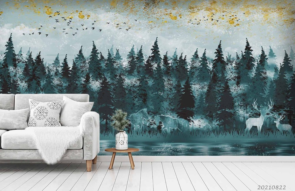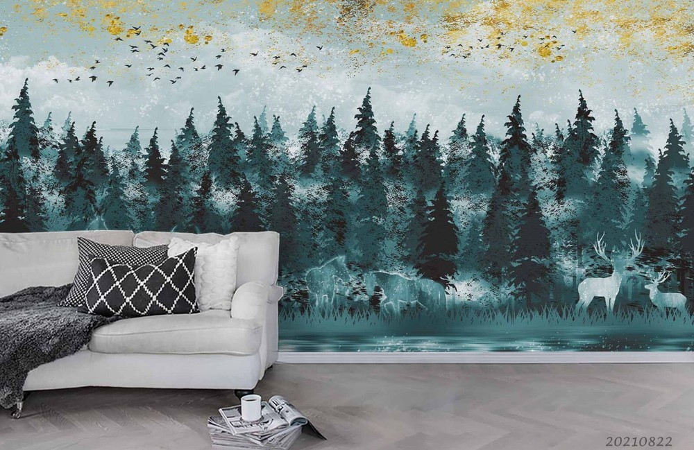 3D Green Forest Animal Hand-Drawn Wallpaper Murals and Stickers for Walls