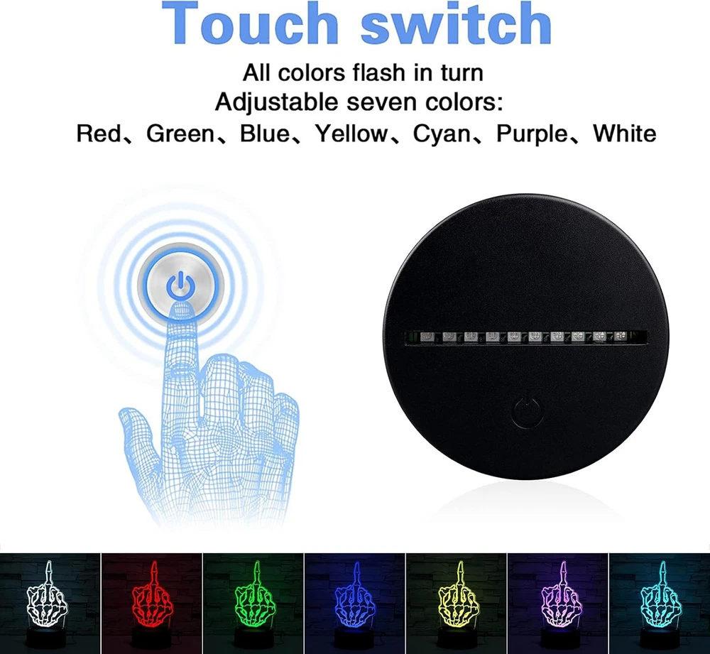 3D Illusion Night Light Desk Lamp, 7 Colors Auto Gradual Changing Black base Product Details Finish Type: Unfinished Base Material: Acrylic Bulb Base: E26 Product Dimensions: 1.9"D x 6.8"W x 5.5"H Item Weight: 0.43 Pounds Lamp Type: Desk Lamp, Night Light Shade Color: 黑色 Shade Material: Silk Switch Type: Touch Style: Modern Brand: XINYUANLAI Color: Black base Special Feature: Color Changing Light Source Type: LED Material: Glass, Acrylic Room Type: ‎Bedroom, Living Room Recommended Uses For Product: Decoration Power Source: Battery Powered Shape: rectangular prism Controller Type: Remote Control Number of Light Sources: 10 Connectivity Technology: USB Included Components: Remote Control Is Waterproof: False Mounting Type: Tabletop Wattage: 12 watts Number of Items: 1 Lighting Method: Adjustable Control Method: Touch Indoor/Outdoor Usage: Indoor Specific Uses For Product: Decoration Water Resistance Level: Not Water Resistant Installation Type: Tabletop Number of Pieces: 3 Connectivity Protocol: Usb Base Diameter: 1E+2 Millimeters Brightness: 1 Lux Is Cordless?: No Manufacturer: XINYUANLAI Item Weight: 6.9 ounces Finish types: Unfinished Special Features: Color Changing Batteries Included?: No Batteries Required?: No Product Dimensions : 1.9 x 6.8 x 5.5 inches; 6.88 ounces Manufacturer : XINYUANLAI Finish Type: Unfinished Base Material: Acrylic Bulb Base: E26 Product Dimensions: 1.9"D x 6.8"W x 5.5"H Item Weight: 0.43 Pounds 3D STEREO EFFECT - Light transmittance of 95% or more, acrylic top light passes through acrylic glass to ensure a magic 3D illusion. Especially in the dark, the vision thrill will be strong! Perfect for bedroom, bar, shop, cafe, restaurant. SAFE ENSURANCE - Our 3D night lamp adopts 10 low energy consumption LED beads, which has a lifespan of 10,000 hours. Power consumption 0.012kw.h/24 hours. Never over heating, safe when touched by kids. COLOR GRADIENT - Powered by 3xAA batteries and USB cable, the touch button controls the color change of the illusion light. With 7 colors red, green, blue, light blue, light blue, purple, white, adjustable one color or colorful gradient. EASY TO CONTROL - Compatible with touch control all content, switch machine, adjustable brightness, adjustable dimming speed, automatic color change mode. The remote provides more control convenience for the night light. GREAT GIFT - This 3D visual illusion night lamp is a great idea for the ones who want to buy a for you kids/girls/boys of all ages, we sure this illusion lamp with surprise them. Bring You Into A Tale World! 3D illusion LED lamps adopt advanced technology to show you a different world. Bring “real” or other things into your house, magic but reality! You can have you can have a whole room of 3D illusion!7 Colors Available7 colors auto changing, red, green, blue, light blue, light blue, purple, white! You’ll find there is endless of fun!Product Features:- Never over heating, kids safe.- High quality material, high toughness, sturdy.- 3xAA batteries and USB powered, easy to control.- Perfect for home, bedroom, living room, bar, cafe, restaurant.Specification:High: 1.57”Base Diameter: 100mm/3.9”Material: AcrylicBattery: AA (not included)Package Include:1 Set of 3D Illusion Night Lamp