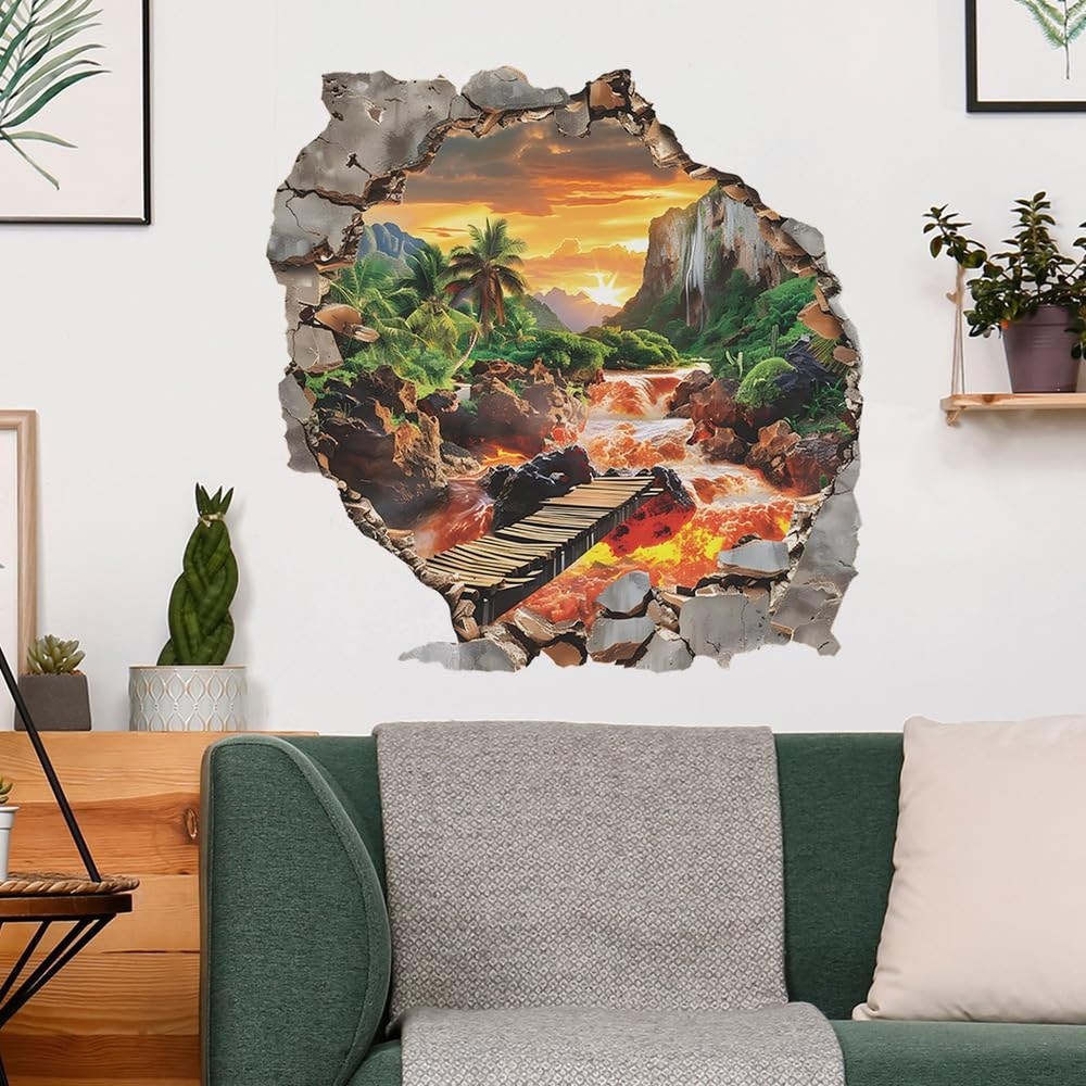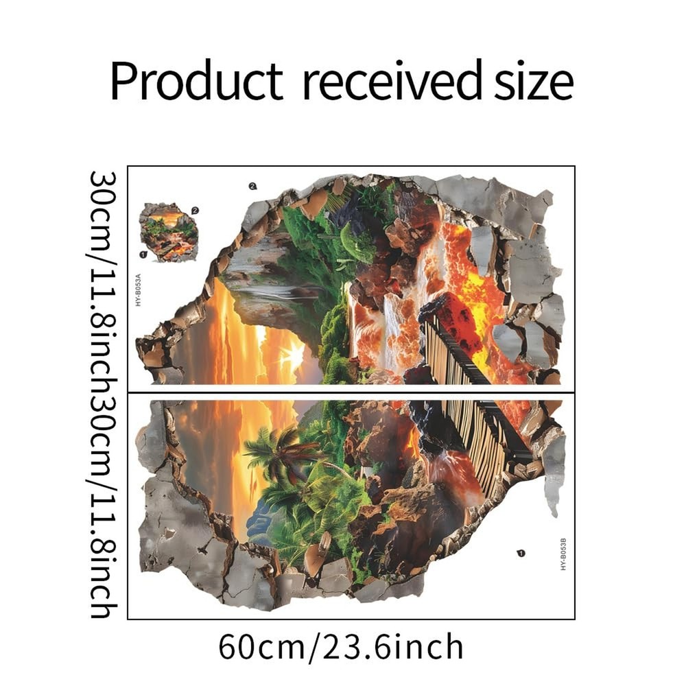 3D Jurassic Flaming Mountain Wall Stickers Palm Tree Vinyl Wall Decals for Bedroom Living Room Bathroom and Office Product Details Brand: FUFUQUARE Color: Green and Yellow Item dimensions L x W x H: 23.62 x 11.81 x 0.04 inches Recommended Uses For Product: Window, Wall, Refrigerator, Tile, Door Theme: Aesthetic Cartoon Character: jurassic Special Feature: Peel and Stick, Waterproof, Removable Number of Pieces: 2 Style: Modern Age Range (Description): Adult Brand: FUFUQUARE Color: Green and Yellow Item dimensions L x W x H: 23.62 x 11.81 x 0.04 inches Recommended Uses For Product: Window, Wall, Refrigerator, Tile, Door Theme: Aesthetic Cartoon Character: jurassic Special Feature: Peel and Stick, Waterproof, Removable Number of Pieces: 2 Style: Modern Age Range (Description): Adult Reusability: Reusable Item Form: Mural Unit Count: 1.0 Count Indoor/Outdoor Usage: Indoor Number of Items: 1 Target Audience: Women, Teens, Men, Boys, Girls Seasons: Winter, Summer, Fall, Spring Product Dimensions: 23.62 x 11.81 x 0.04 inches Item Weight: 3.52 ounces Manufacturer: FangKuai Item model number: FKW1504 Date First Available: March 12, 2025 Unique Design:This 3D wall sticker shows a wall - broken effect. The scene inside has palm trees, thick vegetation, a waterfall, and sunset - lit mountains. There's also a river with orange - red lava under a wooden bridge. It uses visual tricks to make you feel like entering a fantasy nature, bringing a vivid and fun touch to the space. Family Safety:This wall decal is crafted from premium waterproof and self adhesive vinyl material, ensuring it is completely non-toxic, odorless, and safe for children. Easy to Apply and Remove:Easily applied and removed without leaving residue or damaging surfaces. Versatile Application:This product adheres to any clean, dry, non-textured smooth surfaces including walls, windows, tiles, furniture, mirrors, and refrigerators. It is ideal for decorating nurseries, bedrooms, living rooms, bathrooms, dining areas, kitchens, and offices. Product Size: Comes with 2 sheets, 11.8"23.6" (30cm60cm each). The display size on the wall is 22.4"22" (57cm56cm), which creates a dramatic impact in any room.