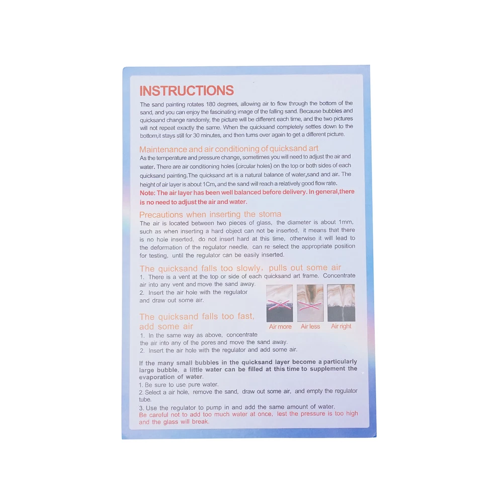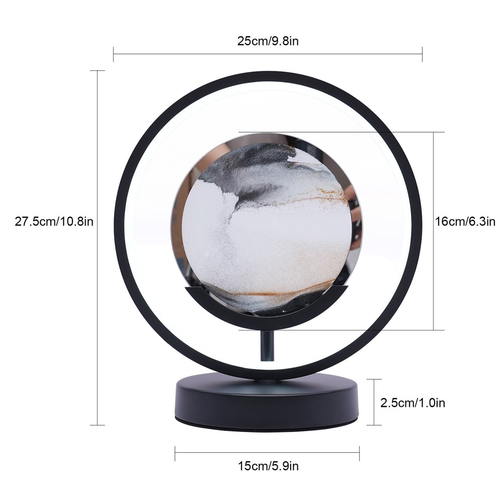 Specification Color: Black Style: New China Style Shape: Round Material: Metal, PMMA, Glass, Fine Sands Placement Position: Desktop Special Feature: Adjustable Light Source: LED EU Energy Label Efficiency Labeling Class: A++to E Efficiency: E Light Color: White Light, Warm Light, Natural Light Applicable Scenes: Living Room, Bedroom, Dining Room, Office Plug Type: US Working Voltage: 110V, 60Hz Irradiated Space: 3-5m²/ 32.29-53.82ft² Package Size: 32*16*32cm/12.6*6.3*12.6in Product Size: 25*15*27.5cm/9.84*5.91*10.83in Inner Frame Diameter: 16cm/ 6.2in Base Size: 15*15*2.5cm/ 5.91*5.91*0.98in Gross Weight: 1.5kg/3.33lbs Package Included 1*Moving Sand Art Picture with LED Light 1*Syringe 1*English Manual 3D LED Moving Sand Art Picture Lamp 7 Light Color Charging Sandscape Home Decor 3D LED Moving Sand Art Picture L NEW LED Moving Sand Light Landscape Painting 3D Effect Dimmable Black Frame Description When it comes to stress and anxiety, you need gentle, relaxing quicksand to help ease your rushed mind and tense body. That's why we created this moving sand art picture with LED light. It is a unique decoration that achieves true tranquility. The delicate sand rotates 360° with the combination of liquid and air, and the flowing out pattern has a great 3D effect. It can not only be an unexpected decoration but also be a soother for your soul. Specification Color: Black Style: New China Style Shape: Round Material: Metal, PMMA, Glass, Fine Sands Placement Position: Desktop Special Feature: Adjustable Light Source: LED EU Energy Label Efficiency Labeling Class: A++to E Efficiency: E Light Color: White Light, Warm Light, Natural Light Applicable Scenes: Living Room, Bedroom, Dining Room, Office Plug Type: US Working Voltage: 110V, 60Hz Irradiated Space: 3-5m²/ 32.29-53.82ft² Package Size: 32*16*32cm/12.6*6.3*12.6in Product Size: 25*15*27.5cm/9.84*5.91*10.83in Inner Frame Diameter: 16cm/ 6.2in Base Size: 15*15*2.5cm/ 5.91*5.91*0.98in Gross Weight: 1.5kg/3.33lbs Package Included 1*Moving Sand Art Picture with LED Light 1*Syringe 1*English Manual Key Features Aesthetics Attractive : The exquisite sand combined with liquid and air flows out with an excellent 3D effect on the pattern. It is ideal for offices, hotels, restaurants, bars and home decoration. Stress Relief : The smooth movement of the sand relieves stress, relaxes your eyes, increases your patience, and allows you to slowly integrate into the nature-like ethereal realm. Your stress and anxiety will slowly release with the flow of sand. Superior 3 Dimmable Light : It is designed with three light modes: white/warm/natural light. You can change the light with the button on the power cord to create a different atmosphere. Suitable Size : The 9.84*5.91*10.83inch moving sand art picture with LED light at home or office will not take up too much desktop space. Eye Protection : It uses a unique round design lamp, which can avoid the light directly into the eyes. High-quality Material : It is made of a high-quality hardware body and PMMA lampshade, which has strong toughness and weather resistance . It will not be yellowed and damaged even after a long time of use. Easy to Operate : It is simpler than traditional mobile sand painting, without picking it up and turning it, just push and turn it to get a new painting. Comfortable Gift : It can be used as a table lamp for lighting at night and can be placed indoors as a good decoration during the day, so it is a good choice as a gift for parents, friends and lovers. Details High Transparency Glass : It uses high transparency glass, just like clear and crystal water droplets, reflecting the internal layers of sand thus giving you a clearer and more definite feeling. LED Light Source : It uses the LED light source, which not only protects your eyes but also is energy-saving and environmentally friendly , without causing economic and environmental burdens. Anti-slip Bas e: The anti-slip pad on the bottom has a good a nti-slip effect, while the soft material also protects the desktop well from wear and tear. Syringe : The package is equipped with a syringe, which you can use to control the air and water inside the sand painting lamp, thus playing a role in controlling the flow rate of flowing sand. You do not need to buy it separately. Application It is suitable for bedrooms, living rooms, offices, coffee shops, restaurants, etc. It has an irradiated area of 32.29-53.82 square feet. Air Control Operation 1. When the quicksand falls too slowly, pump out some air. Specific operation: Focus the air bubbles on the hole (need to determine the sand has moved away) and then use the air regulator (syringe) inserted into the air hole to draw out the air. 2. When the quicksand falls too fast, inject some air. Specific operation: Concentrate the air bubbles in the hole (make sure the sand has moved away) and then insert the air regulator (syringe) into the air hole to inject air. 3. If many small bubbles in the item become a particularly large bubble, there are two solutions: Mote the sand painting, so that the large bubble shakes loose into small bubbles; you can add a little water in moderation to supplement the evaporation of water. Notes 1. Please note that without the need to adjust the goods after receiving, just flip them back and forth a few times. 2. As the temperature and air pressure change, sometimes you need to use the air injector in the package to adjust the air and water in the sand painting. 3. Please note that the height of the air layer varies depending on the size of the product. The amplitude height of about 0.2cm to 0.79inch between the sand will have a better flow rate. 4. Notes on water injection: Be sure to use pure water or boiled water for cooling. Pump out some air and empty the air regulator. Use an air injector to inject the right amount of water to prevent excessive pressure and broken glass (too much air will lead to excessive pressure inside the quicksand painting, which will 