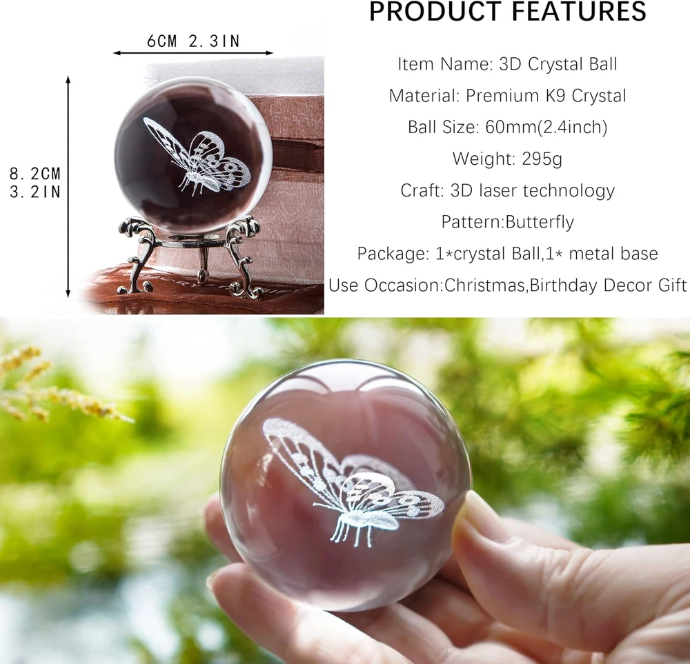 CRYSTAL BALL SIZE: Diameter 60mm (2.4inch); Weight 272g. well packed in pearl cotton package and exquisite gift box with giftable silky bag. I believe you will be pleasantly surprised when you receive it FULL OF POSITIVE ENERGY: The crystal ball is equipped with a sliver-plated flowering stand, so that the ball can be well displayed, it will be a good decoration anywhere in the home, and it is full of positive energy DECORATIVE OCCASION: This crystal ball is good for decoration, includes study, office, bedside, windowsill and many other places, the placement is up to you! (tips: a place with better light can show the charm of the crystal ball) HIGH QUALITY: Each crystal sphere adopts advanced laser engraving technology to create 3D patterns of different styles. Compared with ordinary patterns, this 3D pattern is extraordinarily lifelike, and every detail of the pattern is clearly visible to the naked eye. Without any impurities and excess air bubbles, high-quality quality is trustworthy THE BEST GIFT TO FESTIVALS: If you are struggling with what gift to give your loved one, congratulations this crystal ball will be your best choice! This 3D crystal ball suitable for any occasions and anniversaries, and is the first choice for gifts for lovers, family, friends, teachers, housewarming, Christmas, weddings, etc. The person who receives this gift will have the most sweet smile Product Description