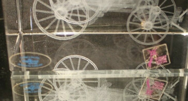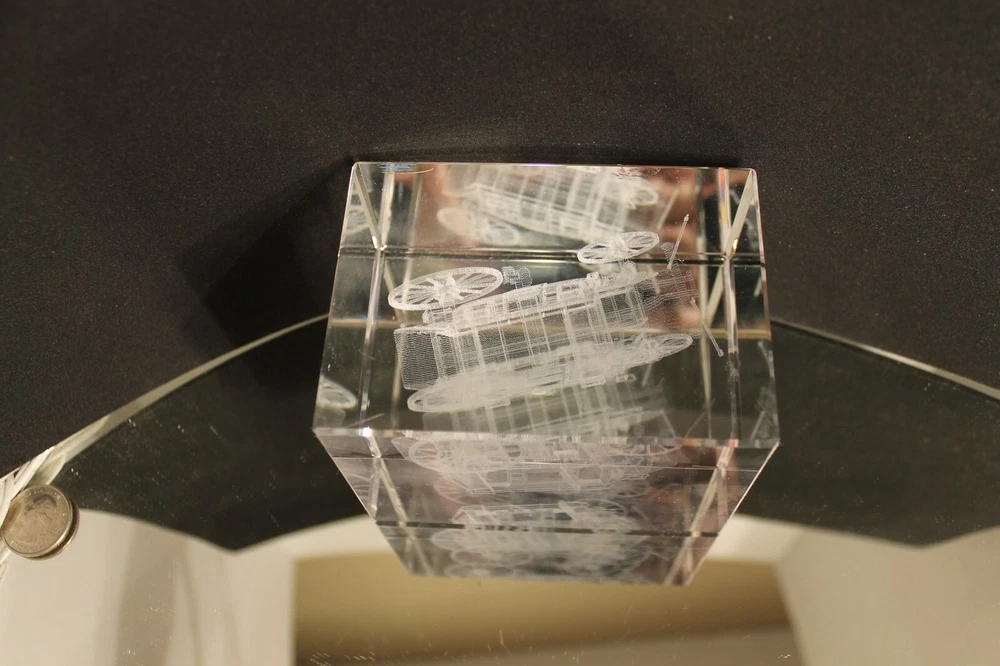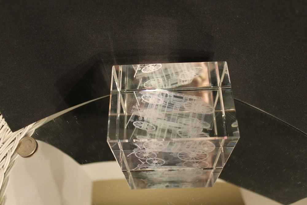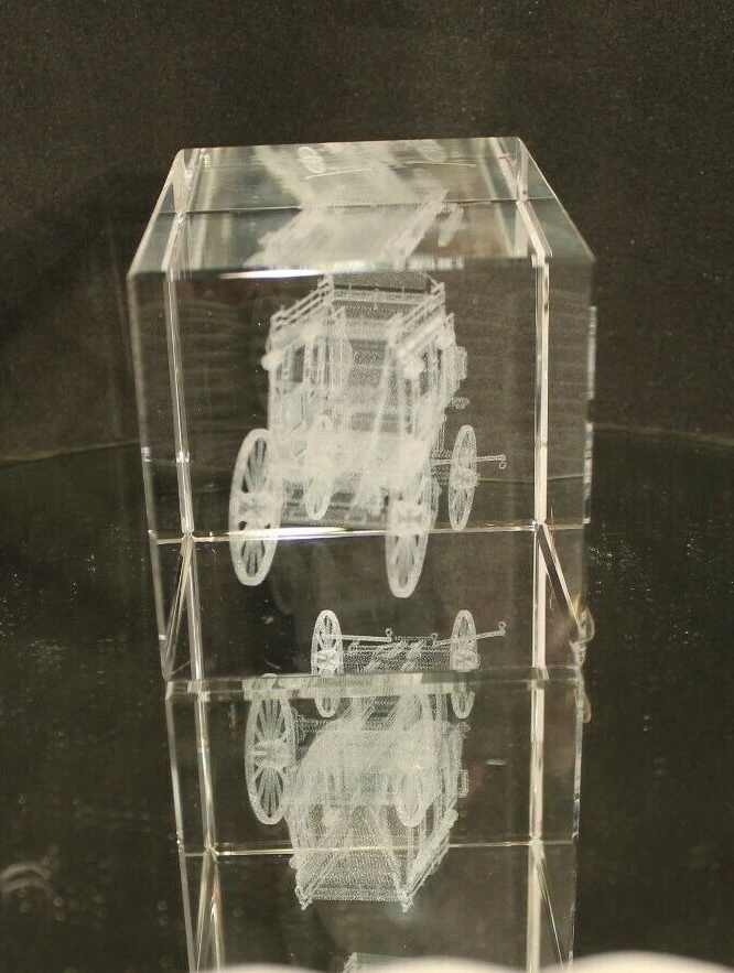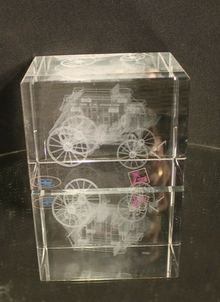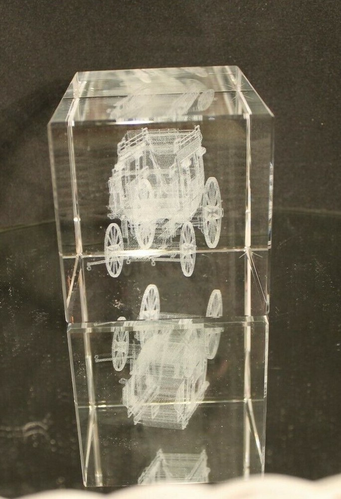 Up for Sale from "IMAGE 3 CRYSTAL" by "JAFFA" is a Solid Block of Crystal that has an inner image of a "STAGE COACH"---Done by a space age process.----A true 3-Dimensional image.(See Pictures)---Breathtaking!!! Will be coming to you with the Original Decals still attached(See Picture #3)--A very busy picture---The Blue Decal to the left reads as follows: CRAFTED IN THE U.S.A. IMAGE 3 CRYSTAL by JAFFA US PATENT NO. 5,206,496 The Maroon Decal to the right reads as follows: US PATENT NO 5,206,496---5,637,244 A True 3-Dimensional image has been created within a solid pc of Crystal. Through a space age laser process. The sophisticated process produces this inner image without blemishing the surface of the crystal. The amazing designs are suspended in time & space encased in flawlessly polished solid Crystal. This beauty measures 4-5/16 " Long(See Picture #1) by 3-1/8" High and weighs in at a Hefty---almost 4 LBS. Will be coming to you in "LIKE-NEW"--Pre-Owned Condition. Nice Clean Piece--Blemish Free--.(See Pictures) There are 8 Close-Up pictures for you to get a good look at what you are bidding on. PAY PAL, FOR IMMEDIATE SHIPMENT. WE SHIP INSURED PRIORITY, FIRST CLASS, AND MEDIA USPS MAIL WITH DELIVERY CONFIRMATION RECEIPT. WE SHIP FIRST CLASS INTERNATIONAL MAIL USPS with NO INSURANCE. WE SHIP PRIORITY MAIL INTERNATIONAL WITH INSURANCE and GLOBAL USPS ONLY! The postage for this item is $10,20 in the continental U.S.A. Other than U.S.A., e-mail for shipping rates. MINNESOTA RESIDENTS ADD 7.525% SALES TAX There is a 30 day return policy for a full refund, excluding Postage. If you are not satisfied with your purchase, please notify by e-mail that you will be returning an item. GOOD LUCK BIDDING!!!!! AS ALWAYS YOUR SATISFACTION IS A MUST!!!!!!!!!!!!!!