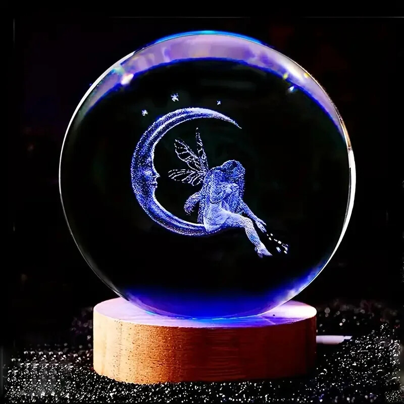 Celestial Charm: This exquisite crystal ball night light is more than just a source of illumination; it's a captivating work of art. Intricately laser-carved with a stunning 3D moon and fairy design, it casts a mesmerizing glow that transforms any space into a tranquil haven. The vibrant, colorful light creates a magical ambiance, perfect for relaxation, meditation, or simply adding a touch of whimsical charm to your bedroom, living room, or office. Exceptional Craftsmanship: Crafted from high-quality crystal, this night light boasts exceptional clarity and durability. The precise laser carving ensures intricate detail and a luminous, three-dimensional effect. Its compact size makes it ideal for placement on a bedside table, desk, or shelf, while its elegant design complements any interior décor style. The built-in LED lights ensure a long lifespan and energy efficiency. Thoughtful Gift: Searching for a unique and memorable gift? Look no further. This enchanting crystal ball night light makes a perfect present for birthdays, anniversaries, or any special occasion. Its captivating design and calming glow will surely delight your girlfriend or wife, making it a treasured keepsake for years to come. The exquisite craftsmanship and enchanting ambiance make it a gift that stands out from the ordinary. Dimensions are approximately 3.15" x 2.36"