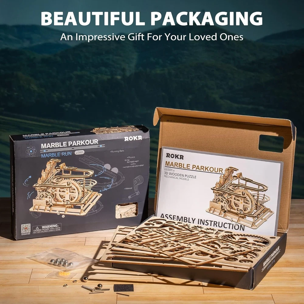 [ROKR Wooden Marble Run] This classic wooden marble run is great for collection.Traditional wood material,retro waterwheel design.It takes 5-6 hours to build and is a wonderful 3D puzzle for adults and older . [Full of Details] Working in tandem through gears.Turning the hand-crank, the metal marbles will travel along two tracks.You can see multiple parts working together in this process.It will take your puzzles game to the next level. [Impressive Gift Idea] 3D wooden puzzles are not common,but suitable for people of all ages.With its attractive design, it makes a great home decor item and an ideal gift for adults or men & women who love puzzles. [Quality Assurance] Utilizing high latitude selected basswoods.Our laser-cut technology makes the error of each piece less than 1/200 mm.Spare parts are also included,so you don't have to worry about breaking any part. [Instruction] We offer a detailed how-to booklet for this 3D puzzle,featuring easy-to-follow,step-by-step tutorials.Each wooden part is laser marked with a unique code.A suitable adult wooden model kit for beginners. Product information Product Dimensions 10 x 9.3 x 7.3 inches Item Weight 1.28 pounds Country of Origin China Manufacturer recommended age 14 years and up