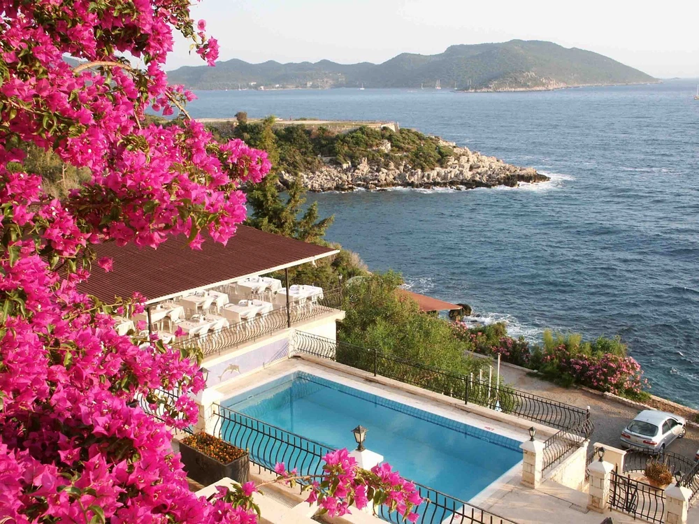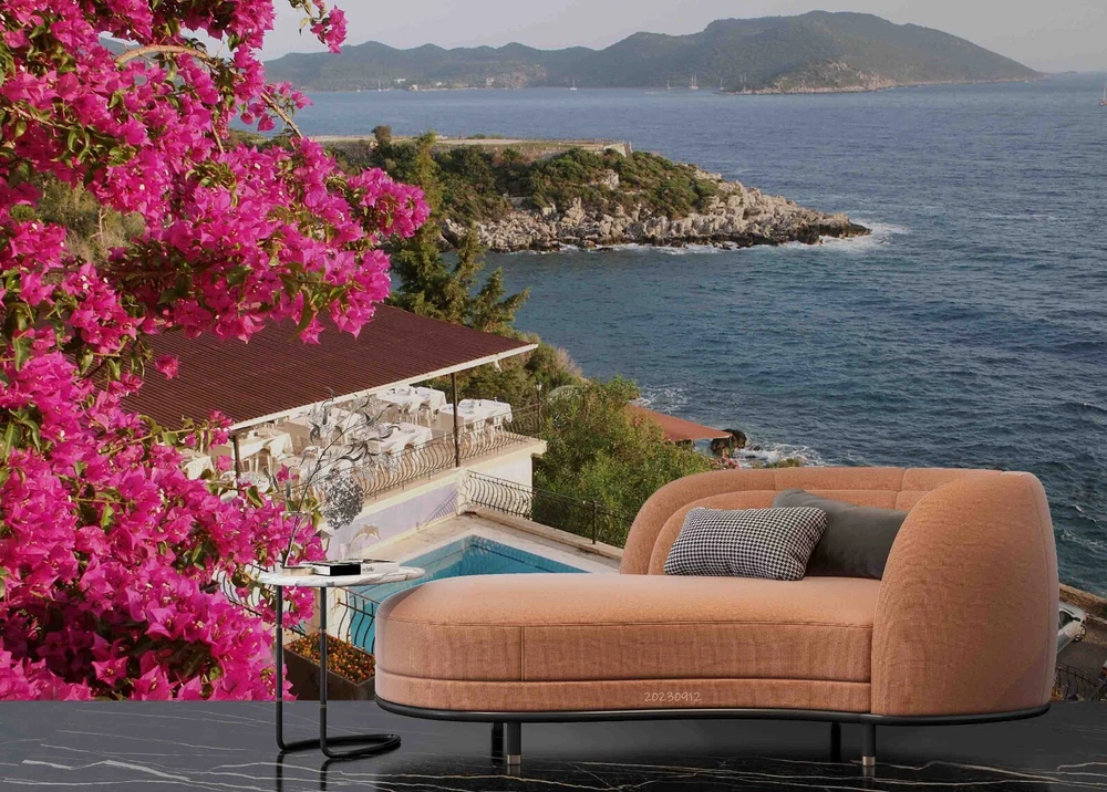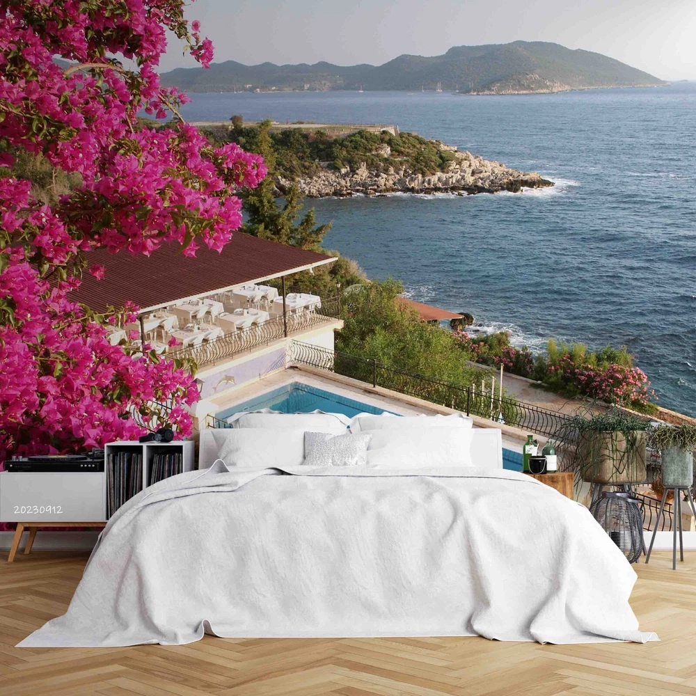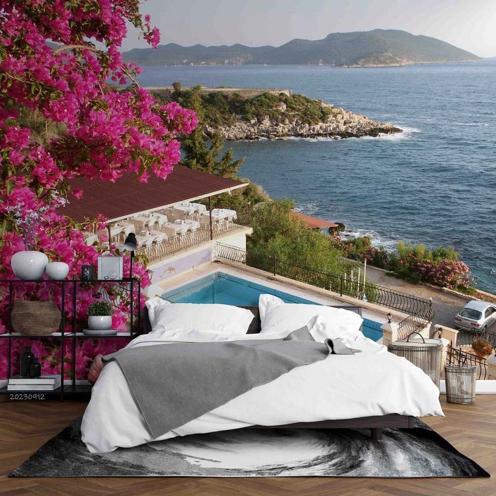 3D Sea Mountains Pink Floral Nature Wall Murals Wallpaper Murals Wall Sticker