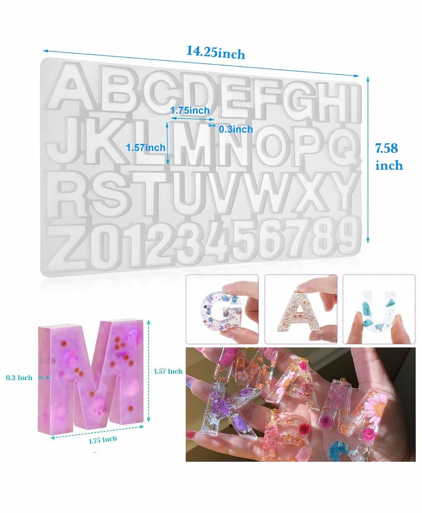Welcome to my shop Product Name: Silicone mirror alphanumeric mold Specification size: as shown Product material: super soft high permeability silicone, easy to demold. Not Safe for Food Making Shape: letter & number Quantity: 1 Set (Mold) High transparency and high mirror effect make DIY more interesting About Shipping: All orders will be shipped with a tracking number. If your package will be returned back because it is unclaimed, your order can't be canceled.