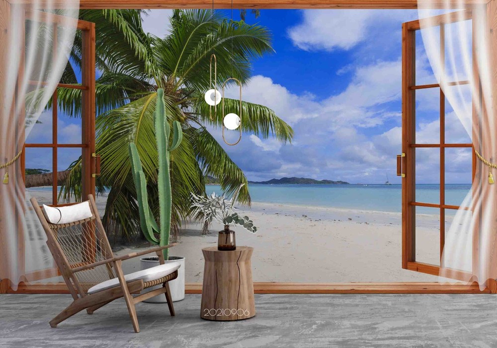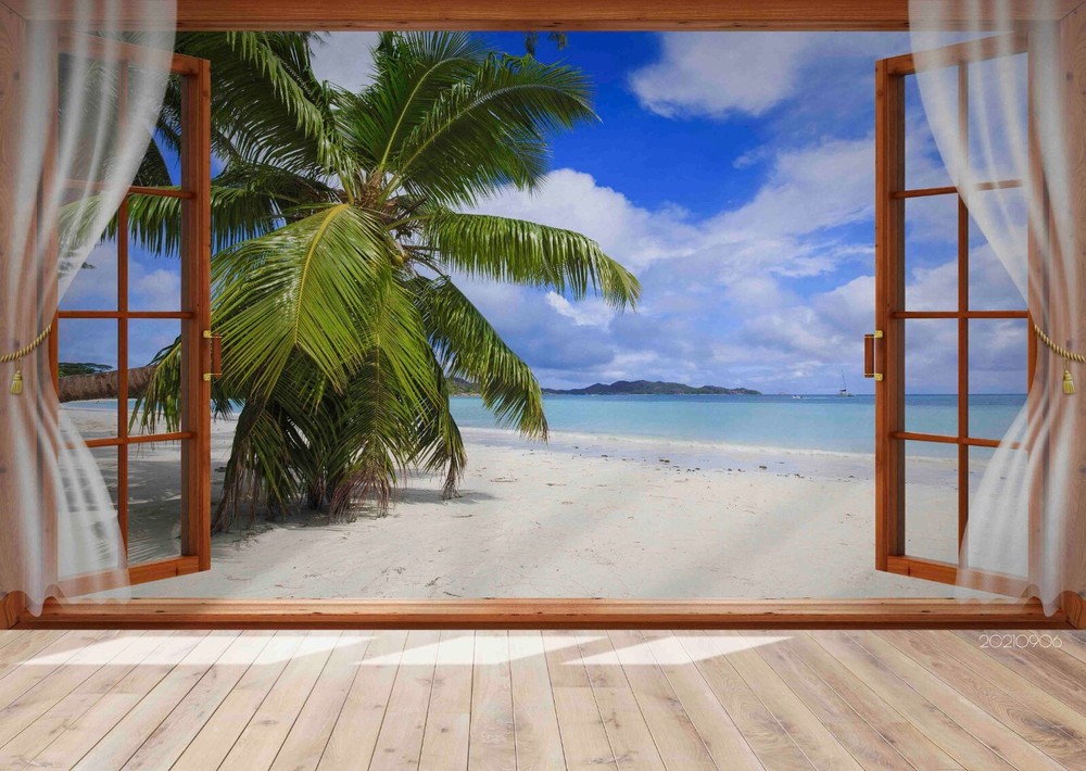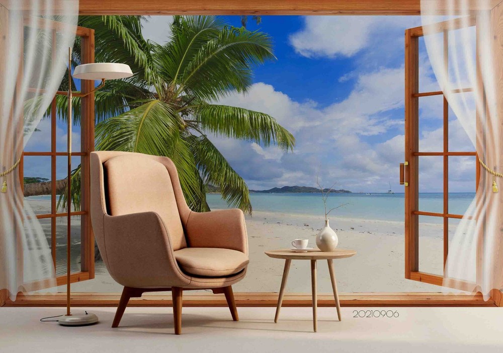 3D Sky Beach Coconut Tree Window Wall Murals Wallpaper Murals Wall Sticker
