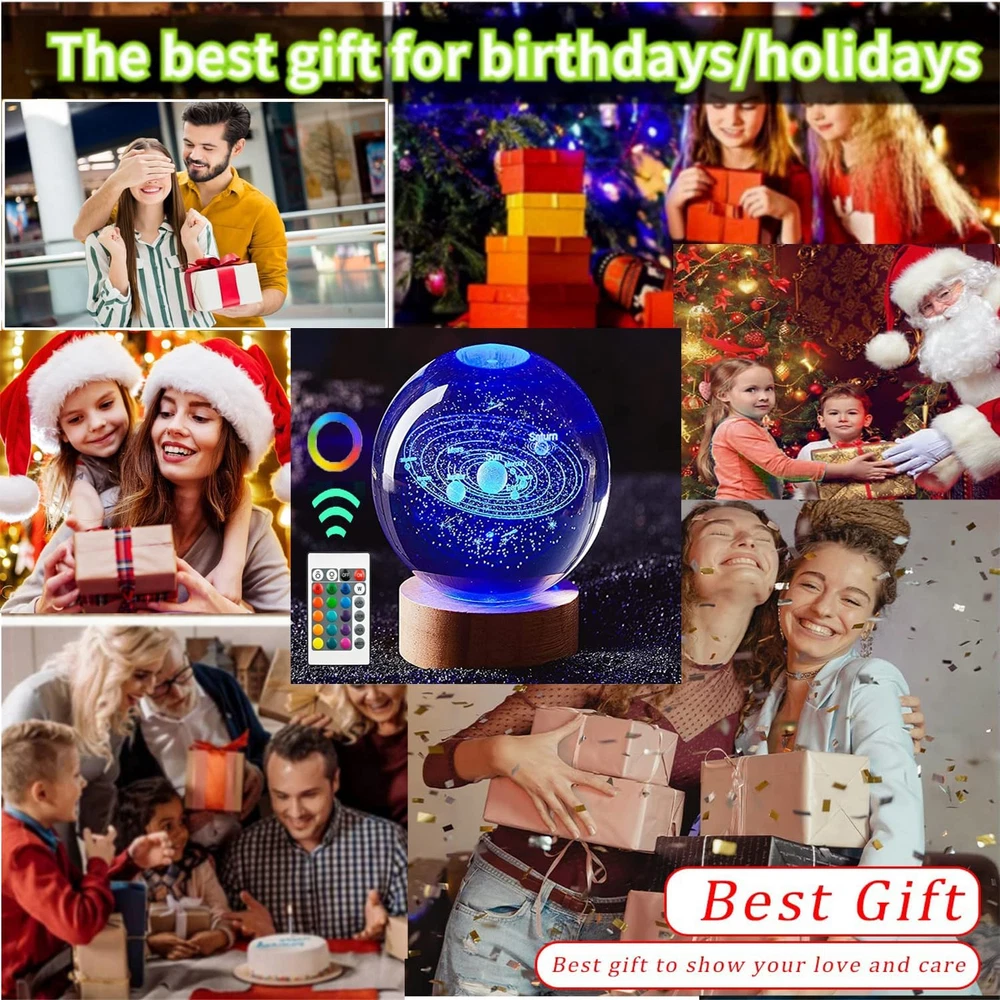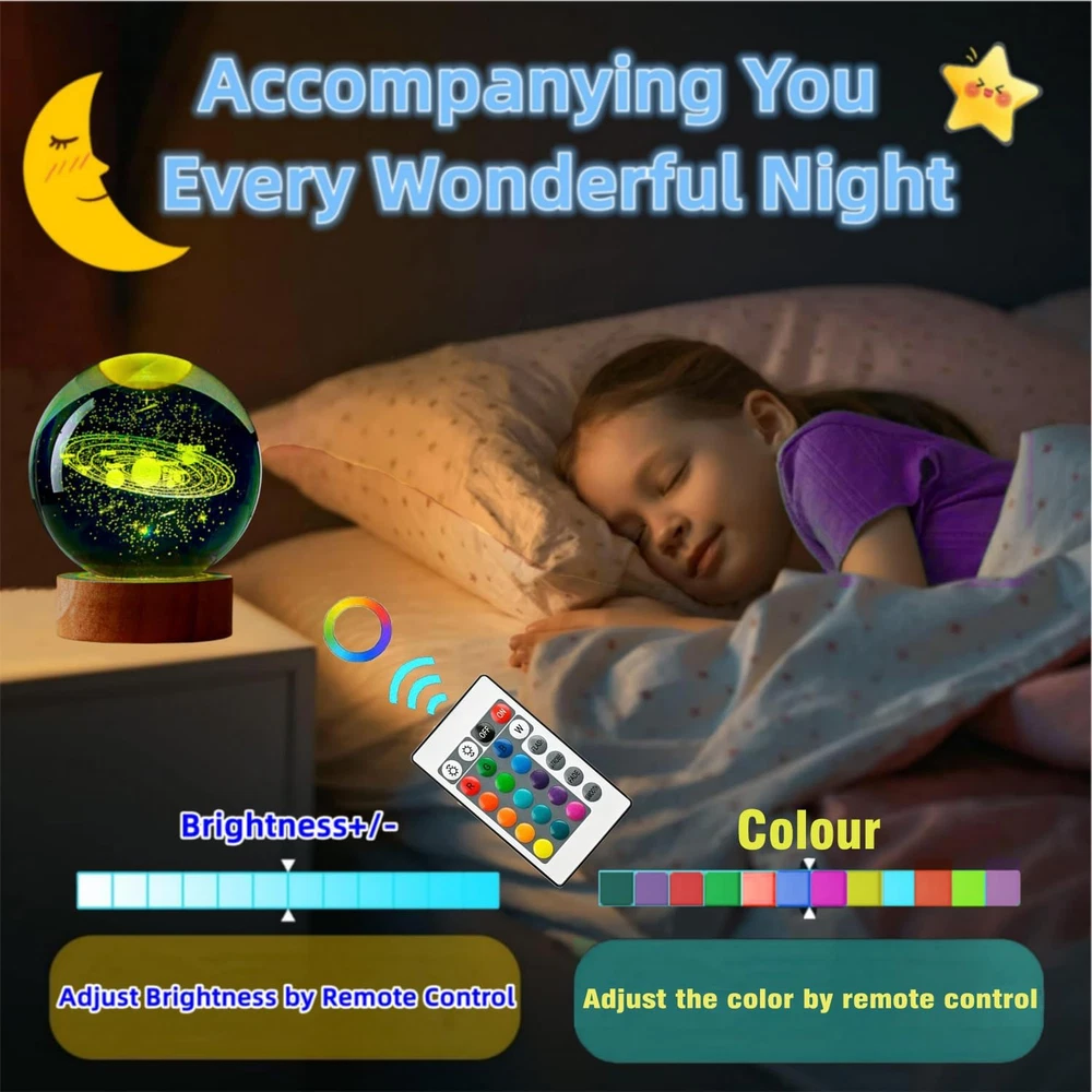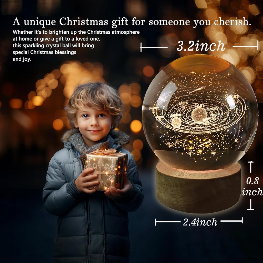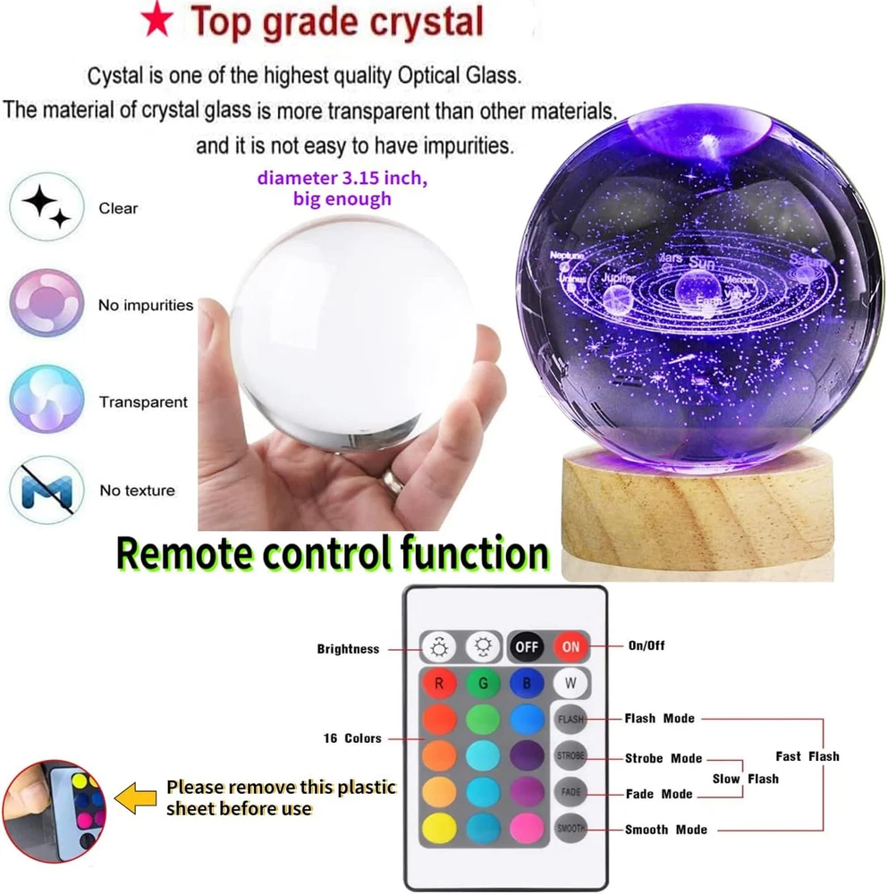 Store New Arrivals Add to Favorite View Feedback Contact 3D Solar System Crystal Ball Lamp,3.2In Crystal Ball Night Light Engraved Astronomy Decor,Galaxy Planets Glass Ball Lamps with Woodern Base,16 Colors Remote Control Gift for Kids,Friends,Loves Description Item model number SJD-01 Light Source Type LED Style Art Deco Number of Items 1 Power Source Battery Powered Number of Light Sources 1 Country of Origin China Batteries Included? Yes Lighting Method LED Lamp Type LED Cartoon Character 3D Solar System Number of Pieces 1 Room Type bedroom,living room,children's room,study,hallway,officeor,any style of space Bulb Shape Size B10 Product Dimensions 3.2"D x 3.2"W x 3.2"H Material Glass Batteries 2 CR2 batteries required. (included) Installation Type Tabletop Controller Type Remote Control Specific Uses For Product Indoor use only Indoor/Outdoor Usage Indoor Control Method Remote Water Resistance Level Waterproof Batteries Required? Yes Item Weight 0.65 Kilograms Connectivity Technology USB Special Features 16 colors and Flash, strobe, fade and smooth four modes Multiple Lighting Modes,Wooden Base with USB Cable Line Special Feature 16 colors and Flash, strobe, fade and smooth four modes Multiple Lighting Modes,Wooden Base with USB Cable Line Shade Height 3.2 Inches Part Number SJD-01 Shade Color Multicolor Mounting Type Tabletop Color Solar System Wattage 2 watts Is Cordless? No Base Material Wood Is Waterproof true Shape sphere Voltage 5 Volts (DC) Recommended Uses For Product Decoration Shade Material Glass, Wood Included Components Remote Control, Battery Base Diameter 3.2 Inches Switch Type Remote 🔮【3D Solar System Crystal Ball Night Lights】3.2 Inch Large Crystal Ball Made Of Premium Glass Crystal,Interior Images Are Carved By Model Engraved with the Advanced 3D Laser Engraving Technology are Clear,Distinct and Stereoscopic,the Crystal Ball will not Fade Forever.It a great gift for Anyone Interested In Space And Astronomy.Solar System Crystal Ball is a perfect gift to give your wife,girlfriends,friends,family,Kids,Teens,Astronomy Enthusiasts, Physics Enthusiasts,Space Model Collectors. 🔮【Unique Perfect Gift】The inside of the crystal clear ball is engraved with exquisite and clear 3D pattern,under the illumination of soft light,it creates a warm and dreamy atmosphere, bringing a romantic artistic sense to your home.Suitable for bedroom,living room,children's room,study,hallway,any style of space.The gift for Valentines Day,Mothers Day,Wedding,Anniversary,Thanksgiving Day,Christmas,Graduation, Halloween Day.It is both A Bedside Night Lamps and a very beautiful Decoration Lamp. 🔮【Multiple Lighting Modes】: These 3D Crystal Ball Lamp have 16 colors and 4 modes. You can use the remote control to choose the color of your favorite lights and adjust the intensity of the lights. Flash, strobe, fade and smooth four modes,can also always light a color, soft and not glare, protect your eyes. You can easily control this night light even when you are lying in bed.Please be close to the remote control when using it. The adjustment range of the remote control is 2M (80inch). 🔮【Dreams From The Universe】Like love, the universe gives people a feeling of vastness and mystery, while also representing charm and longing.We like to use it to symbolize good wishes, such as eternity, harmony, peace, and lofty ideals and aspirations.So the 3D Solar System Space Gifts Crystal Ball Night Light we designed are also seen as gifts that symbolize love,health and Strong and long-lasting career, representing blessings and wishs. 🎁【USB Work】:The diameter of the 3D Night Light Crystal Lamp is 3.2 in.The weight is about 1.65lb.The crystal ball can be stably placed on the wooden base.Comes with Wooden Base with USB Cable Line(no Adapter),Connect to such as Computers,Portable Charger,Output Charger/Adapter,etc.Long life and Power saving: About 2W/H,can be used for many years.We strive to offer our customer the best product and after sale service.Any problem please feel free to .We will make customers satisfied! Product Description 3D Solar System Crystal Sphere Night Lights Dimmable Crystal Space Night Light Adjustable Color Light With Wooden Base. 16 Color Adjustable Color Night Light Solar System Gift Soft LED Lighting Adjust Brightness Please be close to the remote control when using it. The adjustment range of the remote control is 2M (7 FT). Create A Safe And Pleasant Atmosphere Soft Diffused light brightness design make it a perfect night decor for bedroom, study room, bedside table, baby room.night light emits a warm and soothing light,Will Not Hurt Your Eyes In The Dark. You Can Enjoy These Scenes In a Peaceful Mind. Makes it easier to fall asleep. USB Lighting adjustment Wooden Base The base is safe and firm, and can be used with computers, charging treasures and chargers, and is suitable for various USB power outlets. USB safe voltage allows you to better decorate every location in the room! Remote Control Adjustment The remote controller can adjust any lighting color you like. There must be one color you like when you choose 16 colors. The remote controller can easily control the change of lighting brightness in bed, which is more convenient. Suitable for decoration in various positions of the room. Best Gift To Show Your Love And Care.Best Gift To Show Your Love And Care. ABOUT US We offer the best prices around on high quality products. Our E-store includes media such as books, movies, music and games while offering electronics, toys, sporting apparel, clothing, tools, general home, garden items and more. SHIPPING We are always working hard to ensure your package arrives as soon as possible. Please understand that some factors like weather, high postal traffic, and the performance of shipping companies are outside of our control. We offer free shipping to the lower 48 states and ship within 2 business days of payment, usually sooner. We do not accept P.O. Boxes. Please provid