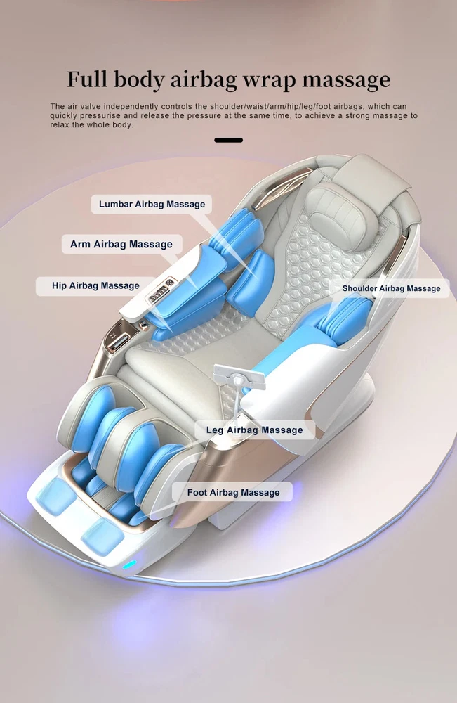 Further Comfort Massage Multiple Core Technologies *Anion- Air purification *Body type detection *Fatigue health detection *24 kinds massage program *Double push rod-Thai stretch *Top 6 Bionic manipulation *Intelligent double movement *S&L lengthened guide *AI intelligent voice control *TFT large screen control *Zero gravity-space capsule *Foot scraping massage Intelligent dual core, synchronised massage Upper movement 4D tooth motive movement + lower movement 3D large movement as two masseurs two hands at the same time massage efficiency is more than 1 + 1, soothe all day fatigue. Double care for key areas Double the back and waist massage to soothe sore muscles and relax quickly. Head-to-toe stress relief Extended SL rail, seven-section massage, corresponding to 24 sets of massage programmes music and soothing modes and 6 major massage techniques, from head to leg are carefully taken care of. 6 Massage Techniques *Knocking *Massage *Chiropractic *Tap *Knead *Torture Full body airbag wrap massage The air valve independently controls the shoulder/ waist/ arm/ hip/ leg/ foot airbags, which can quickly pressu rise and release the pressure at the same time, to achieve a strong massage to relax the whole body. Heated lumbar area with massage The lumbar part can be opened to warm up, with the full wrap design of airbag can better lock the heat in the whole body flow, massage experience iss better Multiple knee/ leg/ foot treatments *Thiah center---Intermediate airbag rubbing *Leg side---The air ags swing from side to side *Leg bellies---Knead two sets of rollers *Pericrural---Foot airbag pinch *Sole of foot---3 rows of roller top kneading scraping Intelligent electric induction retractable To calf sensing automatic expansion 12cm, height 150-200CM applicable. Calves can be placed comfortably. Multiple Control Modes *Intelligent voice control *Touch screen control *Shortcut key control Negative Oxygen Ion Purifcation Efcient negative oxvgen ion purifcation function, as if in the arms of the forest breath, negative oxygen ion purifcation air. Bring more care and health to the family. Configure six music modes *Stress relief and sleep aid *Purify the mind *Calm and soothe *Positive energy in the morning *Warm encouragement *Heal the mind Smart Health Monitoring Multidimensional perception of body state. Smart sensors automatically detect health indicators such as heart rate, blood oxygen, blood pressure, fatigue index, etc., understand you, and then customize your massage mode. Zero gravity foating relaxation experience Simulate zero gravity elevation angle of space craft Short distance against the wall Significantly improved space utilization Luxury, Elegant, Hongmei Style *Full body piano paint baking process Dynamic lines of coupe running Adapt to various decoration styles *High grade PU leather for massage chairs Skin friendly and wear-resistant, with excellent durability *Romantic atmosphere lamp Light up the night and enjoy tranquility Built in with wireless charging USB port charging Product size parameters Movement: 4D toothed upper movement + 3D lower movement large machine Rail travel: SL rail Color: White Gold/ Black Gold Massage technigues: 6 types of massage techniques Body type detection: Al intelligent detection Sound confiquration: HlFl Bluetooth sound system Hot compress temperature: ≈ 45 °C Hot compress area: waist Rated voltage: 220V Supported charging: wireless charging+UsB charging Massage areas: Neck, Shoulders, Waist, Buttocks, Arms, Feet, Soles of feet Control mode: touch screen / Al voice control / shortcut button control G.W/N.W:116KG/104KG Product size: upright size: 160x77*125cm lying flat size: 184x77*83cm