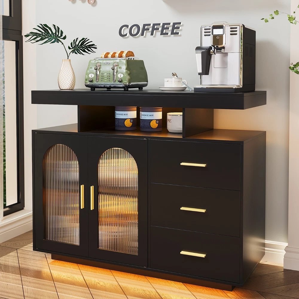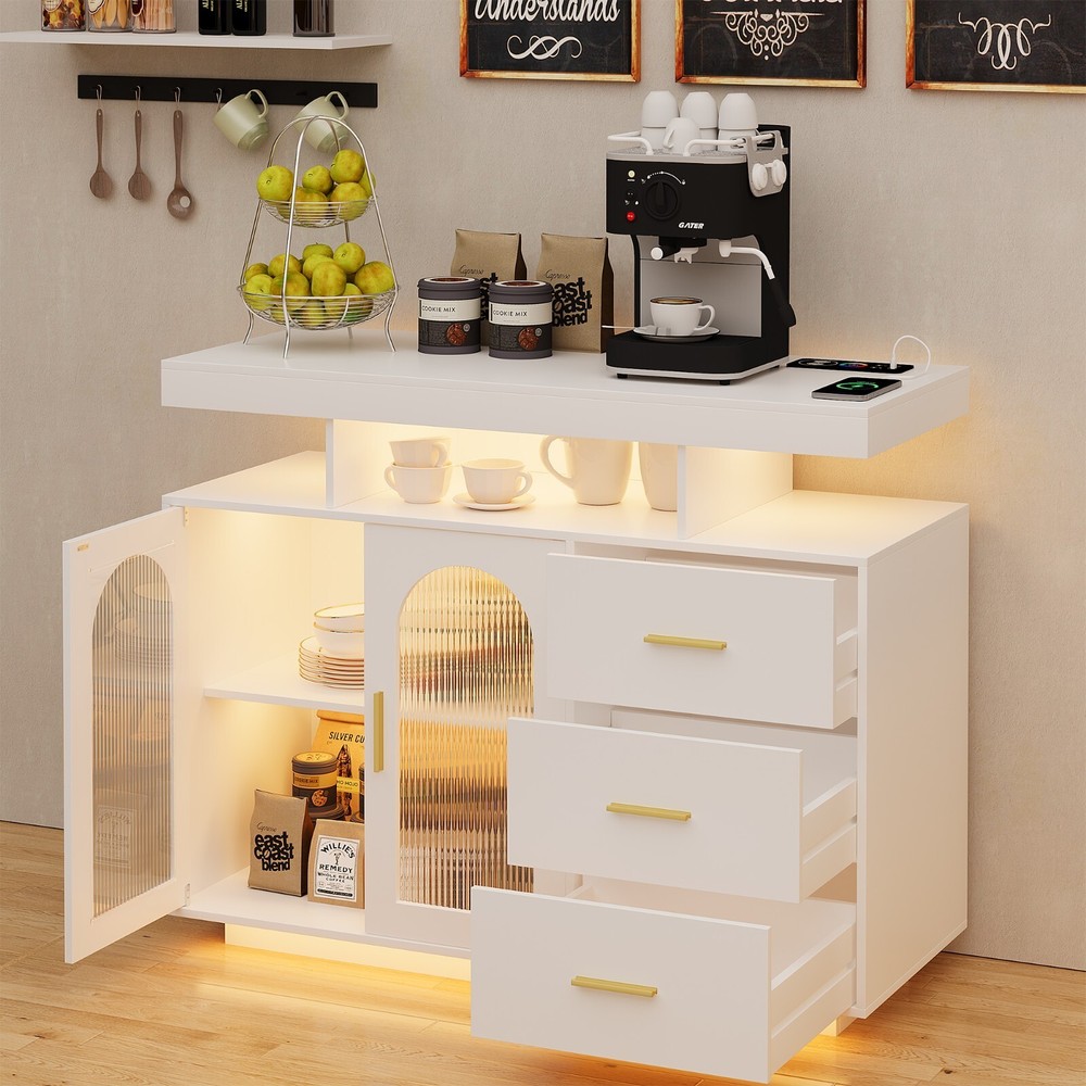【Size & Material】WOOVIVS sideboard:39.4 "L x 15.7 "W x 31.5 "H, Weight: 65 lbs, Color: Black/White, High-Gloss high-Guality wood 【3-IN-1 Charging Station】WOOVIVS coffee bar with wireless/USB/type-c charging station,which provides you with a variety of charging options so that you can charge multiple electronic devices at the same time. 【RGB Lighting】The buffet cabinet is equipped with 24 kinds of lights to bring you a different home atmosphere, when you turn on the motion sensor mode, the lights will light up when you are close to it and turn off when you leave it 【Multiple Uses】This dining sideboard is suitable for all decorating styles, whether it is used as a buffet sideboard, storage cabinet or wine cooler, coffee table, it is ideal. 【Enough storage space】 The storage cabinet has a spacious tabletop for coffee maker and so on, in addition, equipped with open compartments, drawers, storage cabinets, etc., which satisfy you to store and at the same time, you can also categorize a variety of items 【Easy to assemble】We are equipped with detailed assembly instructions, if you have any questions, we have a professional team to answer your questions and solve your problems