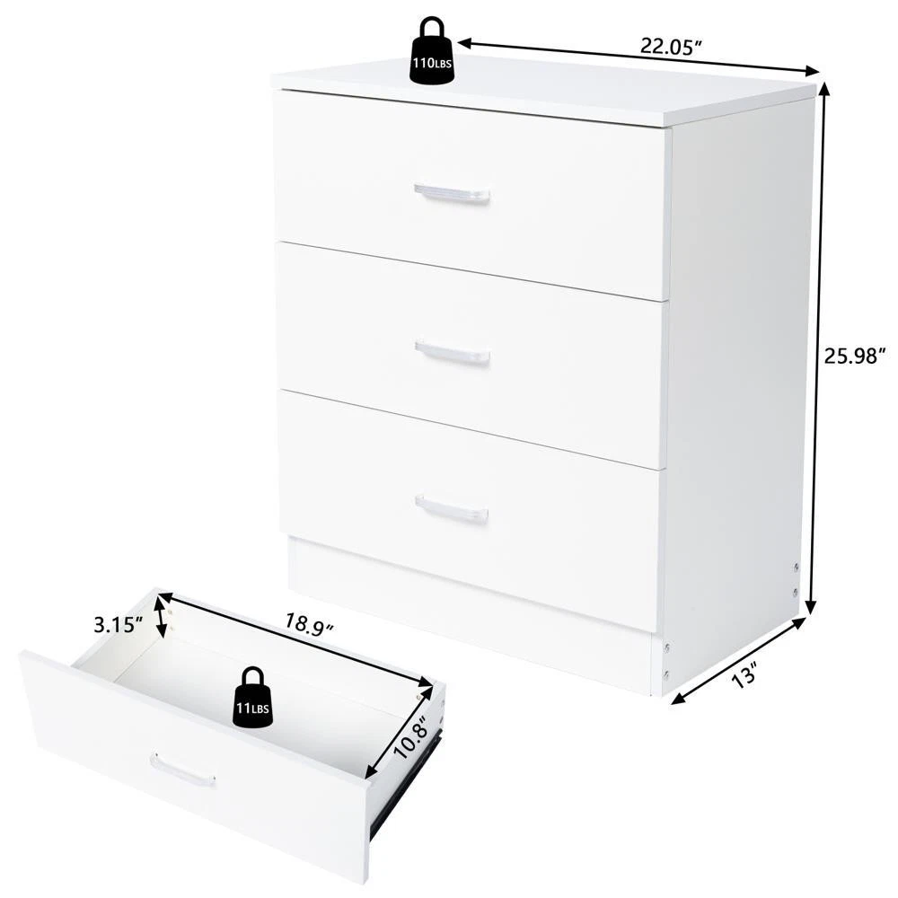 Room: Bedroom, Living Room Brand: FCH UPC: Does not apply Color: White Handle Type: Level Handle Department: Adults Assembly Required: Yes Item Height: 25.98 in Material: MDF Wood Item Length: 22 in Mounting: Free Standing Item Width: 13 in Additional Parts Required: No Type: Chest of Drawers Handle Finish: Stainless Steel Dimensions: (25.98 x 13 x 22.05)"(L x W x H) gtin13: Does not apply Style: Contemporary MPN: Does Not Apply Number of Drawers: 3 Pcs