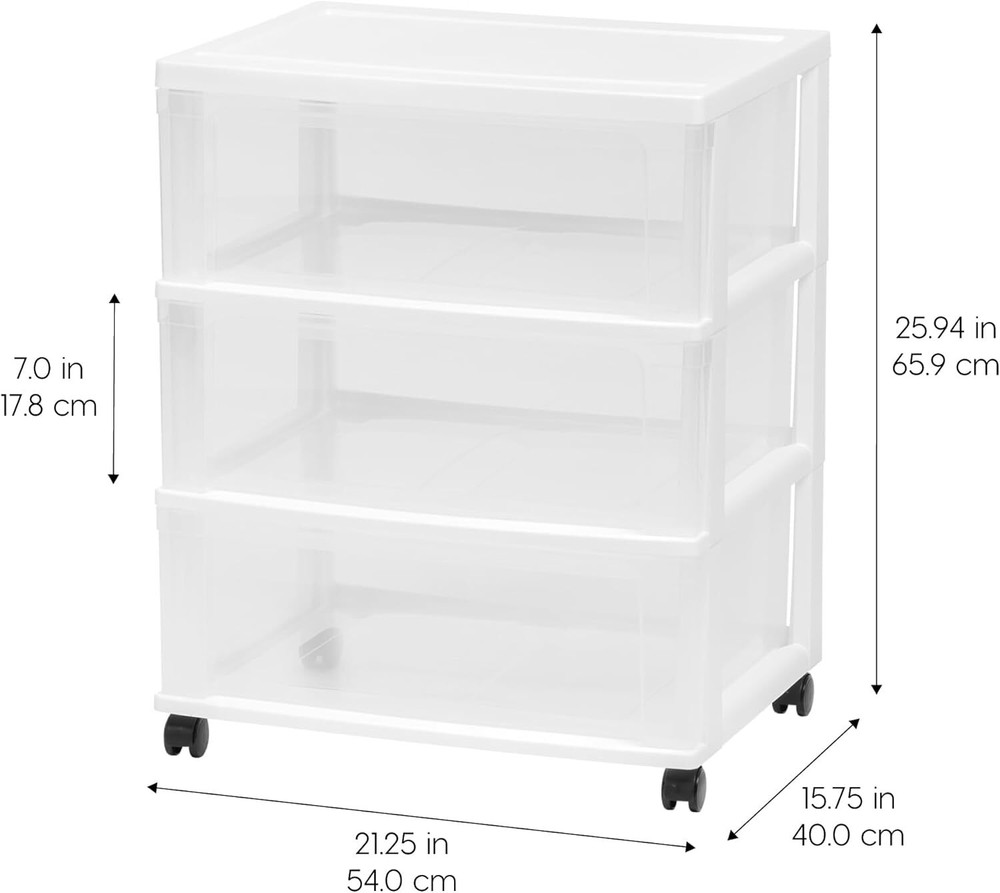About this item FOR EVERY SPACE - The IRIS USA plastic storage drawer offers the perfect storage solution for any room in the house. Use it in the bedroom, dorm, office, or school to store all types of items. Large enough to fit a variety of items from clothes to supplies, it's perfect for maintaining clutter-free classrooms, art studios, living spaces and workspaces. SPACIOUS ORGANIZATION - Features easy-pull drawers for quick access so your items are always within reach. The clear, durable drawers allow you to see inside so that you can quickly identify stored items and save time searching. STURDY AND STABLE - The drawer stops help prevent drawers from falling out or being removed accidentally while the deep drawers provide plenty of storage space for your everyday items, optimize space usage, and help organize all of your rooms. The drawers are also made from quality materials to ensure long-lasting storage solutions. EASY MOBILITY - The four swivel wheels let you easily move the drawer when needed and allow for 360° rotation, or if you decide to keep the drawer unit in one place, you can remove the casters for a stationary storage drawer. GREAT SIZE - Dimensions: 15.75"L x 21.25"W x 25.94"H User guide Required Assembly No Measurements Item Weight 8.23 Pounds Item Dimensions D x W x H 15.75"D x 21.25"W x 26.25"H Additional details Number of Drawers 3 Color White