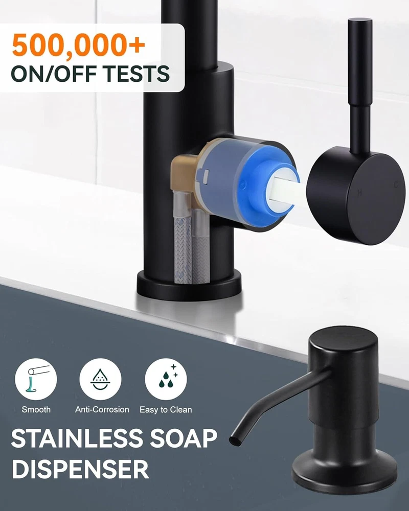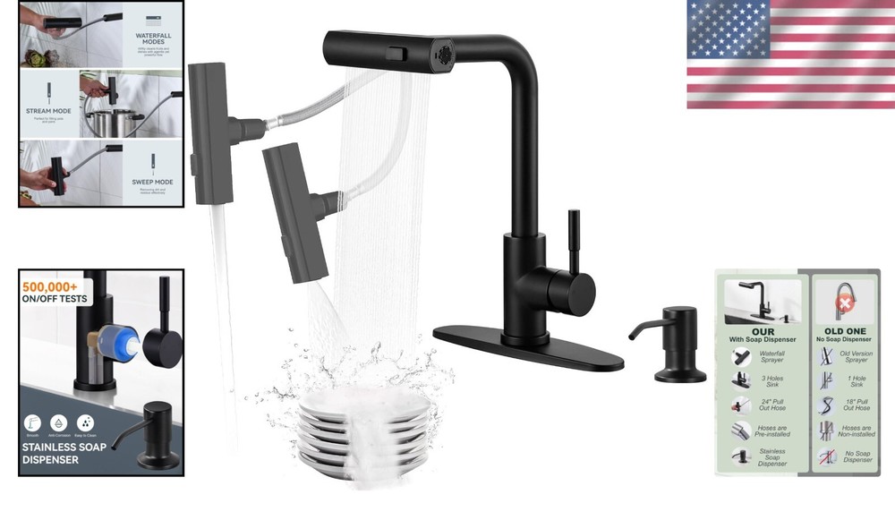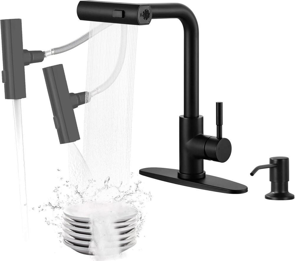 3-Function Black Kitchen Faucet with Built-In Soap Dispenser - Easy Install