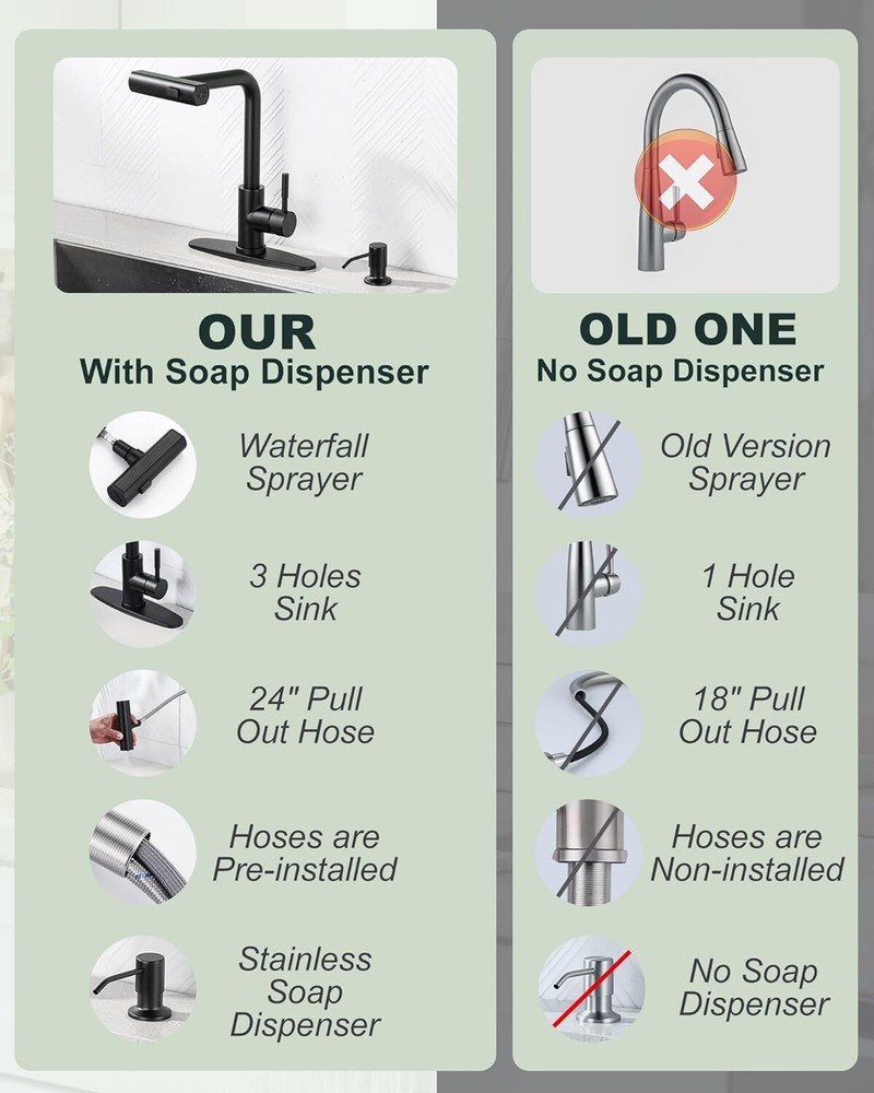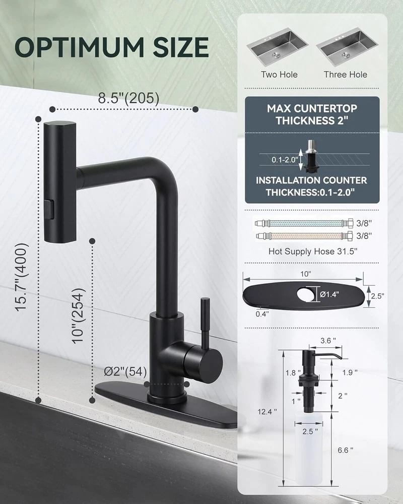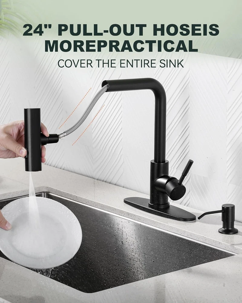 Faucet Hole Spacing: 3 Recommended Uses For Product: Kitchen Features: Pull-Out, Pull Down Sprayer, Soap Dispenser, 360 Swivel UPC: Does not apply Included Components: Deck Plate, Soap Dispenser, Instruction Manual Number Of Handles: 1 Item Weight: 5.19 Mounting Type: Deck Mount Faucet Mounting Type: Deck Mount Shape: Pull-Down Brand: Unbranded Installation Type: Single Hole Spout Height: 3.9 Inches Number of Faucet Holes: 3 Hole Count: 3 Handle Material: Stainless Steel Product Dimensions: 7.08"d X 5.51"w X 14.17"h Room: Kitchen Color: Black Batteries Included?: No Suitable For: Kitchen Sink gtin13: Does not apply Finish: Black Assembly Required: No Material: Stainless Steel Finish Type: Black Type: Kitchen Faucet Style: Modern Batteries Required?: No Items Included: Deck Plate, Soap Dispenser, Instruction Manual Is Electric: No Number of Faucet Handles: 1 Installation: Single Hole Handle Type: Lever