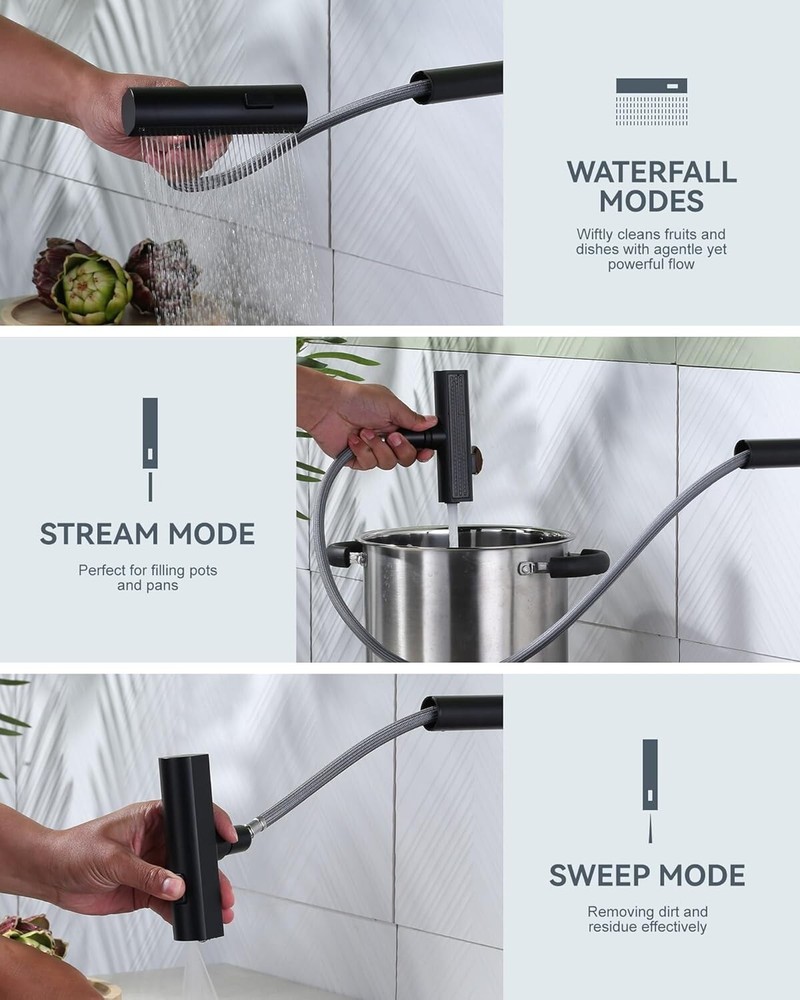 3-Function Black Kitchen Faucet with Soap Dispenser - Easy Installation Included ‹ › ‹ › ‹ › ‹ › ‹ › ‹ › ‹ › ‹ › ‹ › 3-Function Black Kitchen Faucet with Soap Dispenser Discover the elegance and functionality offered by our stunning 3-Function Black Kitchen Faucet with Soap Dispenser. This value-packed set combines two essential kitchen features into one sophisticated solution, enhancing both the efficiency and aesthetics of your kitchen. Features: Value-Packed Set: Save counter space and reduce clutter with this dual-function design. Innovative Waterfall Design: Delivers a powerful yet gentle stream of water, perfect for rinsing dishes and washing hands. 90° Rotating Spout: Effortlessly switch between spray modes with just a twist of the spout – from a focused stream for rinsing to a wider spray for cleaning. Durable Construction: Crafted with high-quality materials, this faucet and soap dispenser are built to withstand daily use. Enhanced Durability: Corrosion-resistant finishes help resist scratches, fingerprints, and water spots, ensuring lasting beauty and functionality. Effortless Operation: Smooth faucet levers and a perfectly calibrated soap dispenser make kitchen tasks efficient and enjoyable. Fit for Three-Hole Sinks: Easy installation with pre-installed hoses, compatible with single-hole and three-hole sinks. Customer Service Guarantee: Each unit undergoes rigorous testing to ensure quality; we offer a limited lifetime and dedicated customer support. Why choose our Kitchen Faucet? Transform your kitchen experience with our 3-Function Black Kitchen Faucet. Its innovative design not only elevates your kitchen's style but also streamlines your culinary tasks. Say goodbye to clutter and embrace a functional workspace that seamlessly blends elegance with efficiency. Enjoy effortless operation and peace of mind with our customer service guarantee, ensuring you receive only the best. Don't miss the opportunity to enhance your kitchen décor and functionality - order your 3-Function Black Kitchen Faucet with Soap Dispenser today! Shipping Free & Fast Shipping - We offer free shipping to most of the USA with a normal delivery time of 3-7 days. However, due to the current situation, additional delivery time (up to 3 weeks) may be required for some items. Alternative Carriers - We may use alternative carriers (e.g. USPS, FedEx, UPS, etc.) to ensure your package arrives safely and on time. Due to the use of multiple carriers, we are unable to provide a tracking number automatically. Handling Time - Orders are processed and shipped within 1-2 business days of receiving cleared payment. Shipping Restrictions - Shipping to Alaska, Hawaii, Puerto Rico, Guam, and other US territories may incur shipping charges or delivery restrictions. Please contact us before ordering, or your order can be refunded/cancelled. State Restrictions - There may be restrictions based on your state of purchase. For example, certain items may not be shipped to California due to state regulations. Contact for Tracking Updates - If you require tracking updates or have any concerns about the delivery of your order, please feel free to contact us, and we will be happy to assist you. Return 30-Day Hassle-Free Returns - We want you to be completely satisfied with your purchase. If you are not, you can return the item within 30 days of receiving it for a full refund or exchange. Easy Return Process - To start a return, simply contact us and we will provide you with a prepaid return shipping label and detailed instructions. Restocking Fee - There are no restocking fees for returns. However, the buyer is responsible for return shipping costs if the return is not due to a seller's error. Refund Processing Time - Refunds will be processed within 5 business days of receiving the returned item in its condition. Payment We accept all major credit cards, PayPal, and Apple Pay for your convenience. Your payment information is secure and encrypted to ensure a safe and seamless transaction. Please complete your payment within 3 days of purchase to avoid any delays in shipping. Feedback Your feedback is extremely important to us. We strive to provide the best products and customer service possible. If you are satisfied with your purchase, please take a moment to leave us a positive review. If you have any concerns or issues with your order, please contact us before leaving negative feedback. We are committed to resolving any problems and ensuring your satisfaction. Contact Us If you have any questions or concerns, please feel free to out to our customer support team. You can contact us through the eBay messaging system. We are available Monday to Friday, 9:00 am to 5:00 pm EST, and we will do our best to respond to your inquiry within 24 hours. Buy it now and enjoy a pleasant shopping experience! Item Weight: 5.19 Unit Quantity: 1 Material: Stainless Steel Suitable For: Kitchen Sink Features: Pull-Out,Pull Down Sprayer,Soap Dispenser,360 Swivel Room: Kitchen Items Included: Instruction Manual,Deck Plate,Soap Dispenser Type: Kitchen Faucet Finish: Black Number of Faucet Holes: 3 Color: Black Number of Faucet Handles: 1 Handle Type: Lever Faucet Mounting Type: Deck Mount Shape: Pull-Down Installation: Single Hole Faucet Hole Spacing: 3 Spout Height: 3.9 Inches Style: Modern Unit Type: lb