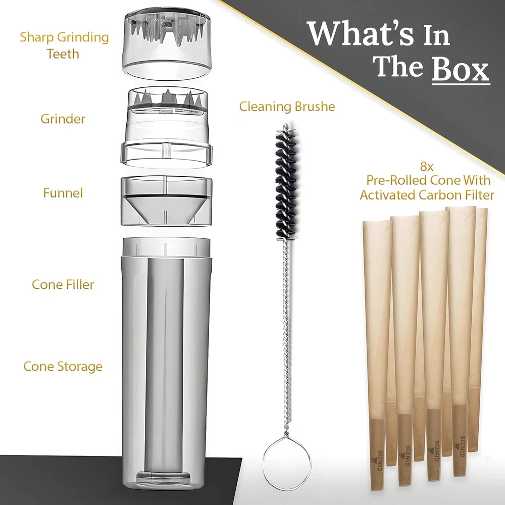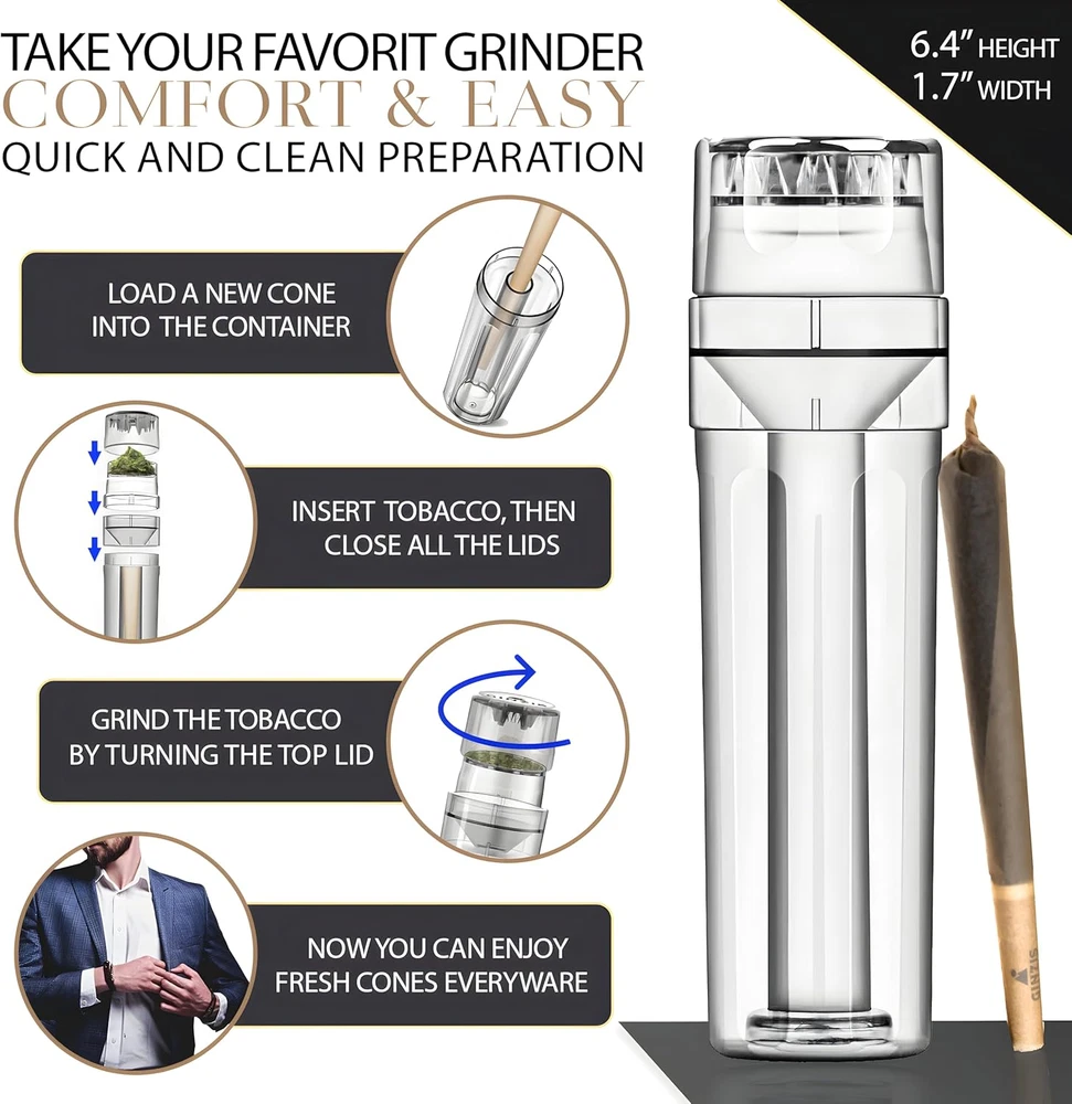 Effortless Herb Preparation - Streamline your herb preparation with our cone roller tool. This all-in-one solution combines a cone loader, grinder roller, and herb grinder into a portable and efficient piece. Precision at Your Fingertips - Experience precision like never before with our cone packer. This innovative device simplifies your grinding and filling process, helping you achieve the ideal consistency. Enhanced Experience - Elevate your rituals with our grinder roll pack, tailored for enthusiasts seeking premium quality. We included 8 carbon-filtered pre-rolled cones, enhancing your experience with a smoother, cleaner inhale. Compact & Portable - Designed for convenience, our cone packing tool is portable and ready to go wherever you are. Enjoy your herbs on the move without compromising on quality. Reimagine Your Herbal Rituals - Join the ranks of discerning users who want more from their essentials. Redefine your herbal rituals and enjoy first-class by clicking 'Add to Cart' now Product Description