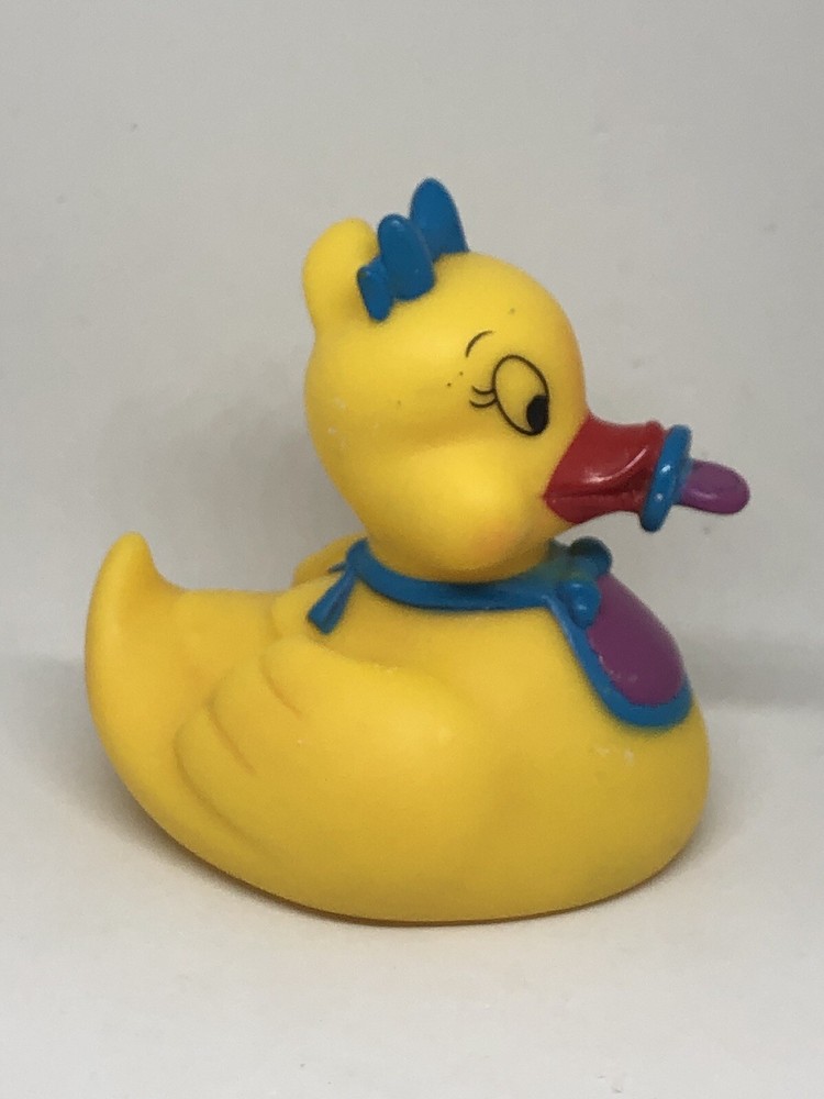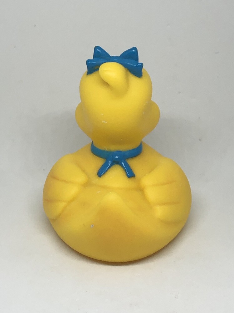 This adorable rubber duck with a pacifier bib and blue bow is the perfect addition to any duck collection. Measuring at about 3 inches. The duck is made by Assurance and is recommended for children ages 3 and up. The toy is part of the Rubber Duck character family and is a classic toy it is made of a hard rubber. Note: Item has marks/scratches/wear; shown in photos! Thank you for stopping by!