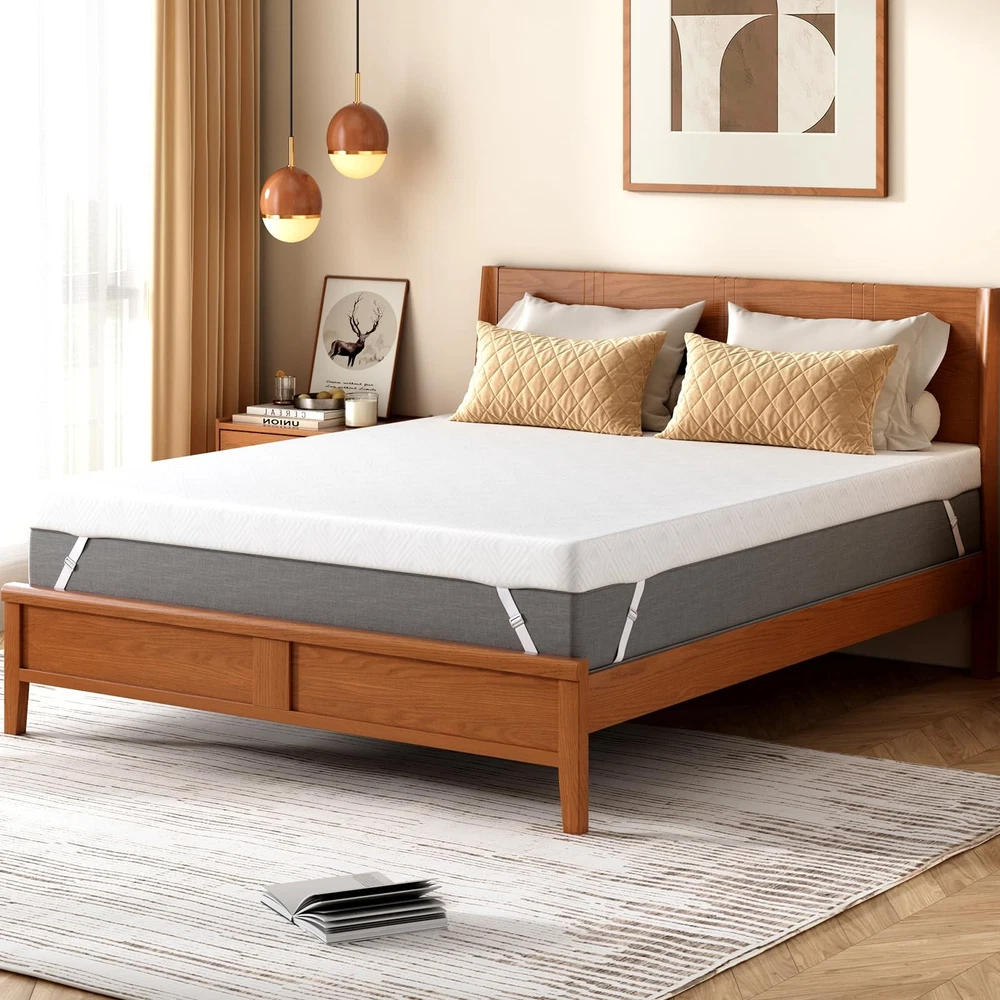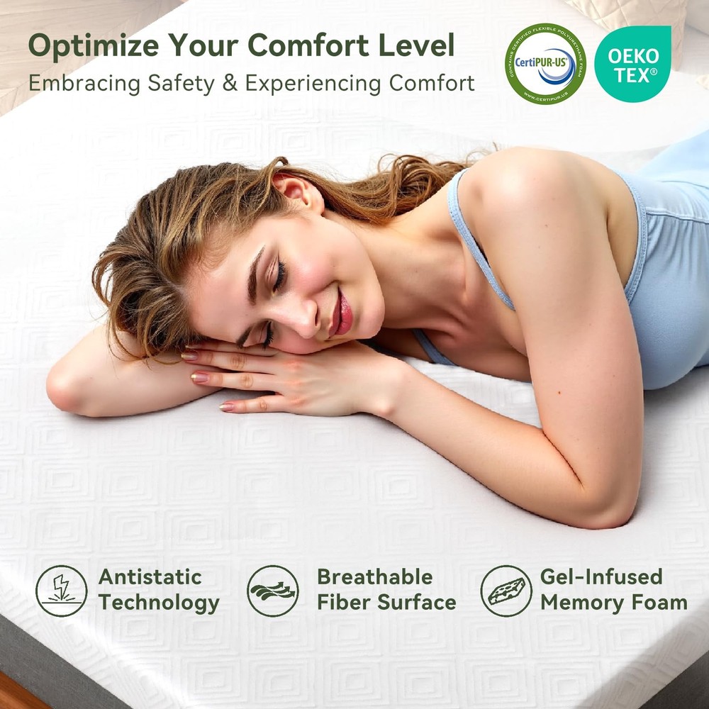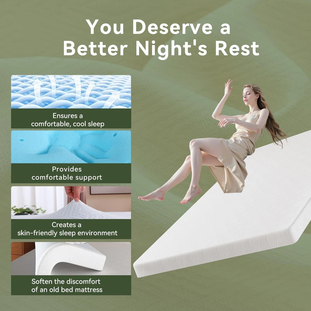 Elevate your sleep quality with our 3-inch king mattress topper with cover. Enhance your sleep experience with this 3-inch mattress topper with a cover, designed to offer exceptional comfort and sustainability. This memory foam mattress topper combines softness and durability. Known for its breathability and moisture-wicking properties, 30% medium molecular PE creates a cool and comfortable sleeping environment all night long. This mattress topper features high-density memory foam that precisely conforms to your body's contours, offering exceptional support and comfort. The memory foam effectively distributes body weight evenly, alleviating pressure points and ensuring you enjoy deep, restful sleep every night. The included cover is made from breathable materials, which further enhances the comfort of the topper. It is removable and easy to clean, ensuring that your mattress topper stays fresh and hygienic. Available in a variety of sizes, including twin, twin XL, full, queen, and king, this mattress topper meets the needs of diverse households and individuals. Compressed and packaged for your convenience, this topper is easy to transport and set up. Choose this mattress topper to enjoy peaceful and comfortable nights while experiencing the exceptional comfort . [CertiPUR-US Certified] - Transform your sleep sanctuary with our 3-inch king memory foam mattress Topper – certified by CertiPUR US and Oeko-Tex Standard 100 for unrivaled safety and durability. The king mattress topper is made of premium and safe material with no harmful substances, skin-friendly and safe for all people, including pregnant and kids. Unbox a healthy and blissful sleep experience! [Premium King Mattress Topper] - The infusion of cooling gel, combined with aviation grade ventilation holes, allowing for heat capture and dissipation to ensure your sleep comfortably cool. Additionally, The high-density king memory foam mattress topper contours to your body shape, providing comfort support for your spine, alleviating joint pain and preventing sinking into the foam. The king mattress topper cover features 35% elastic and breathable Bamboo fibers that are static-resistant and skin-friendly, creating a healthy and comfortable sleep environment for you [Anti-Slip & Washable Topper Cover] - Our 3 in king mattress topper enhanced by specially designed adjustment strap for mattress up to 14" deep and anti-slip silicone points, which ensure a secure fit for the mattress. The L-shaped zipper closure allows for easy removal and washing, providing a layer of environment-friendly and elegant protection for your mattress [Soft Your Mattress] - The 3-inch king mattress topper softens the discomfort of an old bed, offering a cost-effective solution for extending the lifespan of your mattress. Featuring high density memory foam, king mattress topper provides a perfect balance of softness and support for a cloud-like sleep experience. Easily attach the topper to the mattress in your bedroom, guest room, RV, or college dorm [Usage Instructions] - The king mattress topper is vacuum packed for convenient delivery. Before use, please unzip the cover and wait for the mattress to expand for 48 hours. Any questions and suggestions, please feel free to tell our after-sales team, we will provide you with solutions within 24H! All toppers come with a 30-day full money-back guarantee and are supported by our 3-year warranty against manufacturing defects, you can trust in the quality and durability of the product