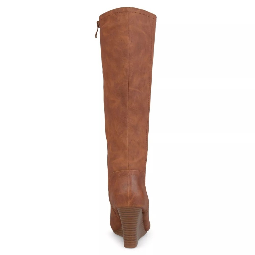 Color: Brown Platform Height: 1 in Department: Women Seller Notes: “Heel Height:3-inch Heel Type: Wedge Platform Height:1-inch Shaft Height:15 1/2 i” Type: Boot Toe Shape: Round Toe Heel Style: Wedge Style: Platform Occasion: Business, Casual, Christening, Formal, Party/Cocktail, Travel US Shoe Size: 9 Brand: Journey & Crew Insole Material: Faux Leather over Synthetic Upper Material: Faux Leather over Synthetic