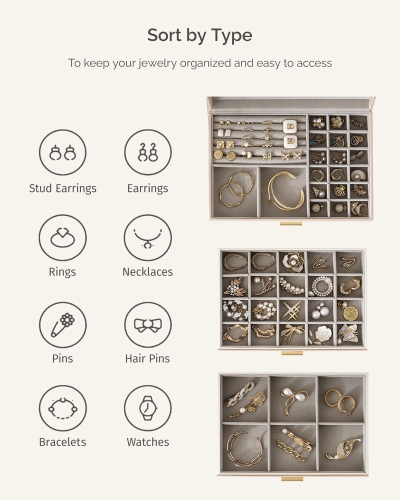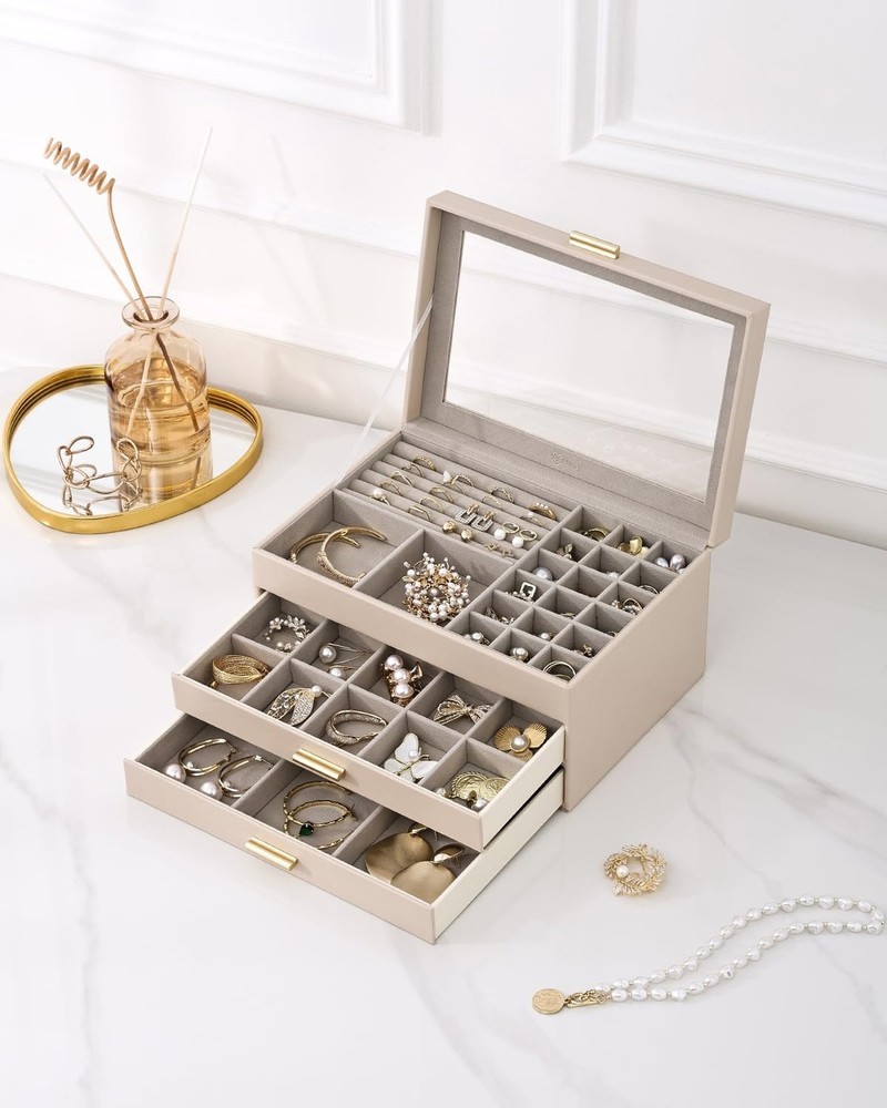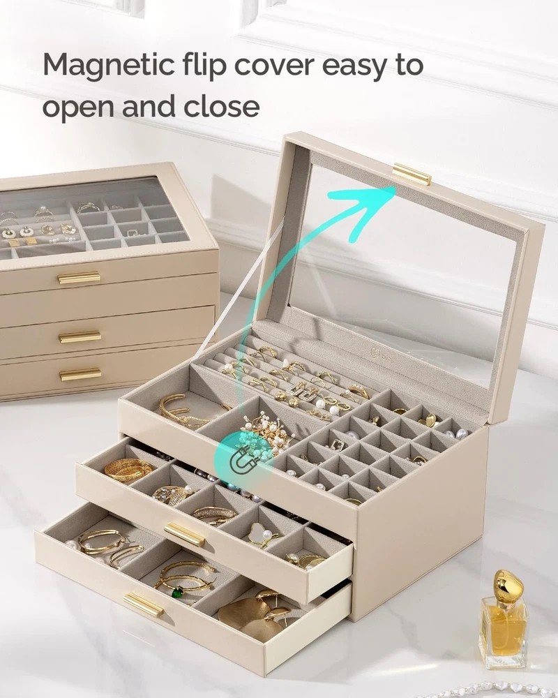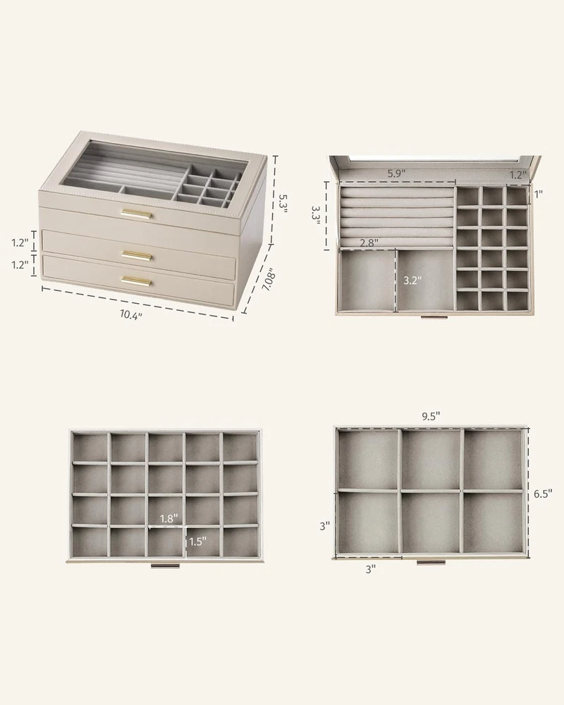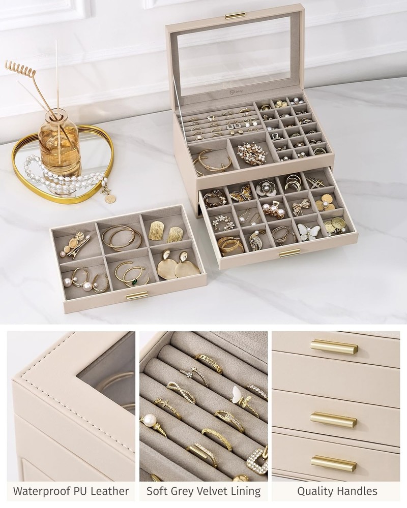 3-Layer Jewelry Box, Clear Lid Jewelry Organizer with 2 Drawers for Necklace Earrings Rings Bracelet Storage, Jewelry Display Box for Women, Beige - Buy Now with Fast Shipping! 3-Layer Jewelry Box, Clear Lid Jewelry Organizer with 2 Drawers for Necklace Earrings Rings Bracelet Storage, Jewelry Display Box for Women, Beige Product Details Color: Beige Brand: BIQI MUSSE Material: Faux Leather Style: Modern Special Feature: Waterproof, Adjustable Recommended Uses For Product: Necklace, Bracelet, Ring, Watch, Earring, Bangle Product Dimensions: 10.4"D x 7.08"W x 5.3"H Target Audience: Women Shape: Rectangular Number of Drawers: 2 Color: Beige Brand: BIQI MUSSE Material: Faux Leather Style: Modern Special Feature: Waterproof, Adjustable Recommended Uses For Product: Necklace, Bracelet, Ring, Watch, Earring, Bangle Product Dimensions: 10.4"D x 7.08"W x 5.3"H Target Audience: Women Shape: Rectangular Number of Drawers: 2 Jewelry Storage Type: Jewelry Box Occasion: Mother's Day, Wedding, Christmas, New Year, Valentine's Day Mounting Type: Table Top Item Weight: 3.28 pounds Country of Origin: China Special Features: Waterproof, Adjustable Batteries Included?: No Batteries Required?: No Date First Available: December 5, 2024 Key Features ✅ Transparent Lid for Easy Viewing: Featuring a clear transparent cover, this jewelry storage box allows you to quickly identify and access your favorite pieces without having to open. The transparent design not only enhances visibility but also adds a touch of elegance to your dresser ✅ Three Spacious Layers for Jewelry Organization: Three layers with different sized compartments, our jewelry box provides ample space to separate and store various type of jewelry, from delicate necklaces and bracelets to earrings and rings. All layered design ensures that each item has its rightful place, preventing tangling and damage ✅ Exquisite Craftsmanship: Jewelry box made of sturdy and stylish PU leather, protects your valuables from dust and scratches, equipped with a special interior grey lining that effectively combats oxidation, our jewelry box safeguards your silver, gold, and other metal pieces from tarnishing. This unique feature ensures your jewelry retains its shine and original over time ✅ Overall Dimensions: Jewelry organizer measures 10.4L*7.08W*5.3H inch. This 3-layer jewelry box offers a stylish and functional way to keep your precious jewelry safe, also ensures your jewelry retains its original shine ✅ Perfect Gift Choice: Beautifully packaged, this jewelry holder organizer box makes a wonderful gift for any occasion. Its timeless design and practical functionality make it a cherished addition to any jewelry collection, perfect gift for your loved ones on Valentine's Day, Christmas or New Year Product Description