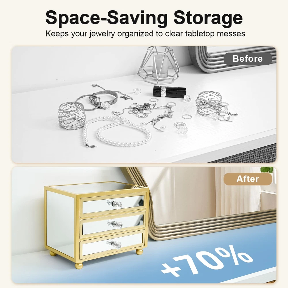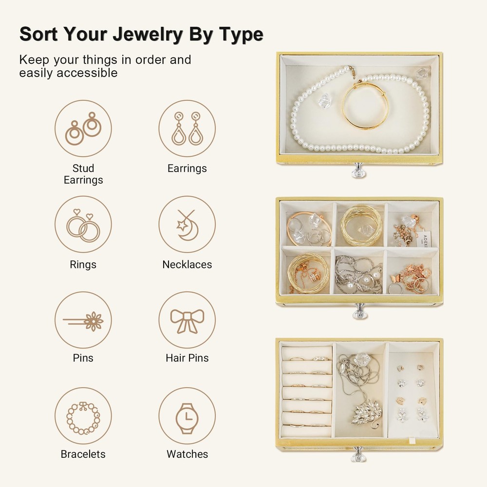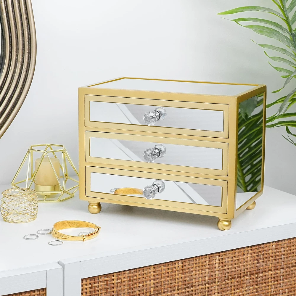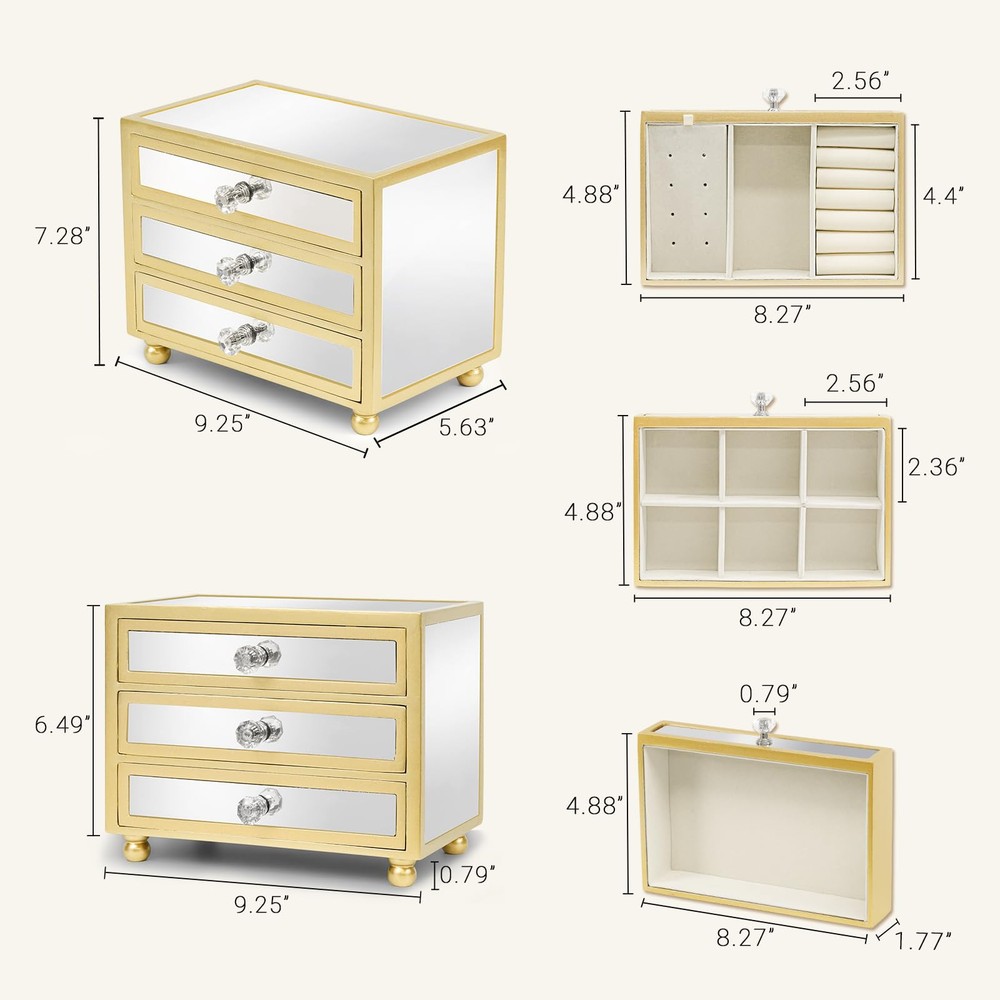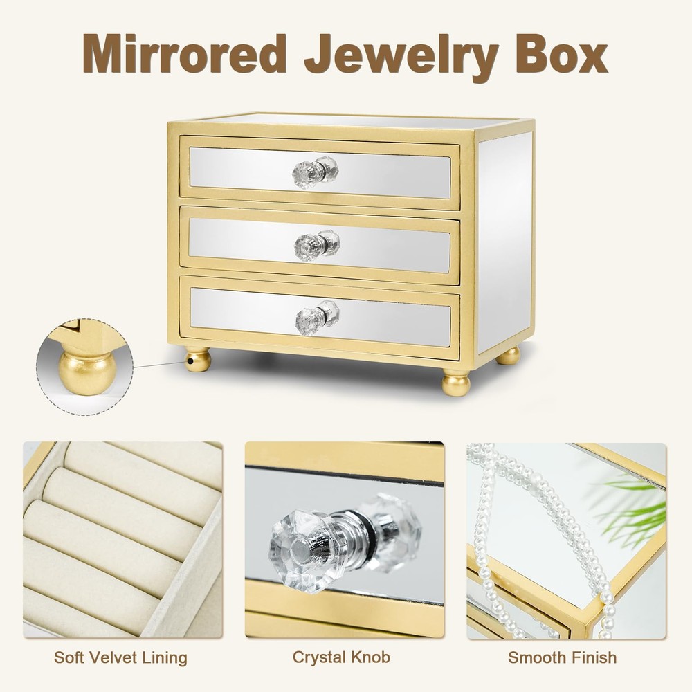 3-Layer Large Capacity:Comes with 3 drawers that slide out smoothly. The first tier has 4 storage areas, suitable for rings, earrings, pendants, bracelets, cufflinks, mini beads, bangles. The second tier has 6 removable slots for bracelet necklaces and pendants, and the third tier is empty for storing large jewelry, glasses, watches, hairpins and more. Chic & Durable:This unique gold jewelry box measures 9.25"*4.4"*7.28".The exterior is made of glass mirror, which is stain-resistant, water-resistant, non-deformable and easy to clean. The inner lining is wrapped in durable soft velvet and sturdy MDF to provide all-around protection for your jewelry, with elegant and delicate crystal handles for easy opening and closing. Meet all the requirements of daily jewelry storage Elegant Appearance:This jewelry box has a unique mirror look and crystal handles, which makes it look more elegant and beautiful, the bottom comes with a solid wood base to make the jewelry box more stable and exquisite. Close the box, it can be a very exquisite accessory on your dresser, desk, modern and meaningful decorative design is perfect for home decoration or office display, wedding ceremony, birthday party, etc. Open the box, it can be used to store your jewelry. Versatile Use:This modern jewelry holder looks nice whether displayed on the dresser of your bedroom or your checkroom.The jewelry box can be used not only as a girl's jewelry box, ring organizer, necklace organizer, earring box organizer, but also as a bracelet gift box. Best Gift Choice:Surprise your loved one with this original design jewelry box as a birthday gift or anniversary gift! Or, treat yourself with this beautiful jewelry box - you deserve it!