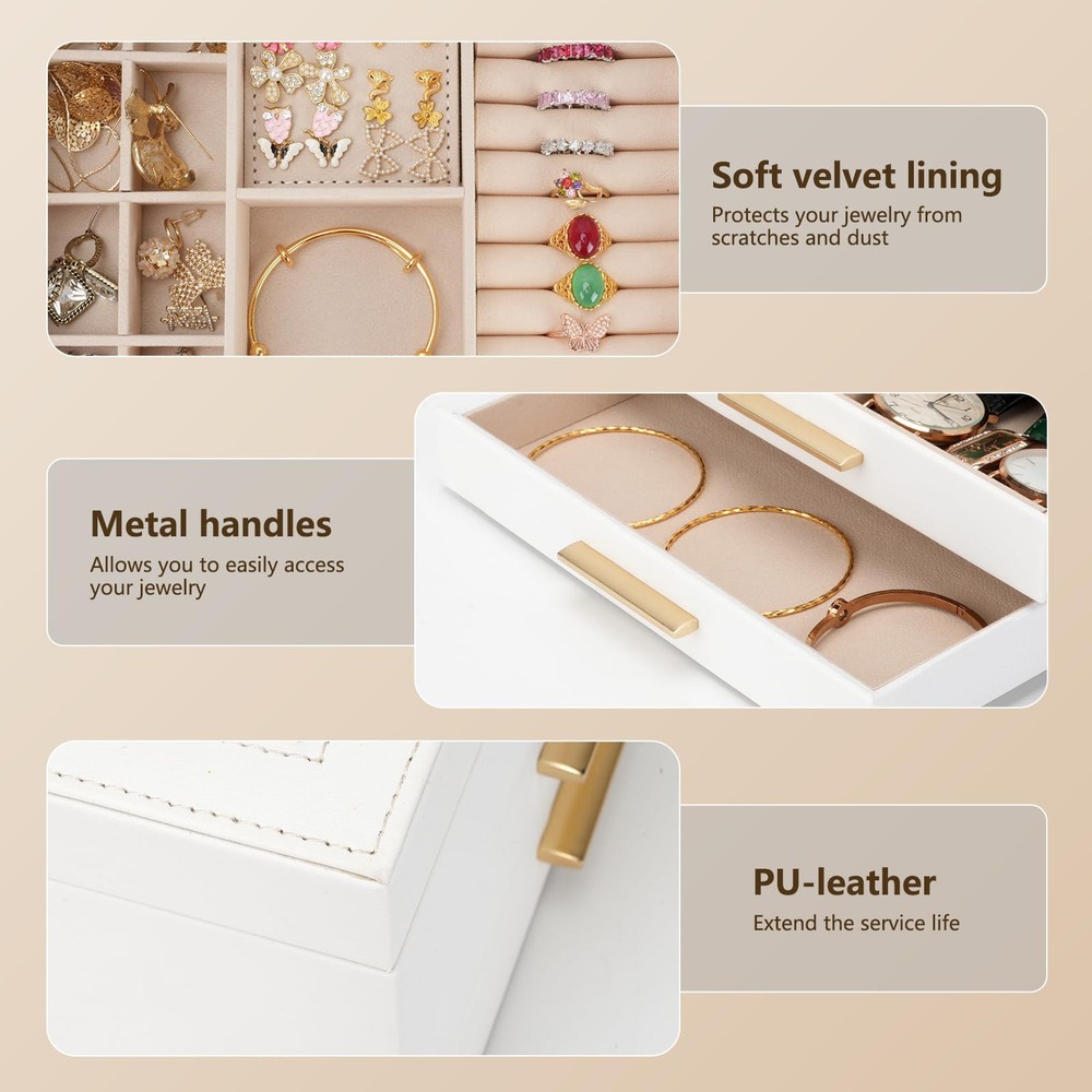 【Large Clear Lid for Easy Access】 – Showcase your favorite pieces under the clear glass lid of this jewelry organizer for women, making it effortless to find your treasures at a glance. This 3-layer jewelry box features three spacious drawers, multiple compartments, and elegant gold hardware for smooth access. 【Durable Material & Elegant Design】 – Crafted with premium PU leather, a soft velvet lining, and a flannel interior, this womens jewelry box is as durable as it is stylish. It’s shockproof and pressure-resistant, ensuring your valuable pieces stay safe. DIMENSIONS: 9.05" x 7.67" x 5.31". 【Versatile Jewelry Storage Solution】 – Perfect for organizing all your accessories, this jewelry box for women fits seamlessly on your bedroom dresser or closet shelf. Whether you need jewelry boxes & organizers for necklaces, earrings, or bracelets, this chic jewelry storage solution handles it all. 【Thoughtfully Designed Compartments】 – Rings fit snugly in the slots, earrings in small cubes, and necklaces in narrow compartments. With its practical layout, this jewlry box ensures every piece has its place, keeping everything tidy and easy to find. 【Perfect Gift for Any Occasion】 – This jewlery box is the ideal gift for women, from mothers to daughters and wives. With its modern design and included gift card, it’s ready to impress for birthdays, anniversaries, or any celebration.