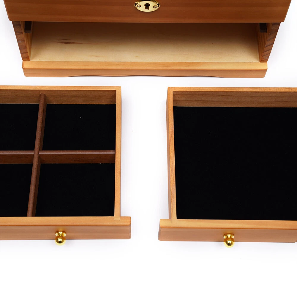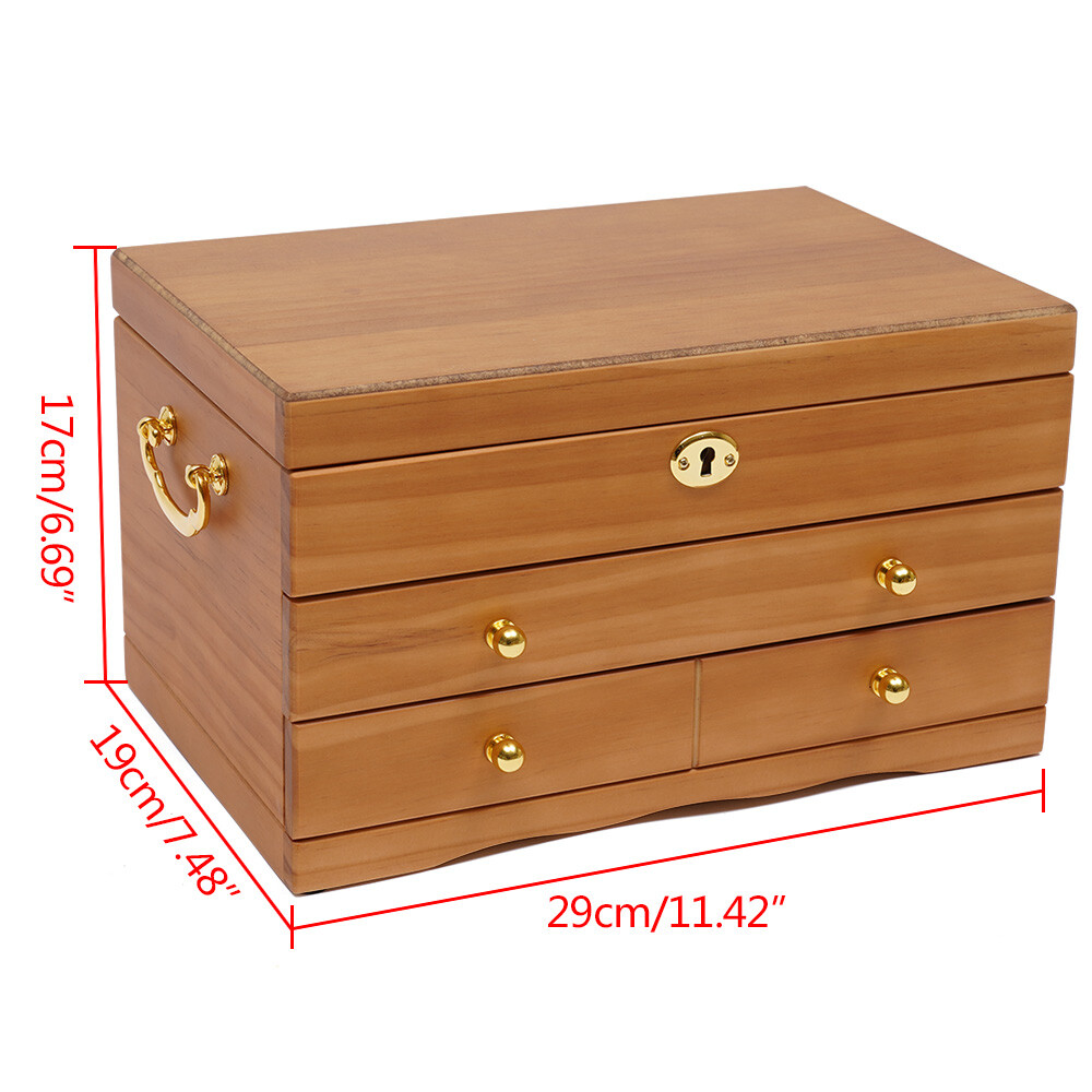 3-Layer Large Retro Wooden Brown Jewelry Box w/ Safe Lock Storage Organizer Rack