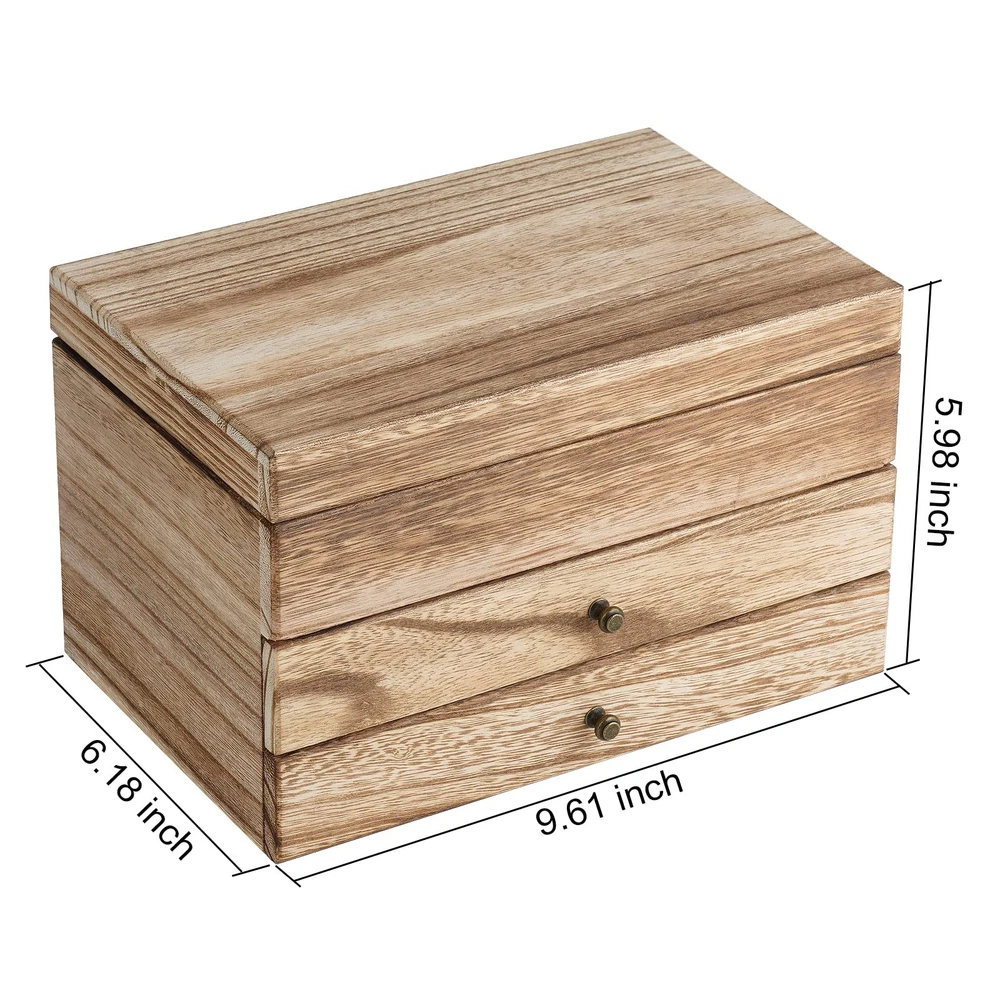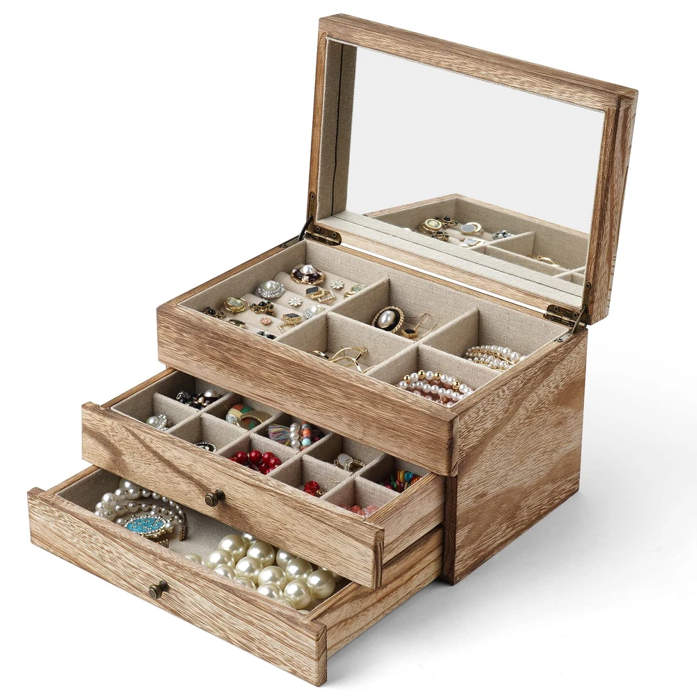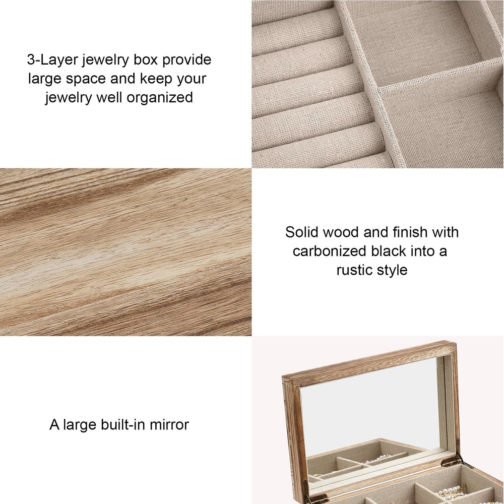 CLASSIC JEWELRY BOX: Jewelry organizer box is made of solid wood and finish with carbonized black into a rustic style, sturdy and durable to stand heavy jewelry cosmetics. Linen cloth-covered inside keeps your jewelry well against dust, scratches, damages. Metal delicate handle highlights retro beauty. Any detail is specially designed for organizing jewelry. MULTIFUNCTIONAL JEWELRY ORGANIZER: 3-Layer jewelry box provide large space and keep your jewelry well organized, 5 divided compartment and a big pull-out drawer jewelry box, multiple compartments for storing rings, earrings, studs, necklace, brooches, watches and other keepsakes.This beautiful Jewelry Organizer is perfect for eliminating cluttering and tangling. COMPACT & GENEROUS DESIGN: This jewelry box with 3- Layer design, make reasonable use of jewelry space via your habit or interest, create large capacity and different layout. The large mirror in the heart of the jewelry box helps you save valuable time in the morning before leaving for a long day's work. IDEAL GIFT FOR LOVED ONE: Whoever your Loved one's Mom, Wife, Daughter, or Girlfriend for Valentine's Day, Birthday, Mothers' day, Christmas, Anniversary Day, or Wedding. jewelry box is a ideal choice. we can be sure this will be the most practical and memorable gift they have ever received. SATISFACTION SERVICE: Portable jewelry case is a breeze to pack and sits beautifully on your dresser, nightstand, bathroom counter or vanity, saves lots space to make your room looking more neatly. In case any problem or you are not satisfied, please tell us without hesitation.