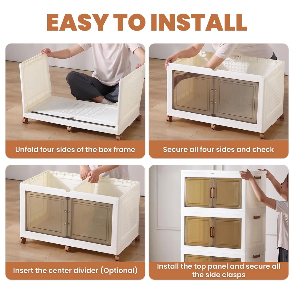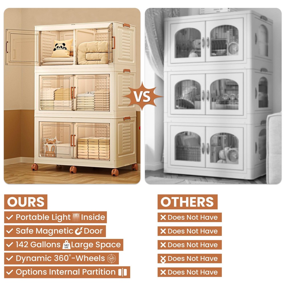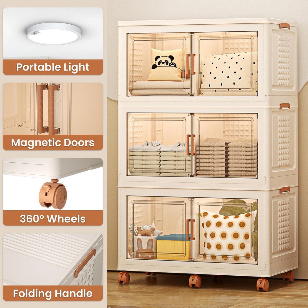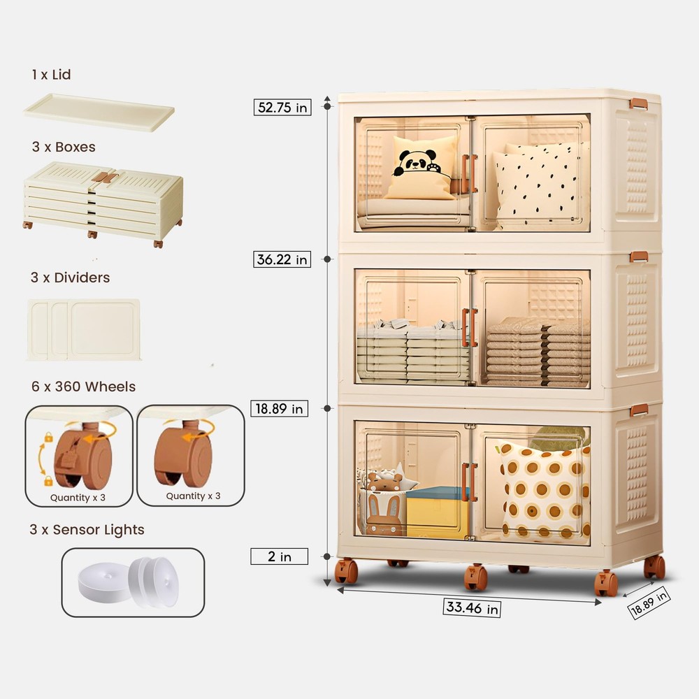 Big-MAC bins are made from polypropylene plastic (PP) with 33.46 x 18.89 x 18.89 dimensions. These lids accumulate 47 gallons of space which can be used for storing clothes, towels, books, shoes, toys, stationery, glass, food items, etc. Also, these bins can be useful for sustaining pressure of 50 lbs. and direct force to keep the items safe from harm. Still the bins are very light-weight and can be carried with hands particularly when they are empty. You can easily move it around the available space through its 360 wheels which can be attached and removed as per the need. Moreover, since the bins can be stacked in the form of layers to achieve the intended experience, usage, and available space, these can be stacked in the required format. Moreover, these bins are collapsible and expandable. These can be easily expanded and folded as per the need. When you do not need to use them fold and store them under the bed, stairs, or any other location for safekeeping without worrying. These are easy to carry due to the foldable handles on both sides. While on the front the magnetic closure double doors keep the bins and the items placed inside safe. [๐ฆ๐๐ถ๐๐ฎ๐ฏ๐น๐ฒ ๐ณ๐ผ๐ฟ ๐๐ป๐ฑ๐ผ๐ผ๐ฟ๐/๐ข๐๐๐ฑ๐ผ๐ผ๐ฟ๐] Collapsible storage bins are perfect for organizing indoor spaces like bedrooms, kitchens, and living rooms, or outdoor areas like patios and garages. Suitable for both indoors and outdoors. [๐ ๐ผ๐๐ถ๐ผ๐ป-๐ฆ๐ฒ๐ป๐๐ผ๐ฟ ๐๐ถ๐ด๐ต๐๐ถ๐ป๐ด] Equipped with active sensor body lights for effortless visibility, even in low-light conditions. [๐๐ญ๐๐๐ค๐๐๐ฅ๐ & ๐๐ฑ๐ฉ๐๐ง๐๐๐๐ฅ๐ ๐๐๐ฌ๐ข๐ ๐ง] The bins can be stacked as layers one over the other for space management during usage. These are safe for stacking over one another and stay stable in the face of jerks. Stacking them can take the form of a wardrobe or bookcase for concerned roles. While the bins can be added with wheels which makes them move despite the weight of the 3 layers and items inside them. [๐ ๐จ๐ฅ๐๐๐๐ฅ๐ & ๐๐จ๐จ๐ฅ-๐๐๐ฌ๐ฌ ๐๐ง๐ฌ๐ญ๐๐ฅ๐ฅ๐๐ญ๐ข๐จ๐ง] These are good with storage as well as usage. The bins can be folded when idle to manage space. The foldable designs of these Big-MAC make it easier to fold them into flat panels just like expanding them. The same can be done when you need to use them. This takes very little amount of time for either of the both outcomes. [๐๐ก๐ ๐๐ง๐ฅ๐ฒ ๐๐ญ๐จ๐ซ๐๐ ๐ ๐๐๐๐ข๐ง๐๐ญ ๐๐จ๐ฎ'๐ฅ๐ฅ ๐๐ฏ๐๐ซ ๐๐๐๐ ๐๐จ ๐๐ฎ๐ฒ] Our stackable storage cabinet blends classic style with practical use. Made with great care and skill in the USA, it features excellent craftsmanship. Plus, it comes with a hassle-free return policy for your peace of mind.