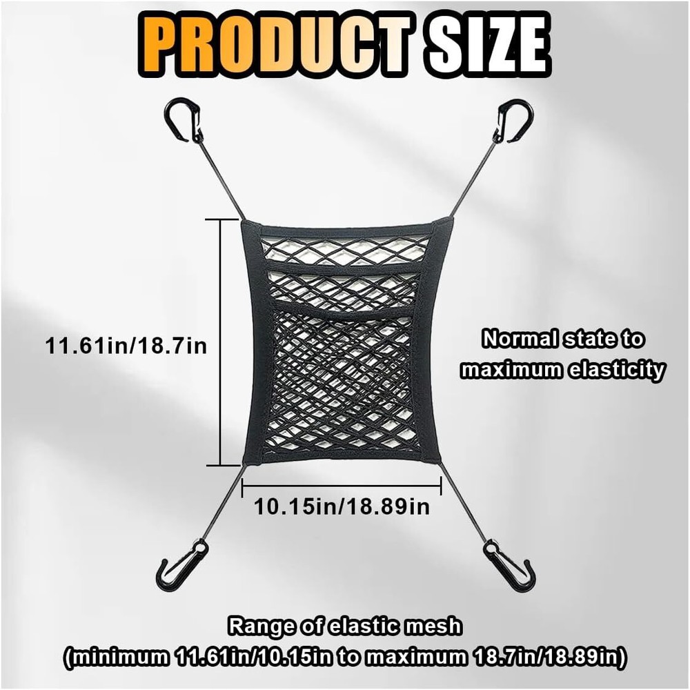 【Reliable Material】:The car backrest net bag is made of high-quality polypropylene fiber material, wear-resistant and dirt-resistant, the mesh surface is highly elastic and stretchable, pulling is not easy to deform, to meet your storage needs, can be used as a must-have item when you are traveling by car. 【Safe Driving】:The car mesh pocket can be used as a barrier between the front and back seats of your car to keep pets or children out of the back seat area, reducing their interference and protecting your driving safety. 【Easy to Install】:The car net organizer bag comes with four high-quality hooks, simply hang the four hooks on the appropriate positions on each side of the seat. Note: After installation, please check whether the fixing position is firm or not, so as not to fall off and cause damage. 【Widely Applications】:Fits most cars, trucks, SUVs and other vehicles with headrest bars. The car mesh pockets can hold most medium-sized items such as cell phones, wallets, rainwater, paper towels, etc. It is a great help for you to store and organize your items. Note: Not suitable for storing items larger, heavier or smaller than the mesh pockets. 【Size of Organizer】:Includes 1 car net organizer. Size is approximately 10.15×11.61 inches and stretches to 16.53×15.74 inches (with two pockets), which meets the needs of most cars. Note: Before purchasing, please make sure the length of the mesh bag matches your vehicle.